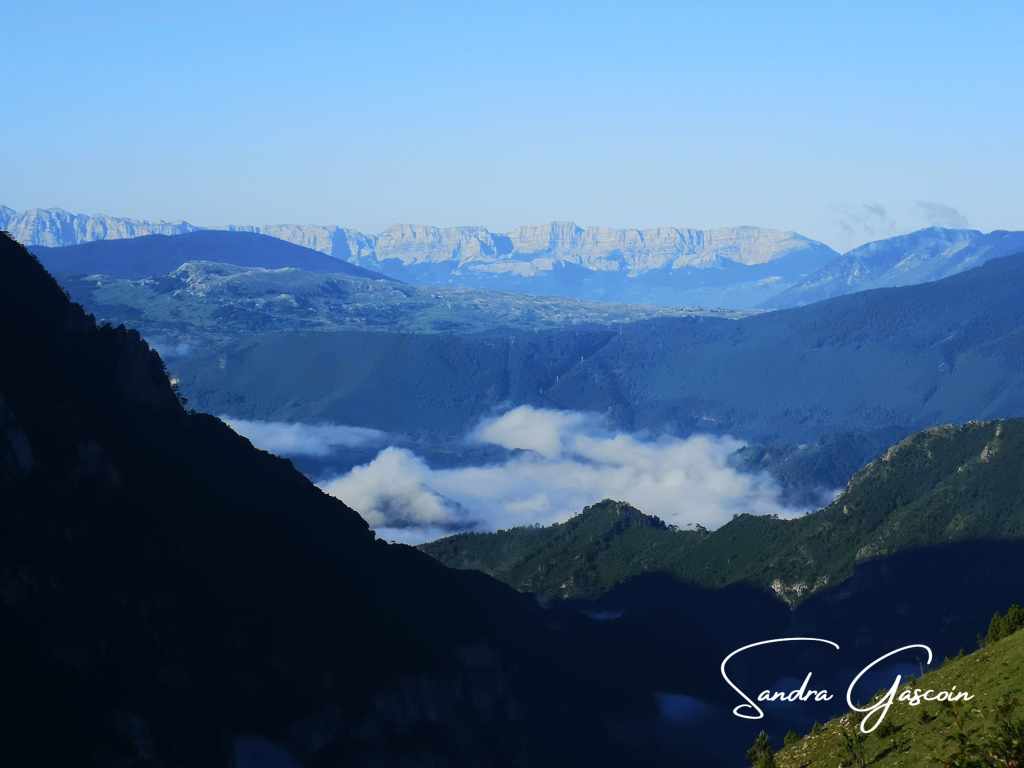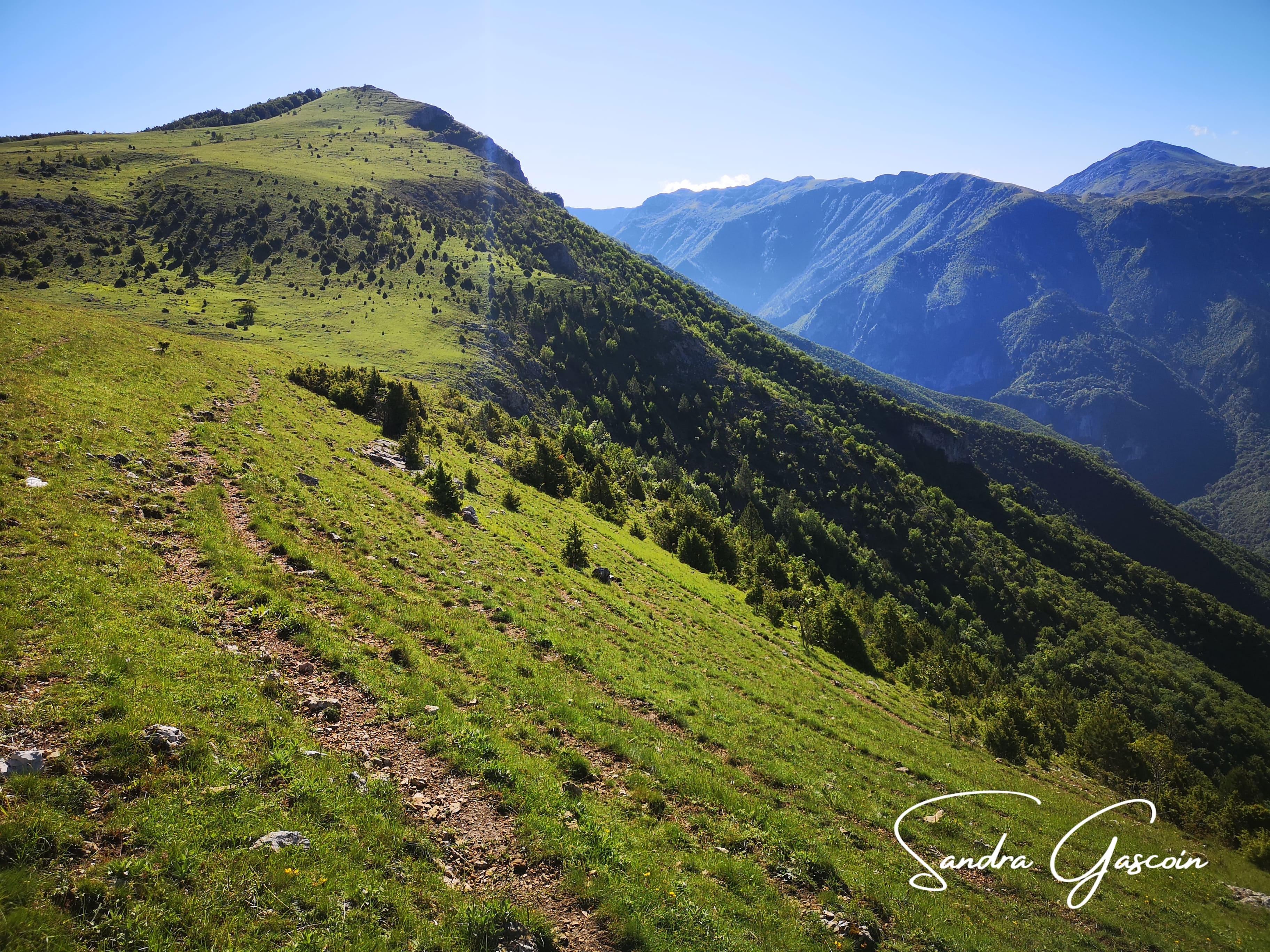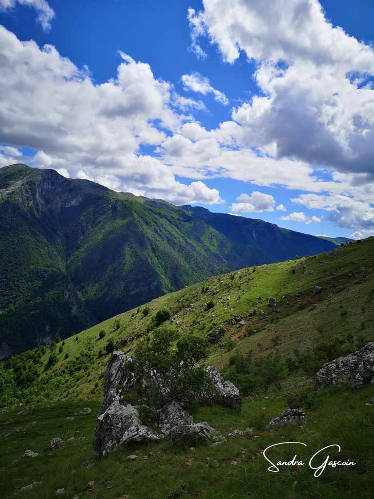 Je remonte le flanc de la montagne à pic, comme un escalier et rejoins le sentier qui finalement est bien marqué, c’est juste moi qui ai encore du caca dans les yeux et n’ai pas vu tous les points blancs cerclés de rouge. À partir de là, je ne perds plus le chemin. Il suit donc la ligne de crête et passe par les petits sommets qui culminent à 1500 mètres maximum.