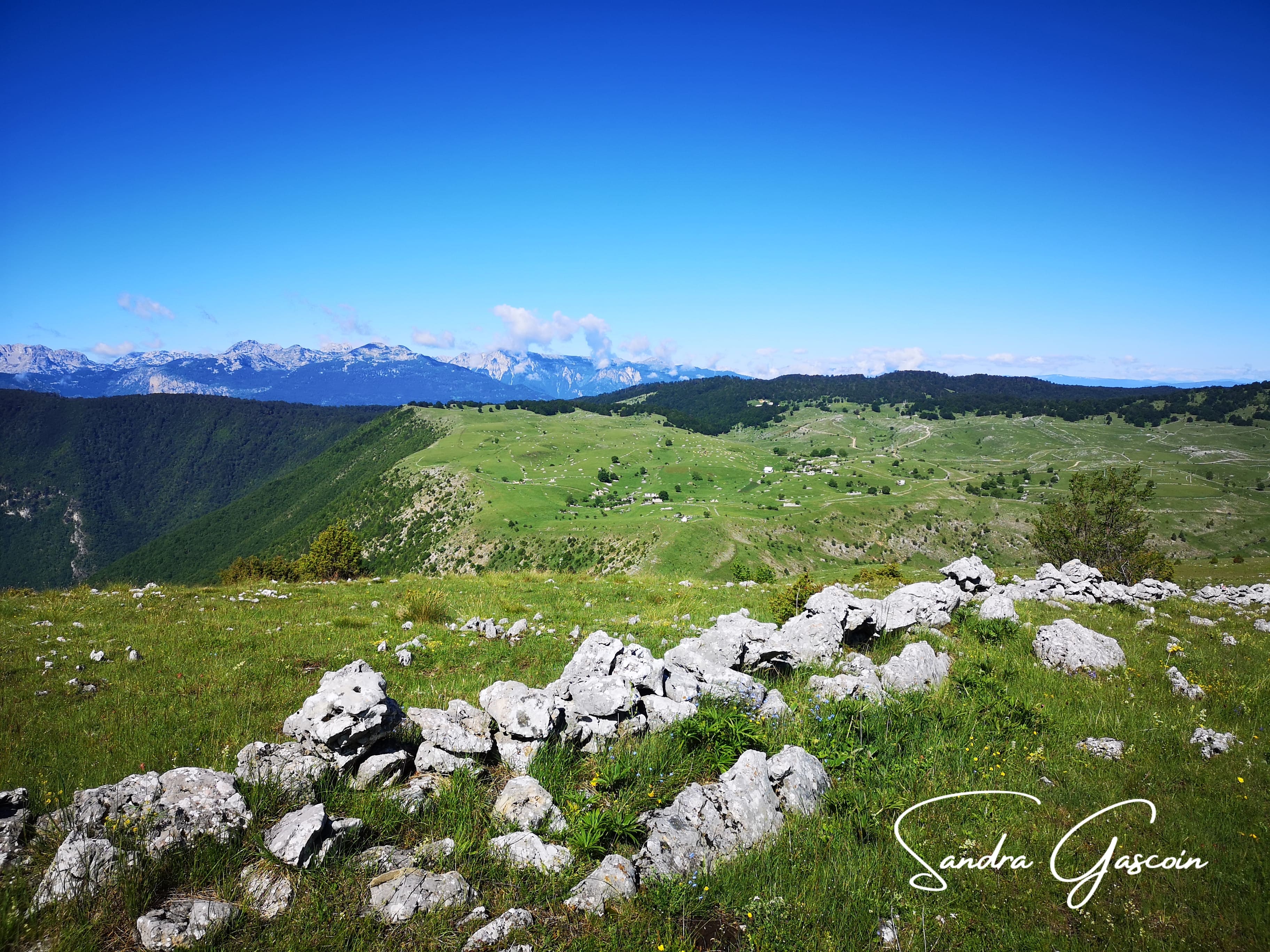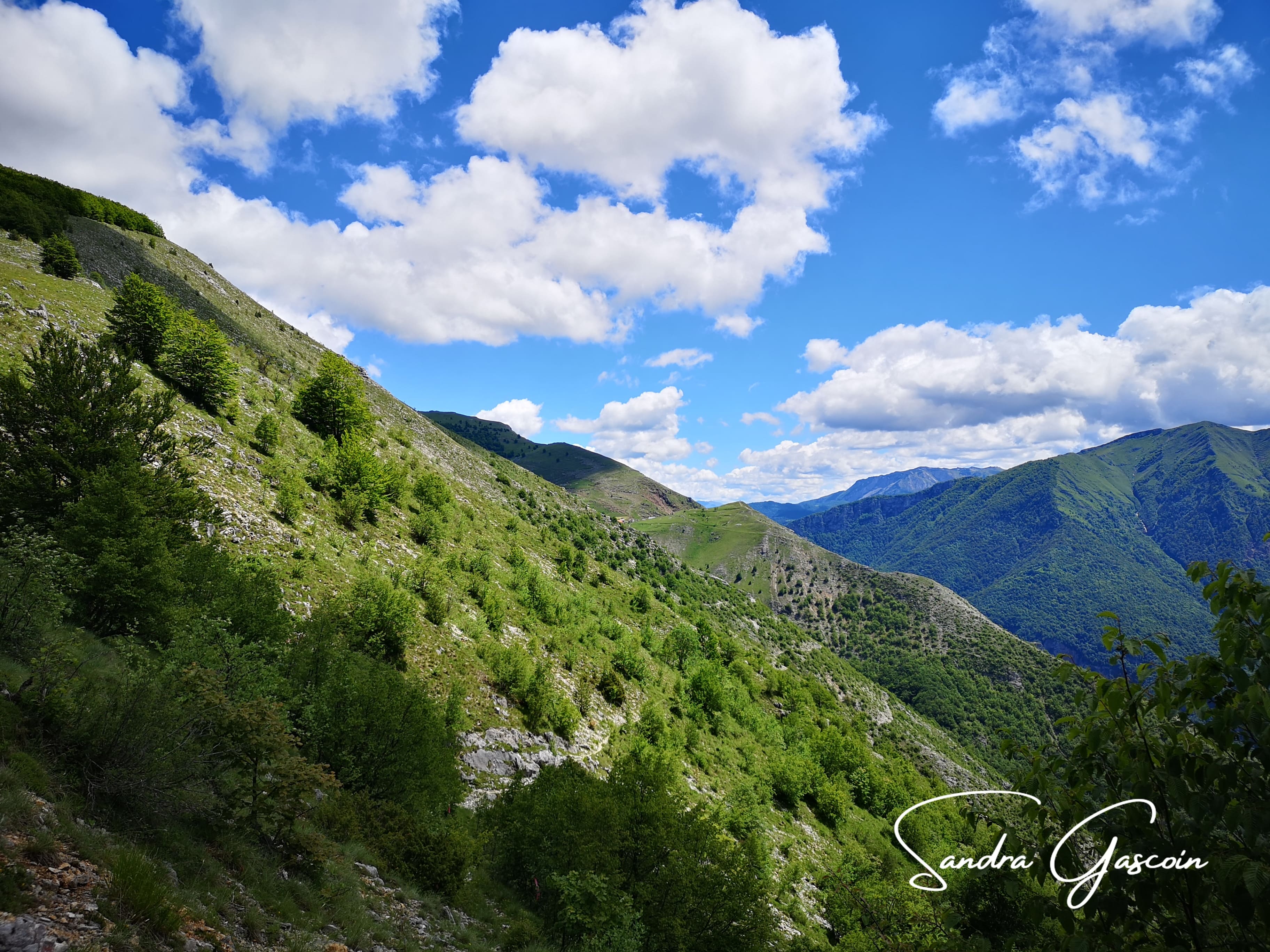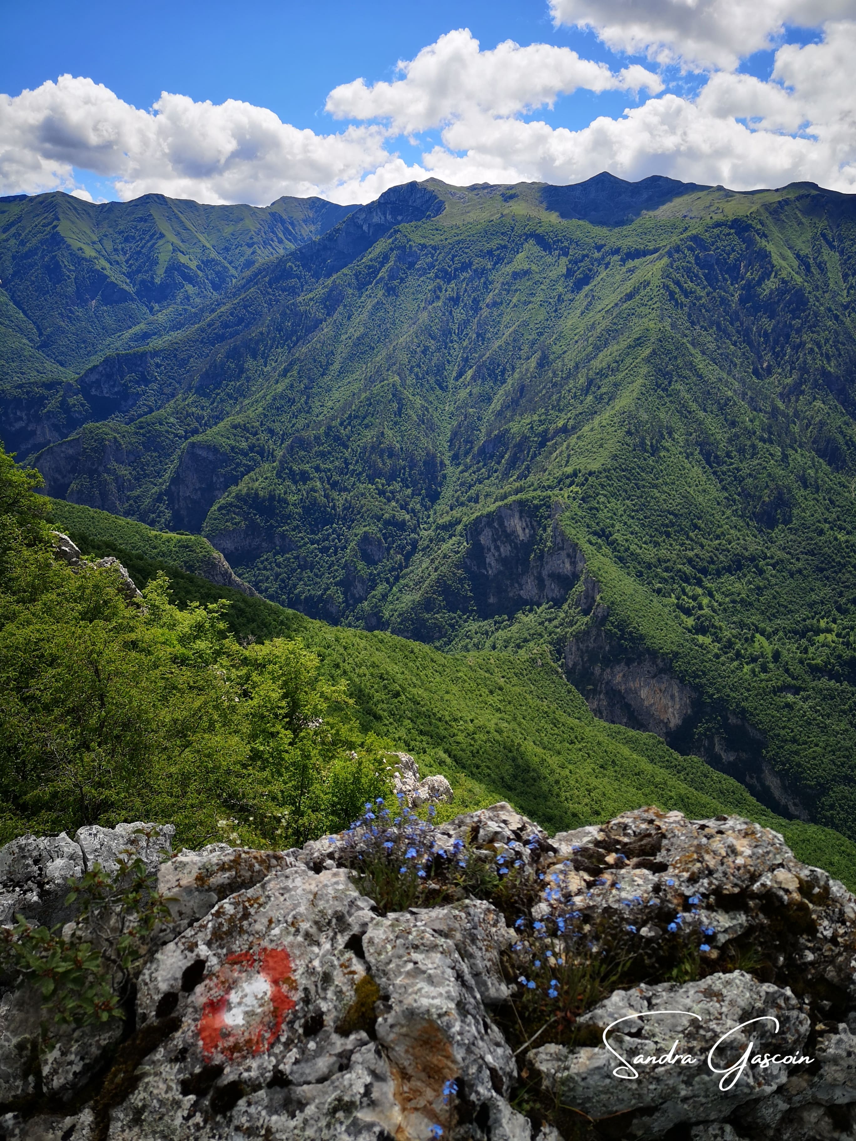 Je remonte le flanc de la montagne à pic, comme un escalier et rejoins le sentier qui finalement est bien marqué, c’est juste moi qui ai encore du caca dans les yeux et n’ai pas vu tous les points blancs cerclés de rouge. À partir de là, je ne perds plus le chemin. Il suit donc la ligne de crête et passe par les petits sommets qui culminent à 1500 mètres maximum.