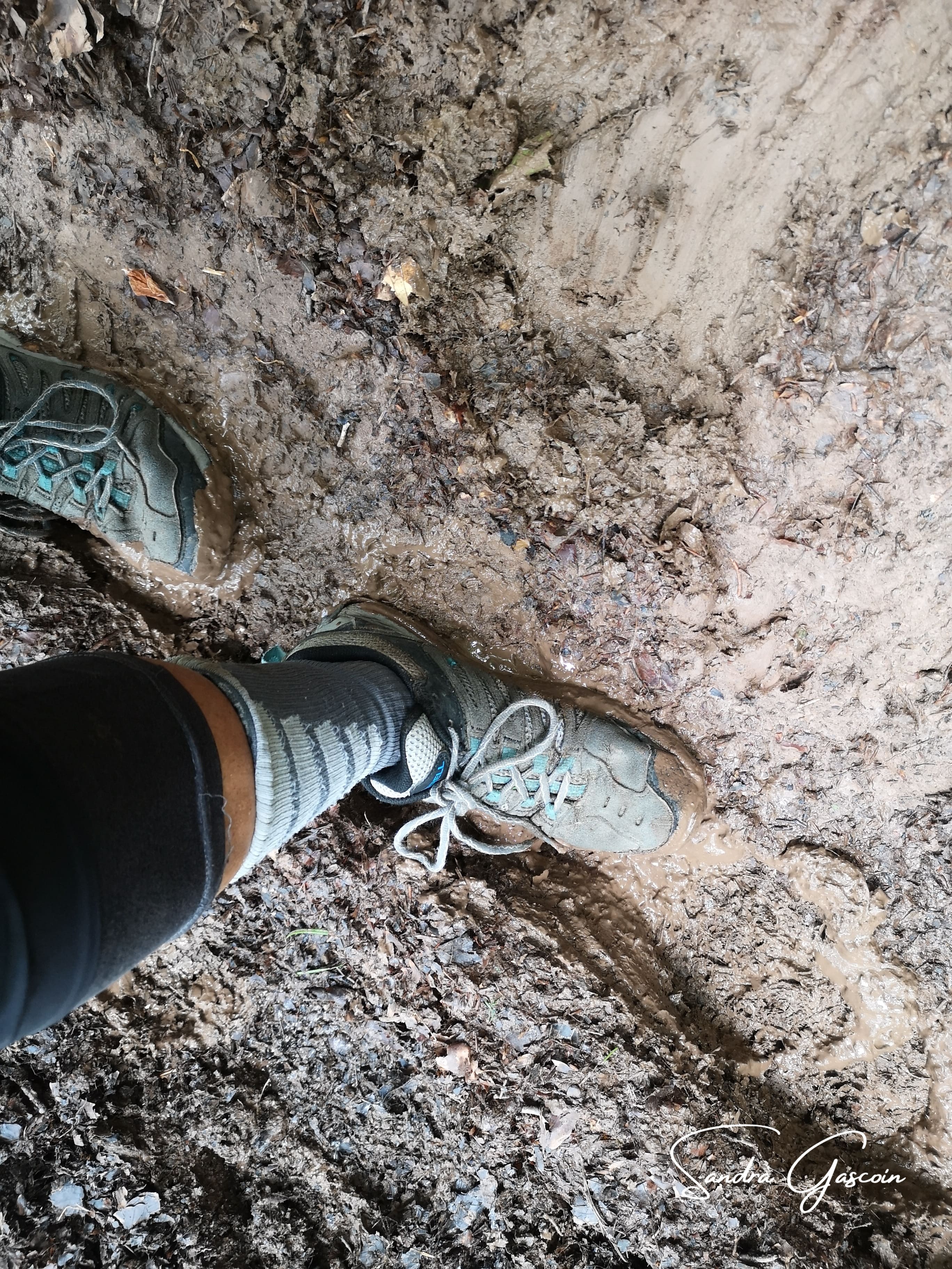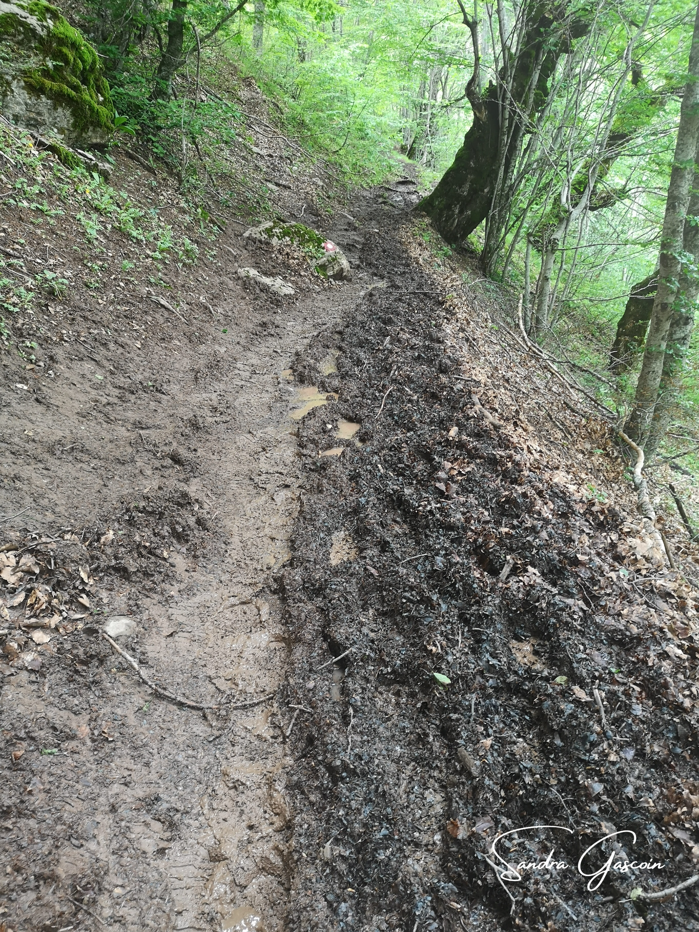 Juste avant de remonter vers le village, il faut passer un ruisseau. L’endroit est gorgé d’eau, j’arrive à sauver une chaussure, l’autre est instantanément trempée. Je grimpe. Un embranchement : gauche ou droite ? Les deux ont la même distance. Je tourne à droite. Perdu ! Le chemin est envahi de plantes aquatiques et par conséquent d’eau. Il me semble que ce n’est pas l’eau d’une source mais… des sanitaires ! Je réussis à mouiller l’autre chaussure ! Jackpot !