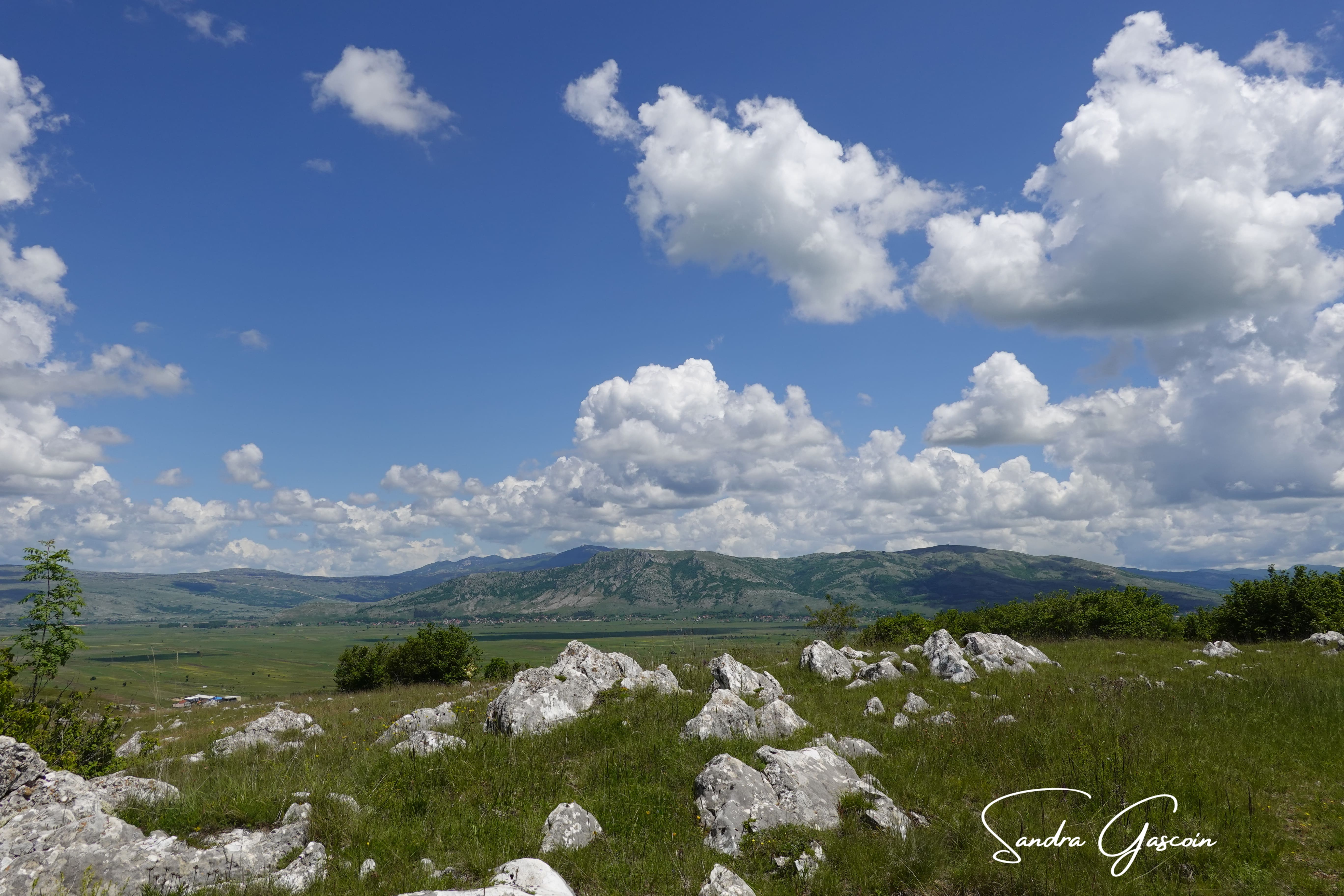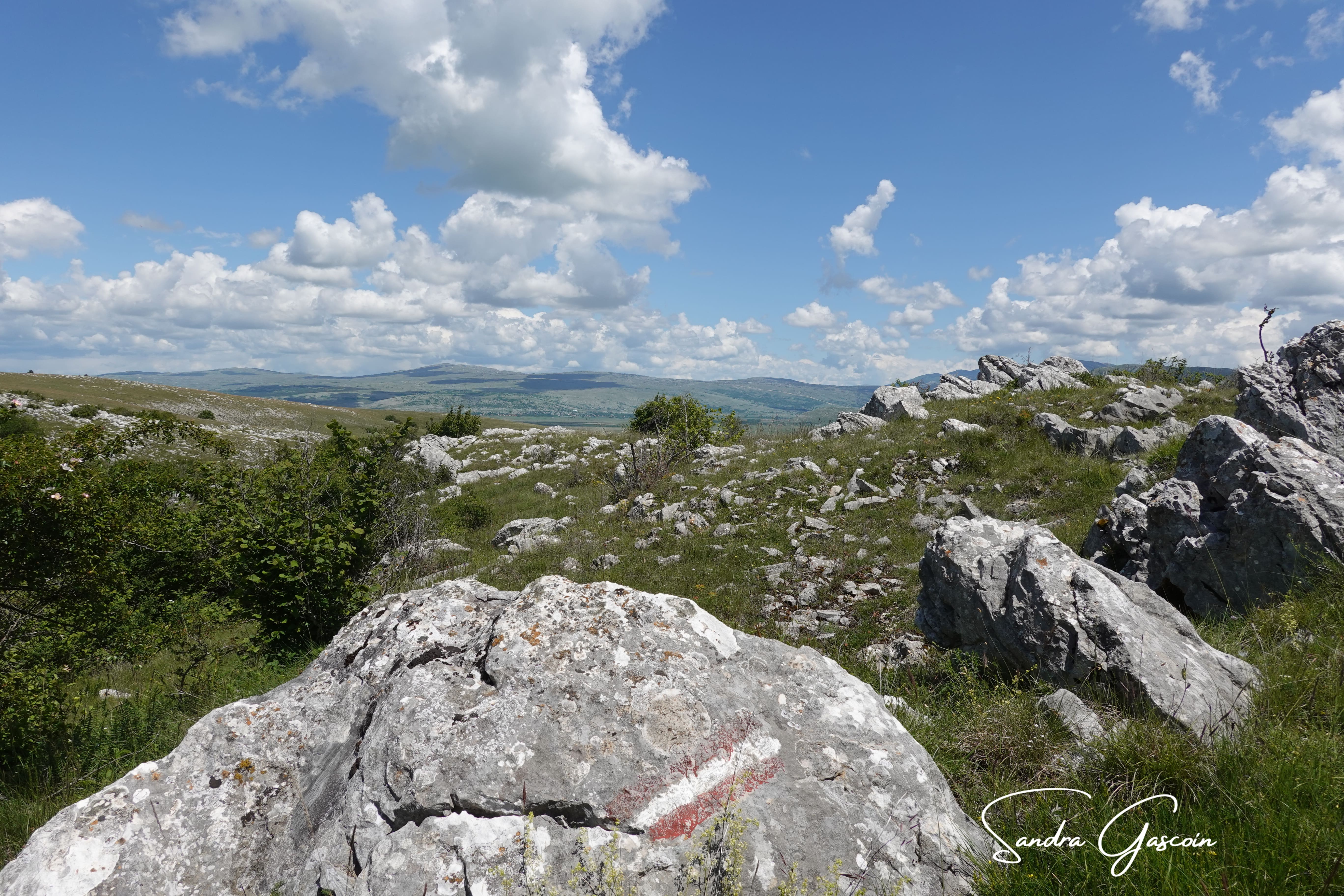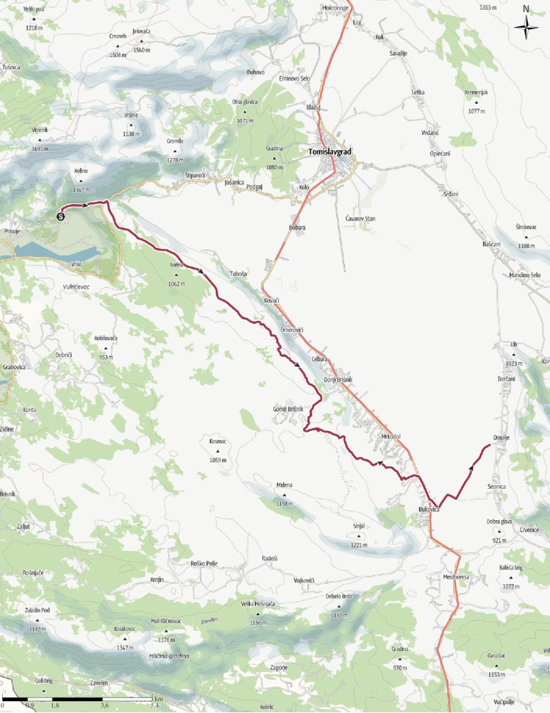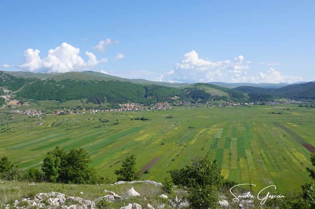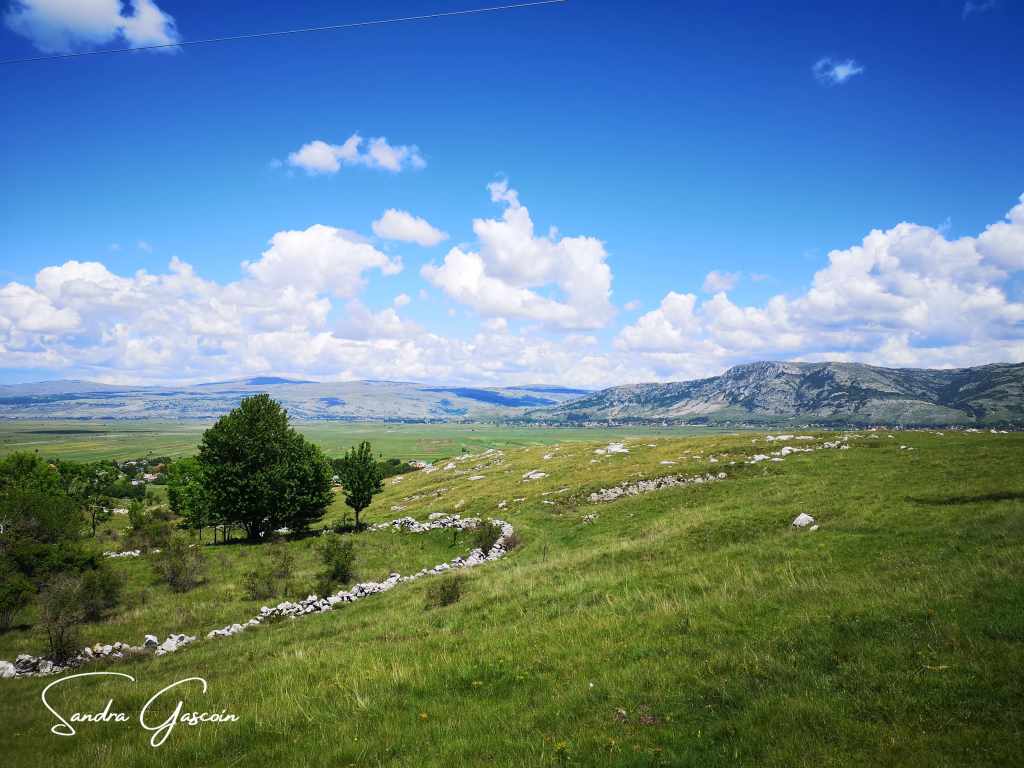 Je dois remonter sur un étroit sentier de terre menant au plateau Grabovička Planina que je vais traverser. En gravissant la pente, je suis stupéfaite à l’idée que les motocyclistes croisés la veille aient pu emprunter cette descente abrupte. Depuis le point de vue (en serbo-croate : « Vidikovac »), je porte un dernier regard sur le lac Buško Jezero sur ma droite. Sur ma gauche s’ouvre la partie nord du poljé de Duvno, qui s’étire jusqu’à Tomislavgrad. Au milieu des Alpes dinariques, il s’agit d’un plateau karstique de 20 kilomètres de long sur 12 kilomètres de large, très fertile, partiellement et régulièrement inondé. Un poljé, un terme géographique d’origine serbo-croate également employé en français, désigne une dépression bordée de versants rocheux escarpés, où les eaux de pluie et de ruissellement s’échappent par un ponor, une cavité souterraine. Parfois, la nappe phréatique refait surface, jaillissant en une résurgence providentielle.