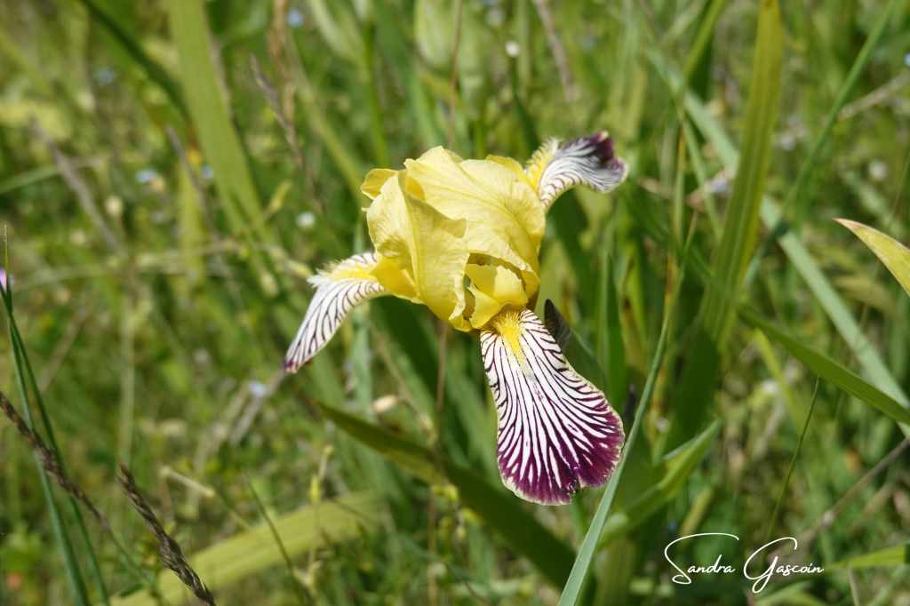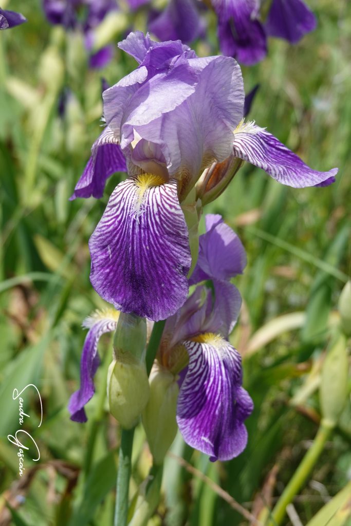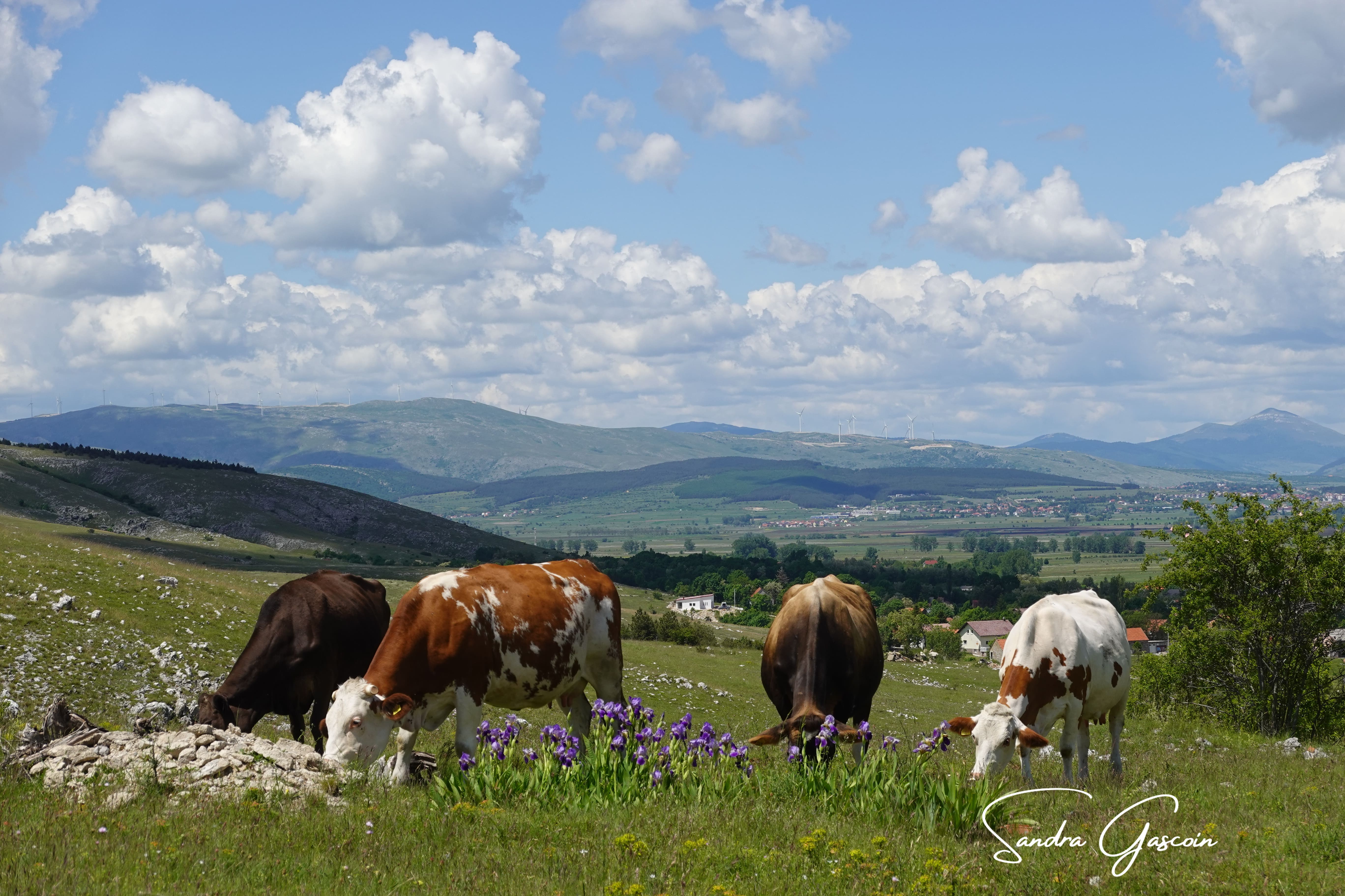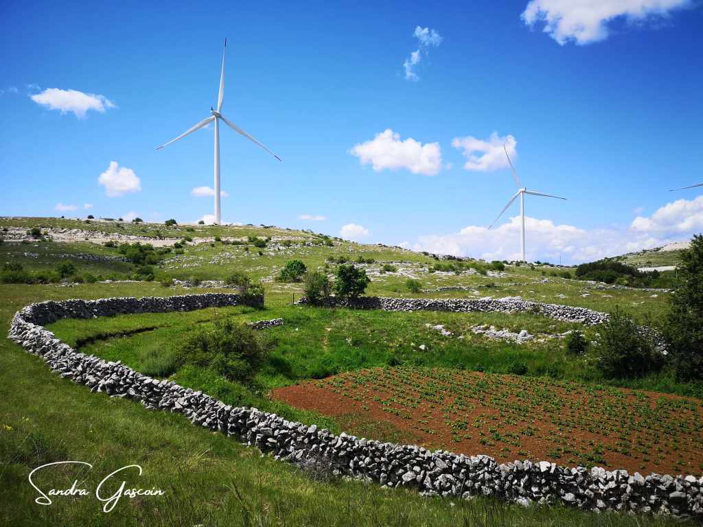 Au début de la piste qui traverse la Grabovička Planina, un balisage arborant le logo de la Via Dinarica fait son apparition. Une promesse d’itinéraire bien tracé. La piste, large et poussiéreuse, s’étire droit devant moi, et je marche d’un pas décidé. Je regrette maintenant de ne pas avoir su qu’il y avait deux gouffres à voir (« Mali Samograd » et « Velki Samograd »), je n’ai vu aucune indication à ce sujet. Je suis sûre que cela aurait pu m’intéresser. Je me suis contentée des iris violets et jaunes au pied des éoliennes, ainsi que les champs ceints de murets de pierres calcaires, fruits du patient labeur des agriculteurs qui les ont extraites du sol.
