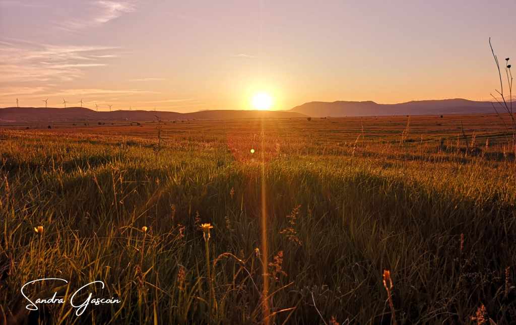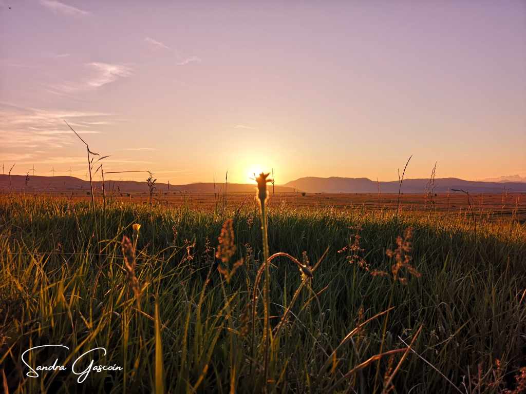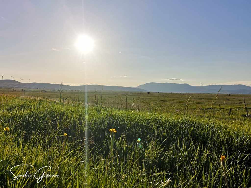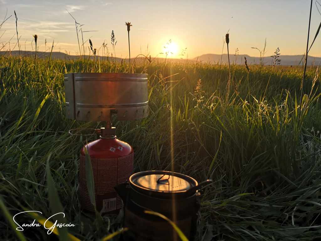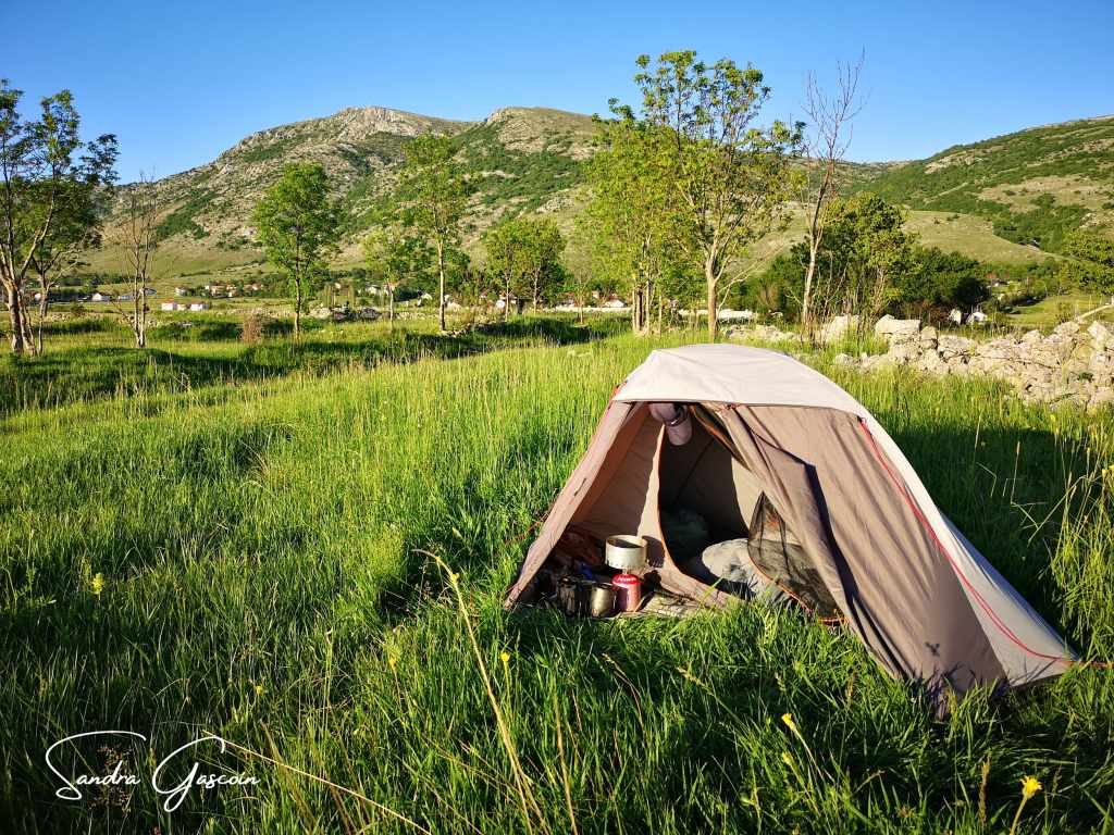 J’y arrive en fin d’après-midi. J’inspecte d’abord un terrain fermé par un muret et des arbres, les hautes herbes sont trempées, mes chaussures sont complètement mouillées aussi. L’endroit semble privé, et je préfère ne pas m’y aventurer davantage. Je m’installe plutôt sur un espace en bordure de chemin, dans une mer d’herbes hautes que je piétine avec précaution, espérant éloigner d’éventuels serpents. Depuis les champs, j’entends les tracteurs des paysans qui travaillent jusqu’aux derniers rayons de lumière. Mon emplacement n’est pas idéal : si un véhicule agricole devait emprunter le chemin, il me verrait immédiatement. Mais je n’avais guère d’autre option. Plus loin, la Via Dinarica s’élève vers les sommets, où les nuits sont glaciales. Sans surprise, une camionnette finit par passer devant ma tente. Je me barricade aussitôt à l’intérieur, dissimulant ma présence pour ne pas éveiller la curiosité. Pourtant, je ne ressens aucune crainte : ma bonne étoile veille sur moi, et je suis persuadée que personne ne viendra m’importuner au milieu de la nuit. Lorsque tout est à nouveau calme, j’ouvre un pan de ma tente et m’installe face au spectacle du crépuscule. Le soleil s’efface lentement derrière la silhouette majestueuse de Grabovička Planina et de la montagne Tušnica, qui domine les eaux paisibles du Buško Jezero. Un instant suspendu, où la nature et le voyage se fondent en une même harmonie.