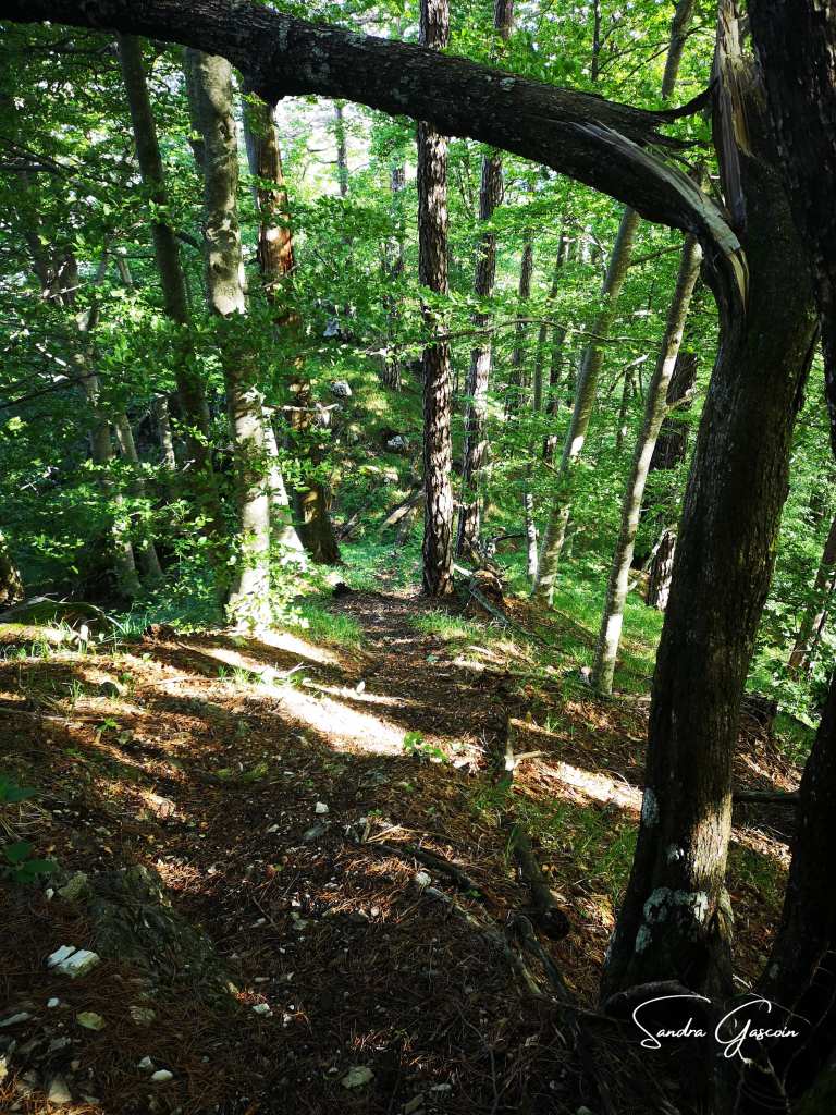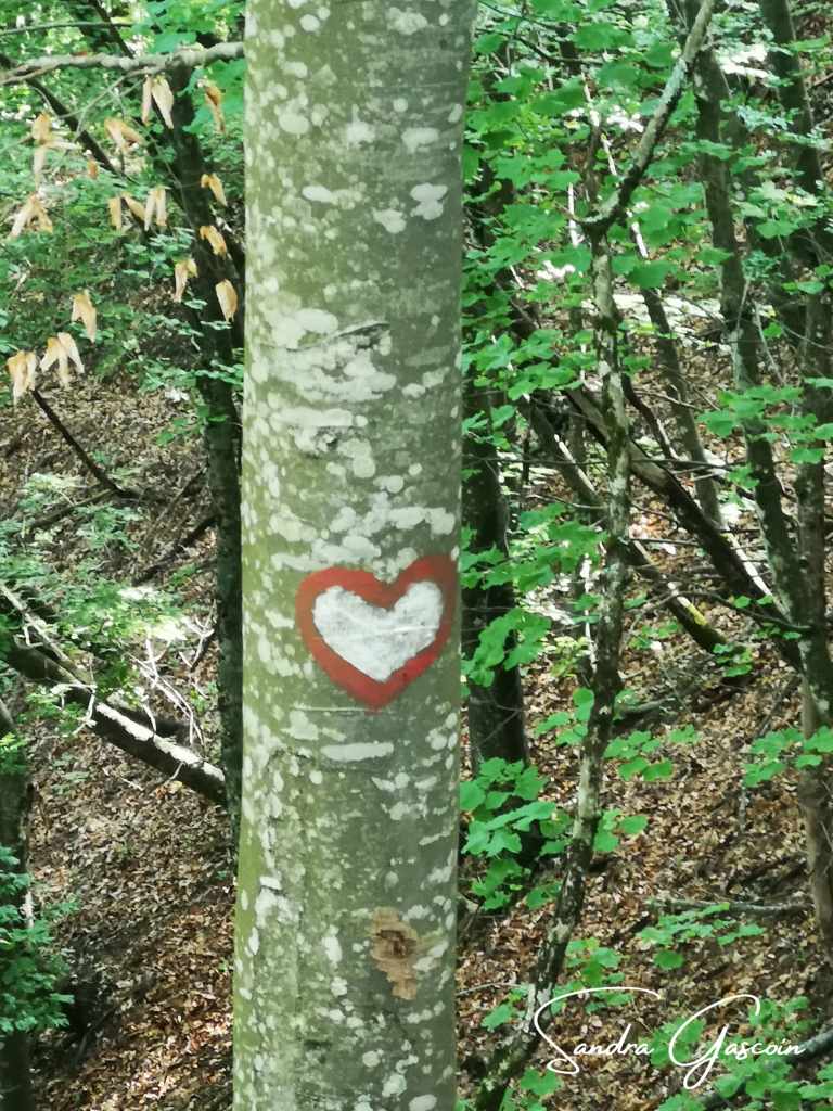 Je suis sur le départ à huit heures, appréhendant la descente raide qui m’attend. Je dois redoubler d’attention à chaque pas, le sol détrempé est plus glissant qu’à la montée. Je découvre le sentier dans l’autre sens, notamment un marquage qui, au lieu d’être circulaire, est en forme de cœur ! Seuls les randonneurs qui marchent la Via Dinarica du Sud vers le Nord peuvent le voir. C’est le détail positif de la situation.