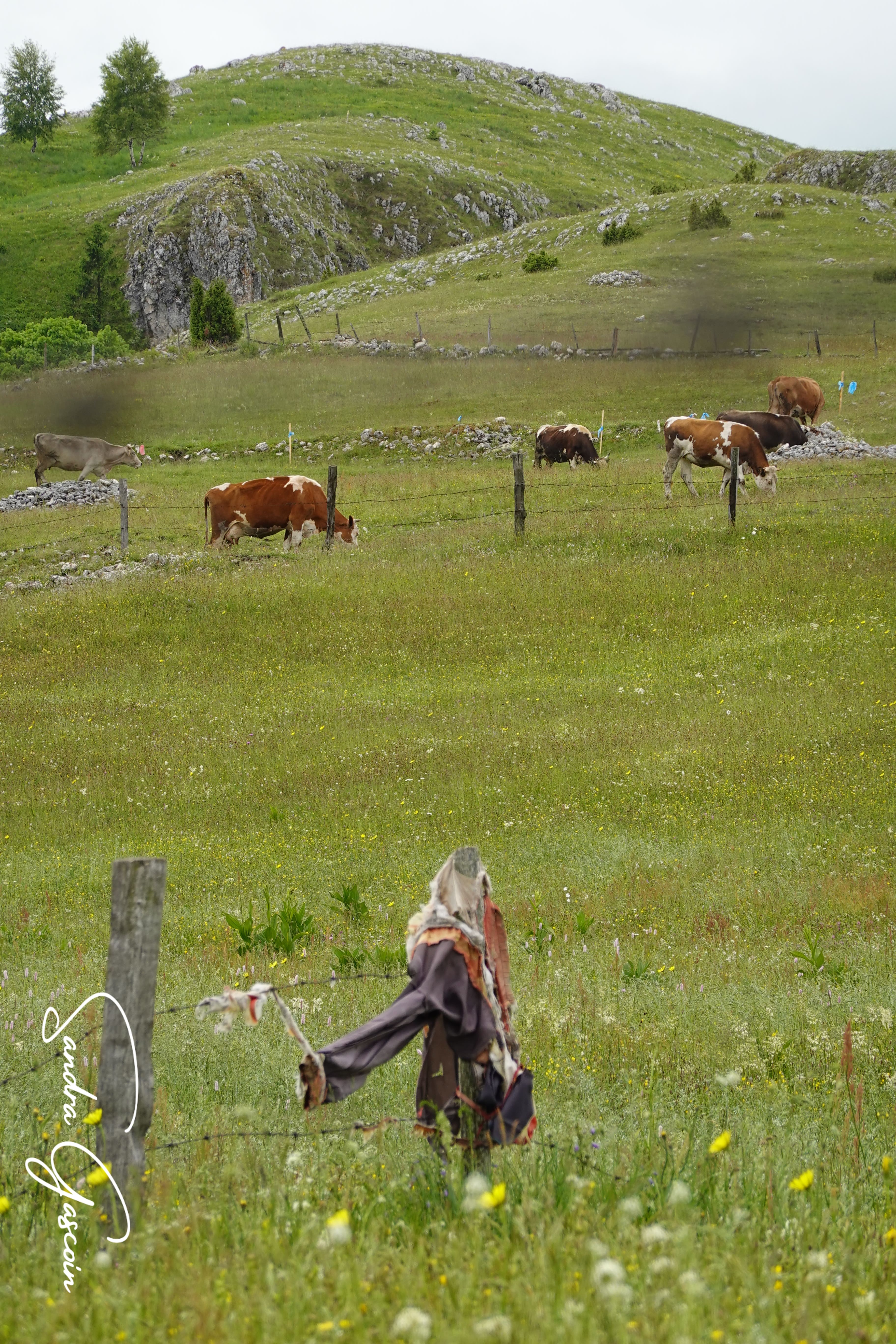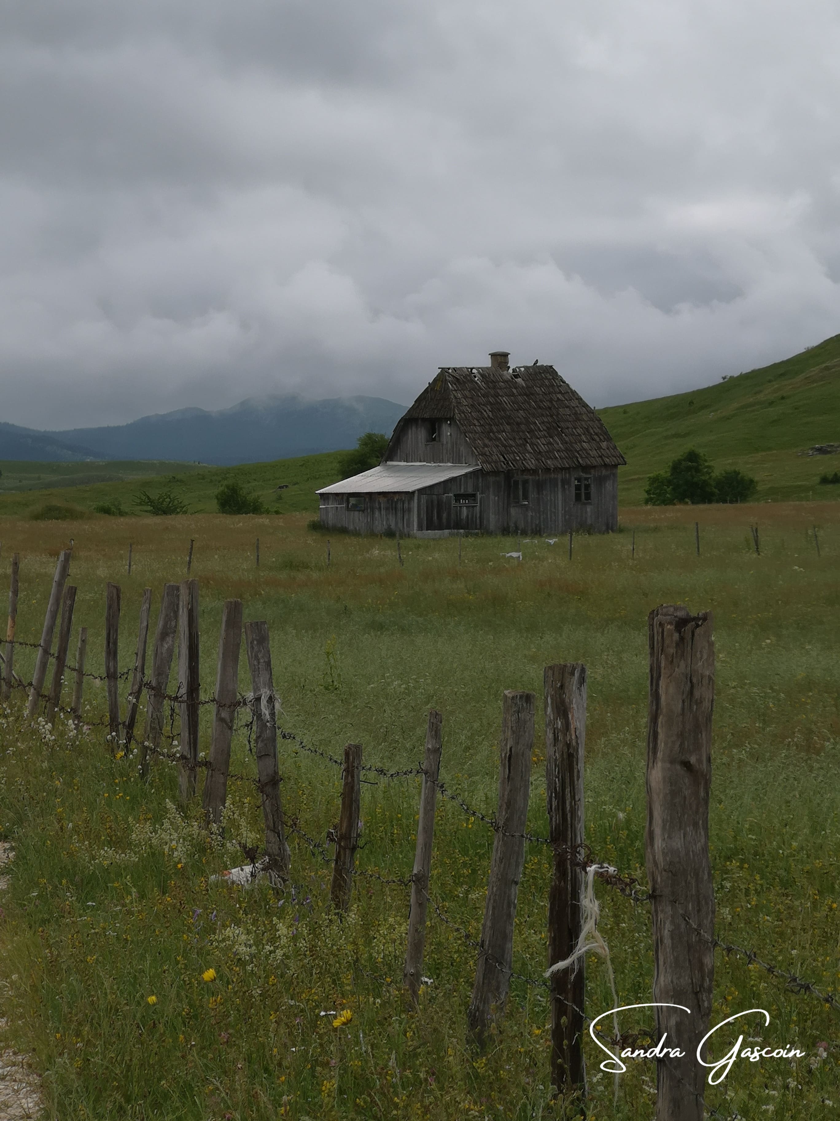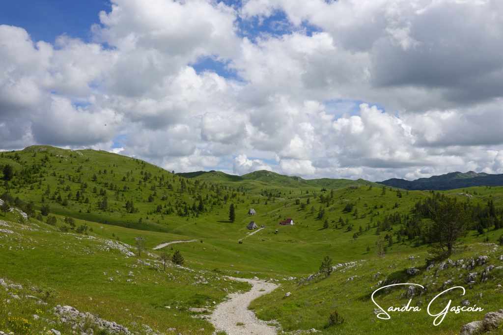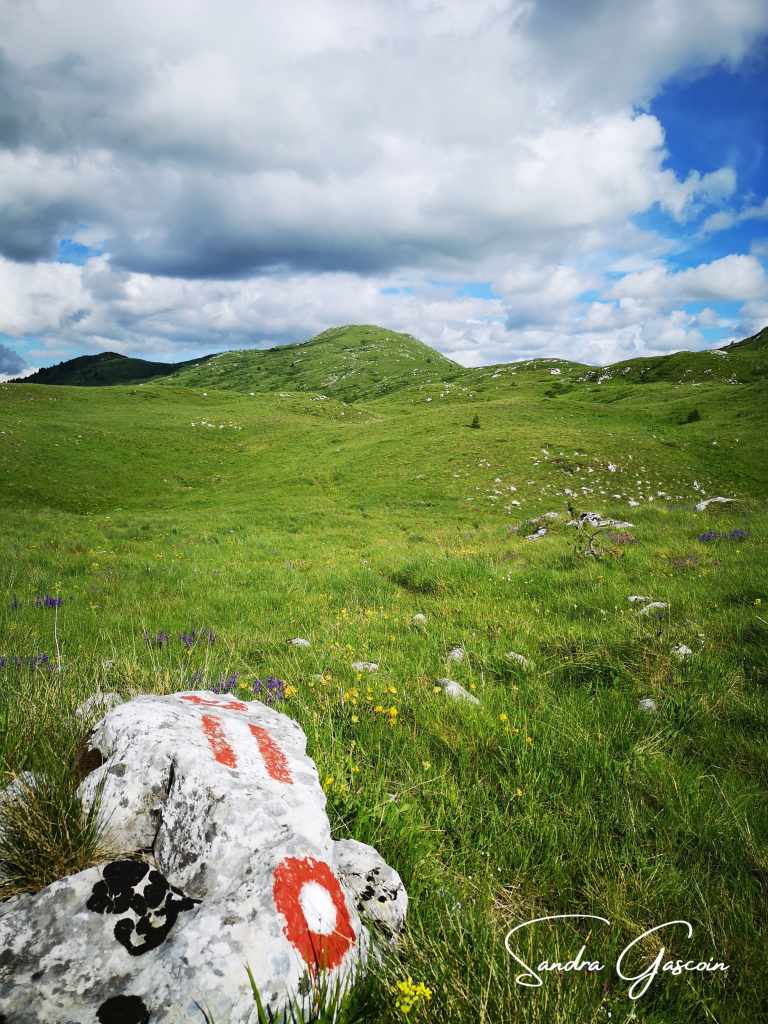 Je reprends la route vers 14h pour rejoindre le lac Zabojsko Jezero à presque vingt kilomètres d’ici. La Via Dinarica traverse le plateau de Sinjajevina. Les forêts sombres font progressivement place aux pâturages fleuris, la piste disparait, une trace se devine dans l’herbe. Le marquage reprend d’abord de façon très visible sur les rochers saillants, puis je perds un peu la trace, les marques s’espacent de plus en plus laissant une trop grande marge de manœuvre pour s’égarer. Je divague à la recherche d’un indice, une trace de passage, un symbole blanc et rouge. Ma lente progression est source de frustration et d’énervement.