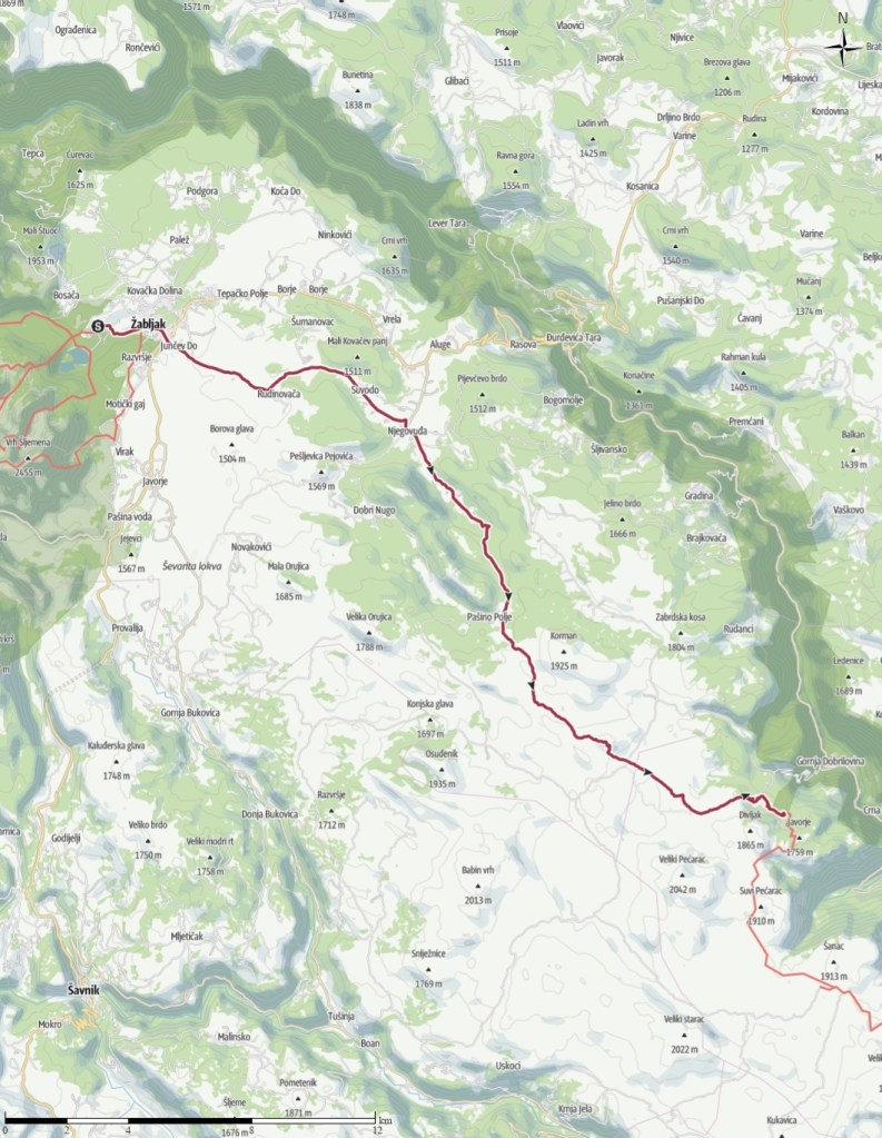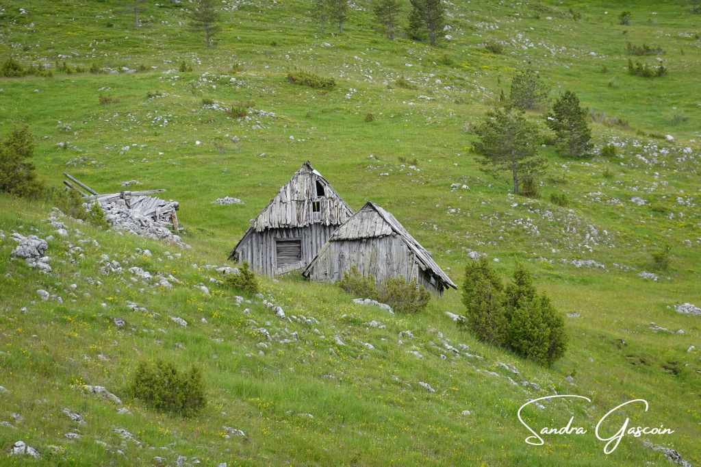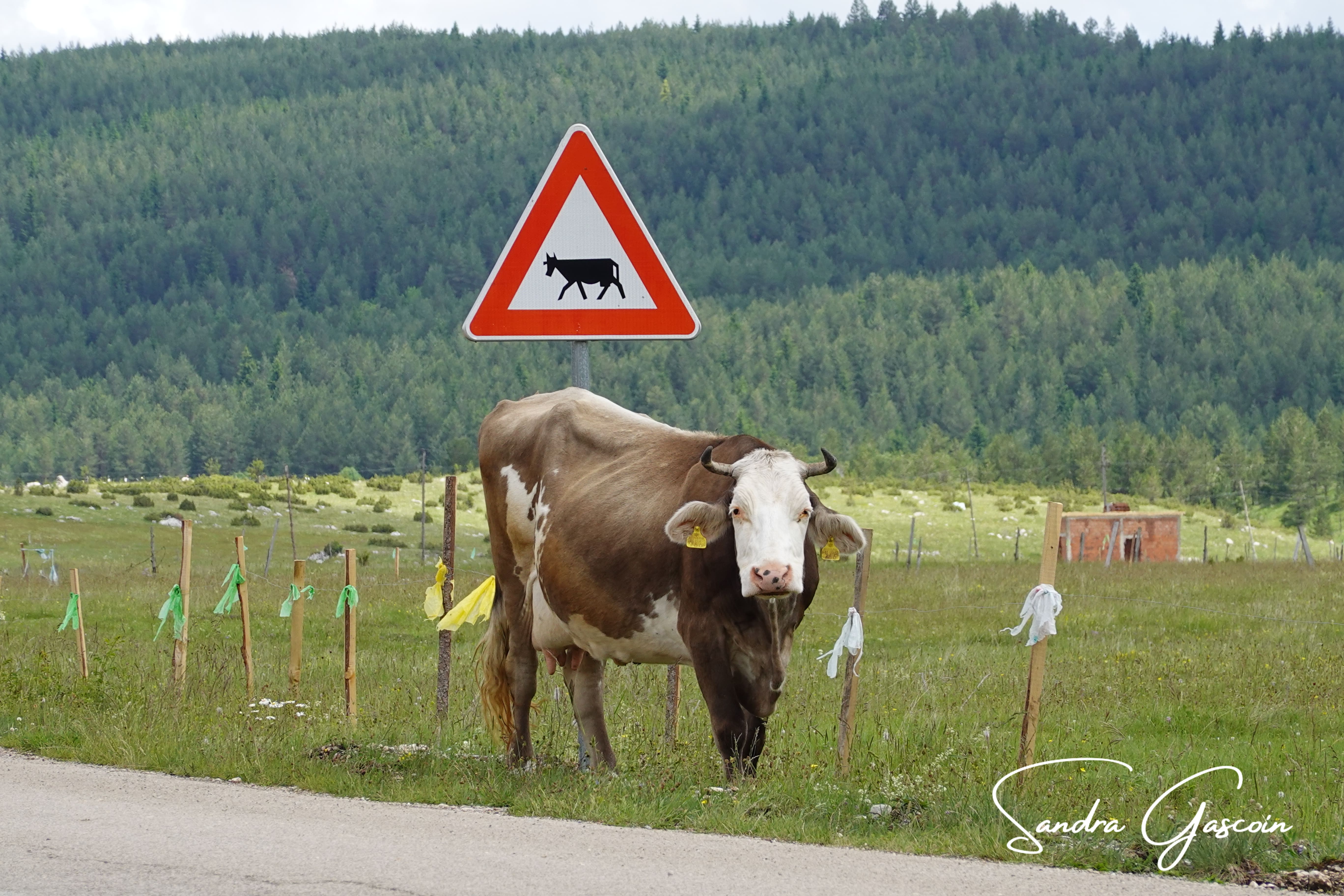Je reprends la route vers 14h pour rejoindre le lac Zabojsko Jezero à presque vingt kilomètres d’ici. La Via Dinarica traverse le plateau de Sinjajevina. Les forêts sombres font progressivement place aux pâturages fleuris, la piste disparait, une trace se devine dans l’herbe. Le marquage reprend d’abord de façon très visible sur les rochers saillants, puis je perds un peu la trace, les marques s’espacent de plus en plus laissant une trop grande marge de manœuvre pour s’égarer. Je divague à la recherche d’un indice, une trace de passage, un symbole blanc et rouge. Ma lente progression est source de frustration et d’énervement.