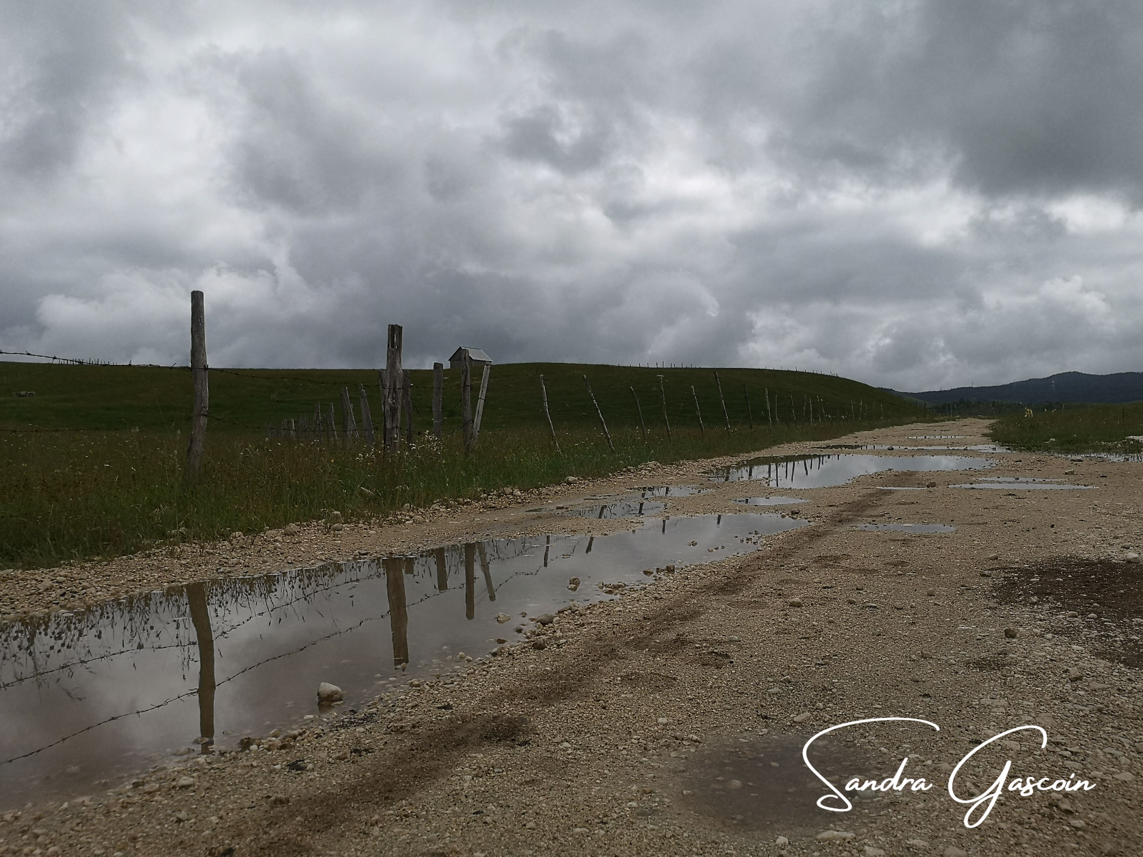 L’eau va finir par poser problème. Dans cette étendue parsemée sporadiquement de fermettes ou de cabanes, il n’y a pas de source. Atteindre le lac avant la tombée de la nuit devient une nécessité. Quand je rejoins à nouveau une piste, mon soulagement est grand. Il me reste quatre kilomètres en descente, sur une piste visible où mes jambes peuvent se laisser guider en pilotage automatique.