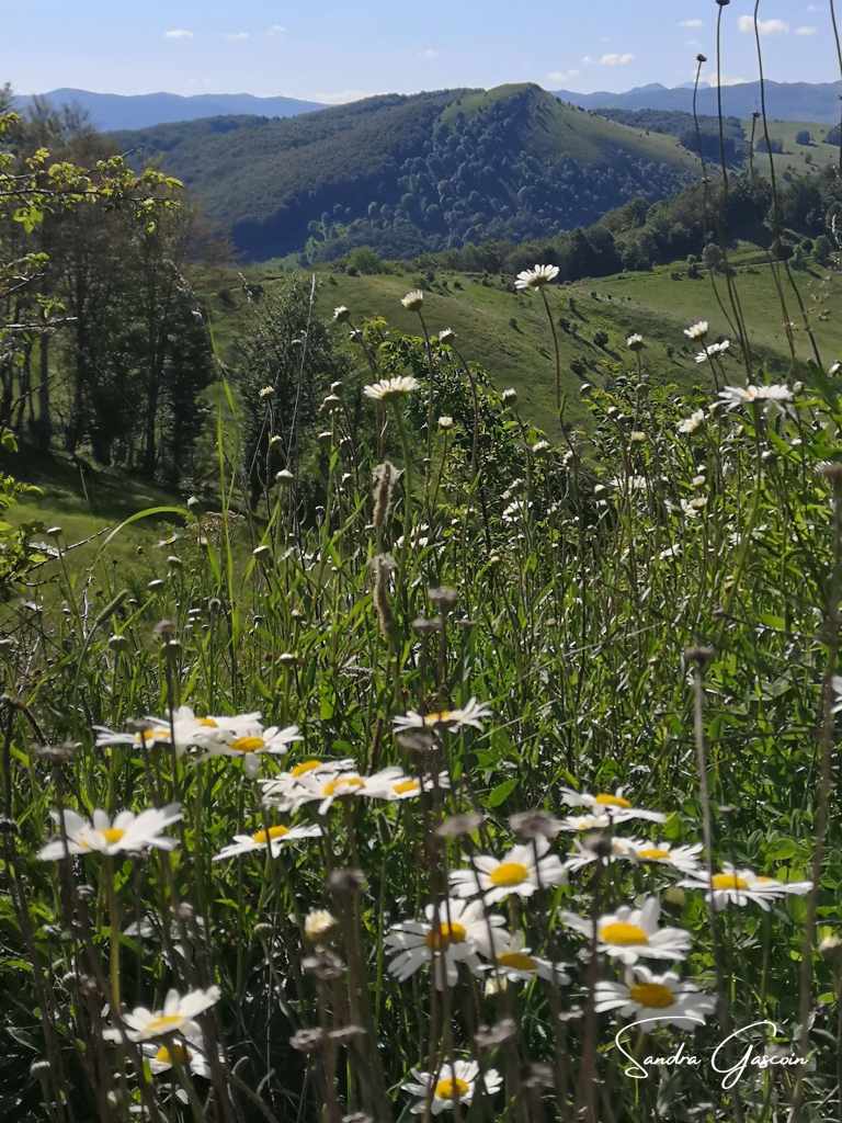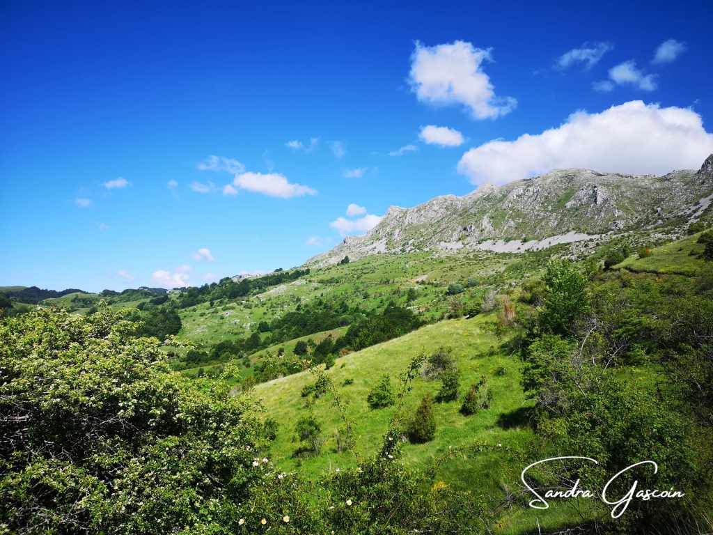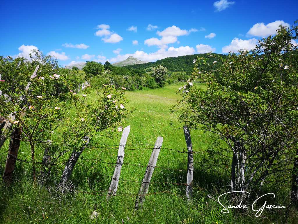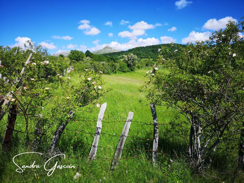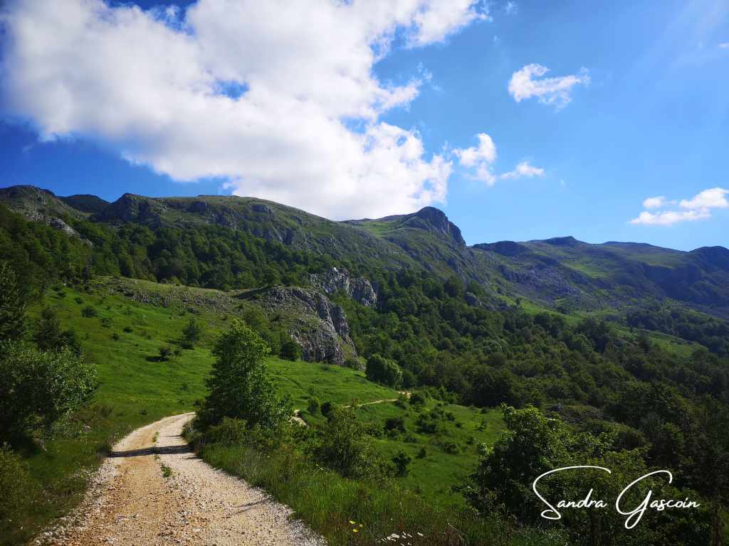 Je quitte le café après avoir demandé au barman de me remplir ma bouteille d’eau. Je m’offre un magnum à la minuscule échoppe et m’élance sur la route. En sortant, je tombe sur un monument dédié à la mémoire d’un militaire, un peu plus loin sur un panneau de la Via Dinarica indiquant les sites touristiques à découvrir sur le parcours. Le White Trail descend sur une piste, je traverse une propriété agricole installée dans d’anciens bâtiments de type caserne. Aujourd’hui, les ruines servent d’abri aux vaches qui y trouvent de l’ombre par ce chaud après-midi ensoleillé. Elles déambulent en toute liberté, je leur laisse la priorité si l’une d’elles souhaitetraverser devant moi. Je reste prudente, me méfiant de ces bêtes placides qui pourraient d’un simple coup de croupe, me renverser.