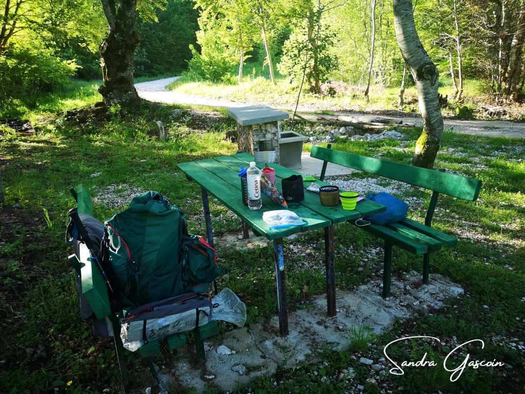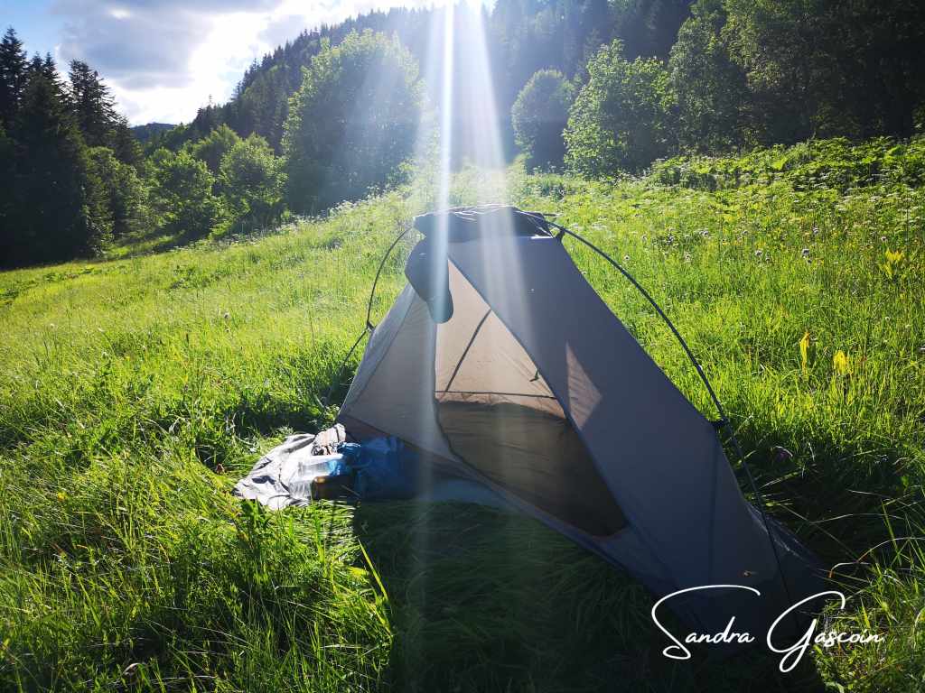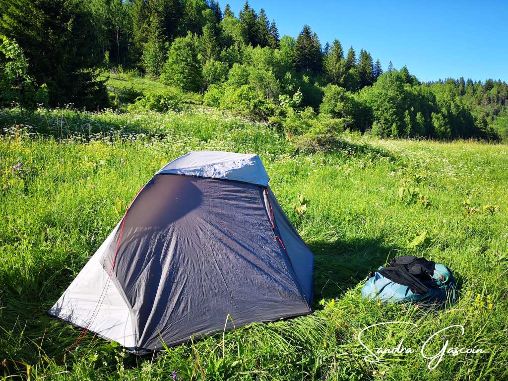 Je poursuis ma route jusqu’à une source d’eau équipée d’une belle table de pique-nique. Ce serait un endroit idéal pour passer la nuit, mais il n’y a pas de terrain plat pour ma tente, tout est envahi par de hautes herbes. Un lièvre se promène le long du chemin, recherchant de l’herbe fraîche à grignoter. Il ne m’a pas remarquée, et je peux l’observer à souhait. Un peu plus loin, je découvre une prairie dissimulée derrière de grands arbres. L’herbe est si haute que je dois l’aplatir avant de pouvoir planter ma tente. Cela me sert de tapis douillet,j’espère qu’aucun serpent ne s’invitera. Pour la nuit, je mets mes bouteilles dans mes chaussures pour qu’aucun animal n’y trouve refuge. Les premiers sommets du parc national Sutjeska se dressent majestueusement face à mon bivouac.