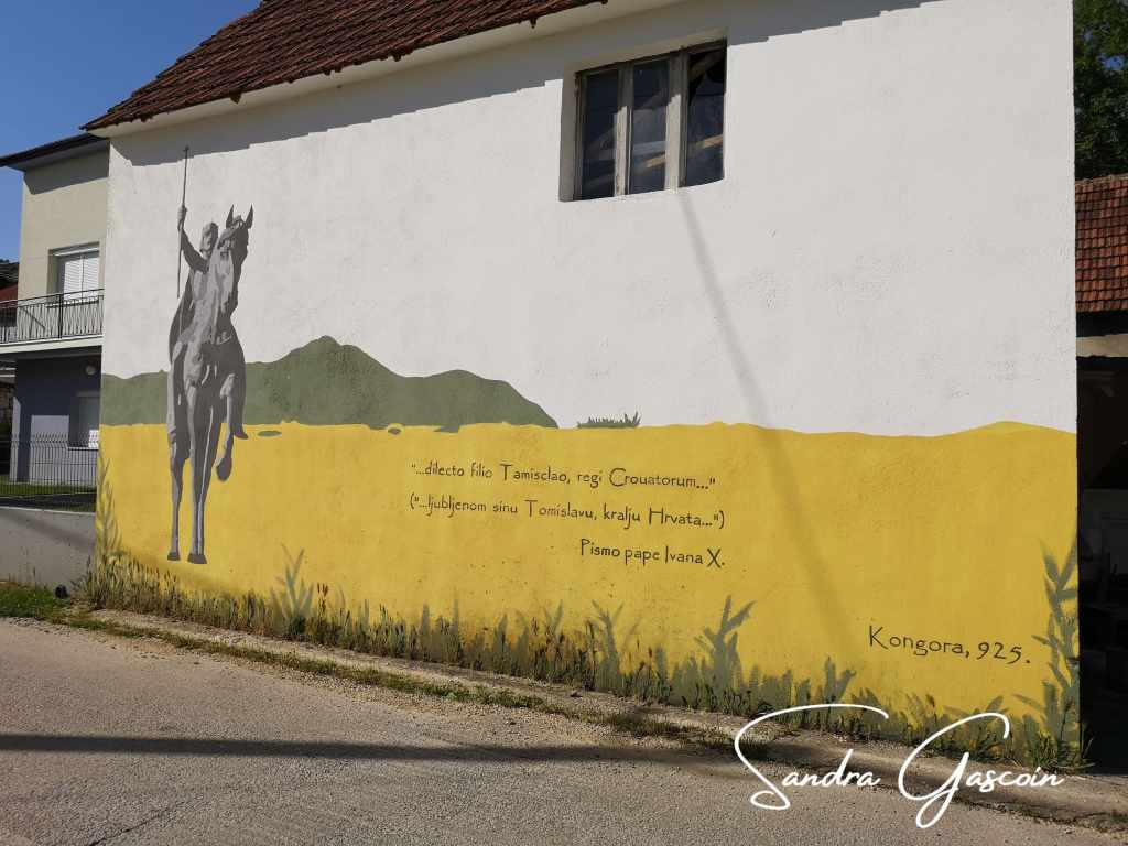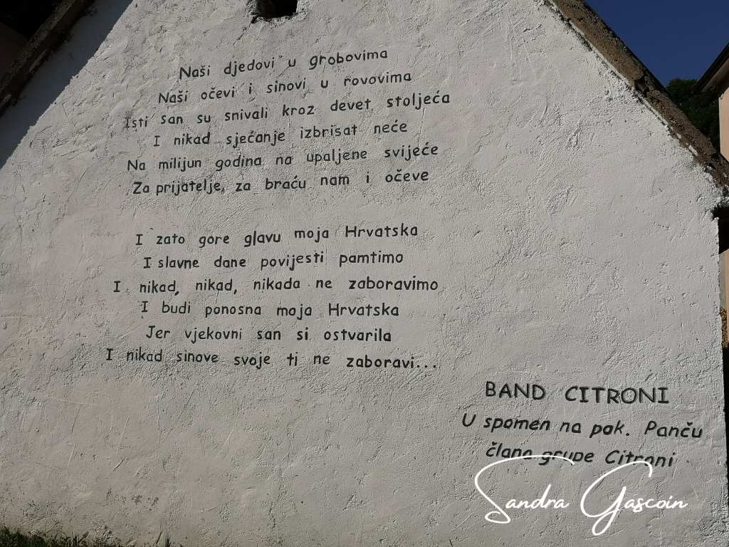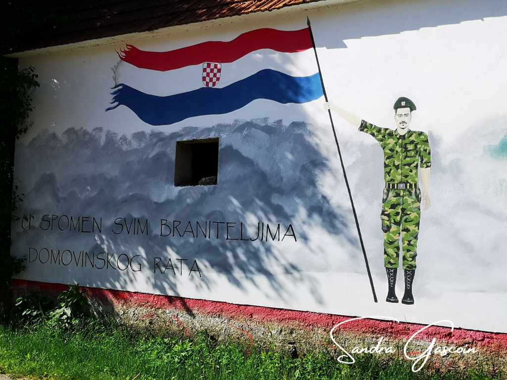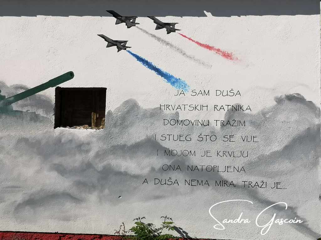 Je repars plus légère et alerte. Dans le village suivant, des fresques murales en croate attirent mon regard. Je comprends deux fois le mois « Croatie/croate » en croate, le drapeau croate y est représenté. J’avais également vu flotter un drapeau croate dans les hauteurs. Une revendication, peut-être ? Ce territoire ou ce village semble peuplé de Croates exprimant leur appartenance avec ferveur. J’apprends plus tard que les Croates représentent plus de 15 % de la population du pays, soit plus d’un demi-million. Ceux-ci sont majoritairement catholiques et parlent croate, l’une des trois langues officielles. Ils se répartissent dans l’Ouest de l’Herzégovine et le Sud-Ouest de la Bosnie. C’est justement ici que je me balade.