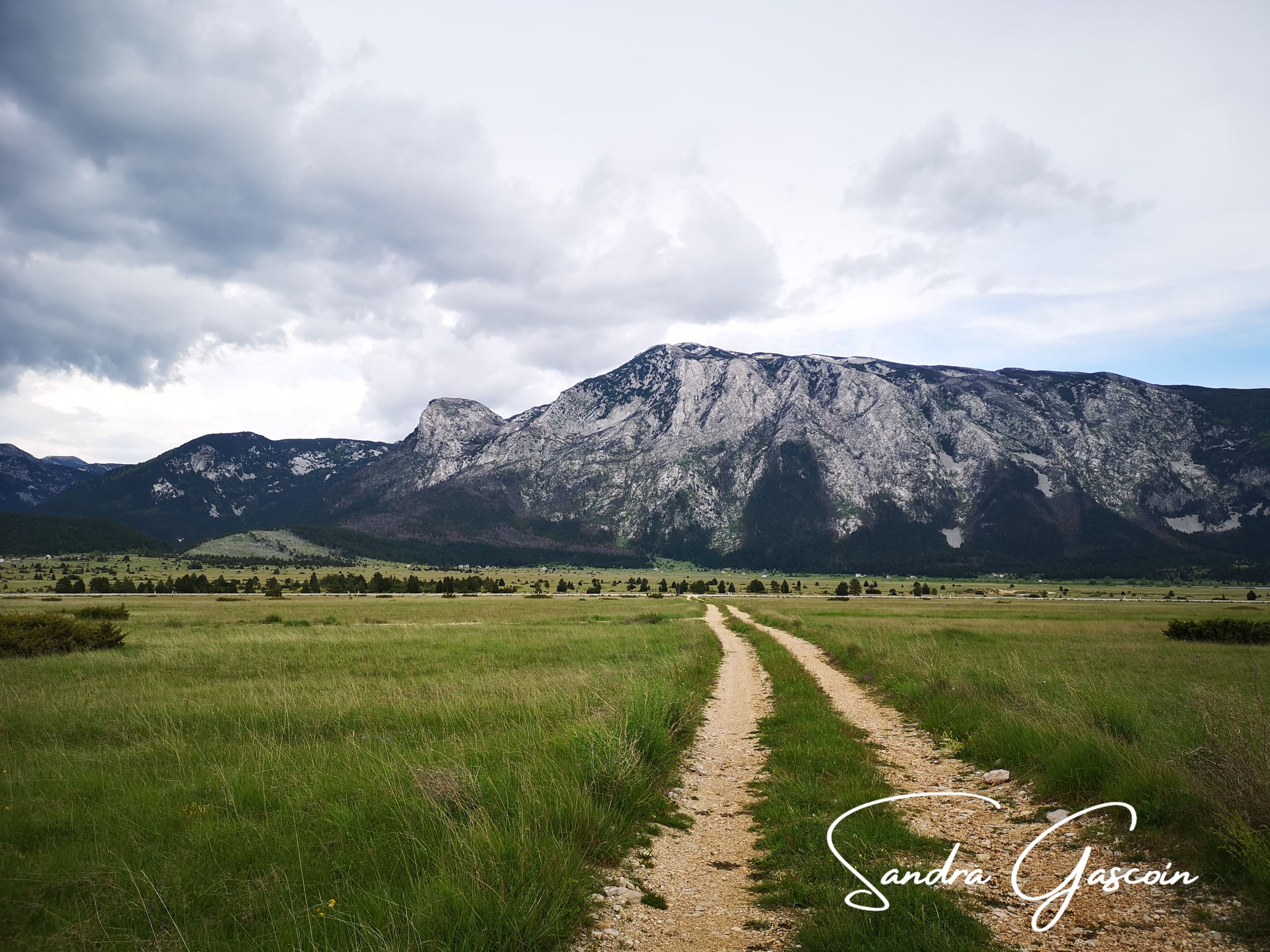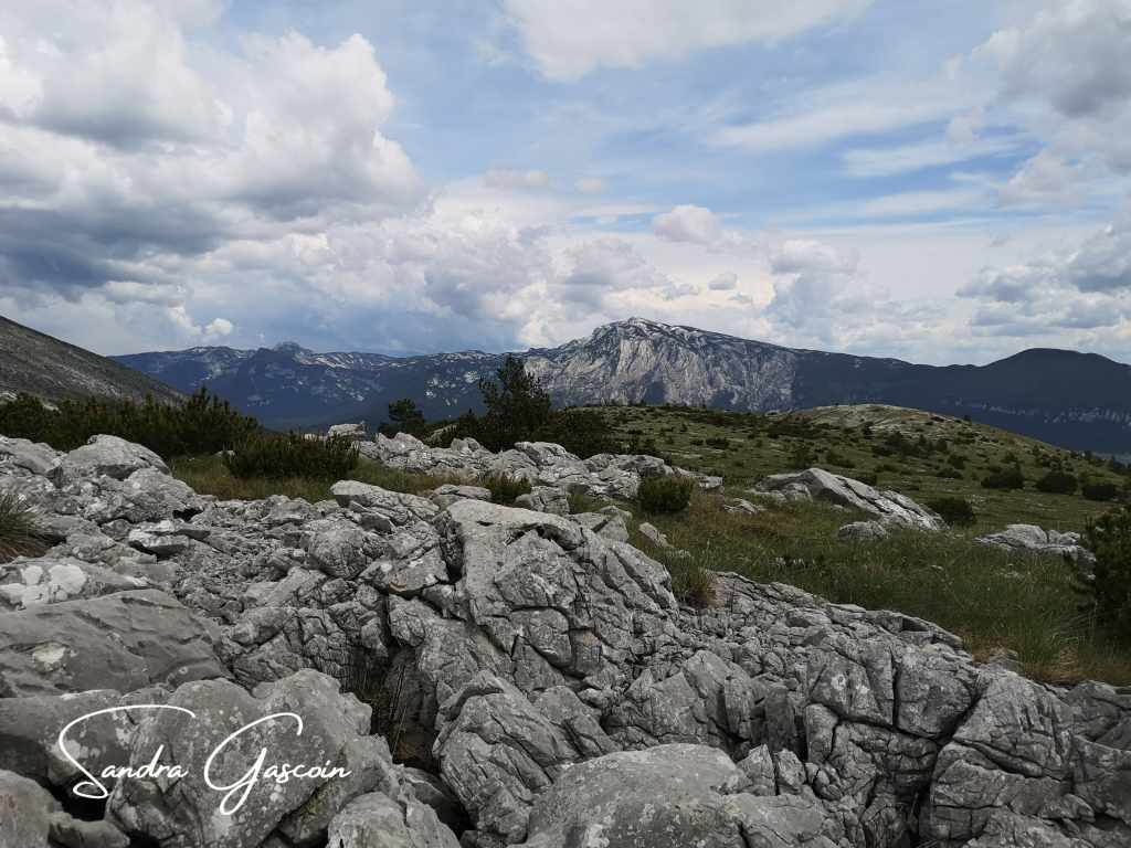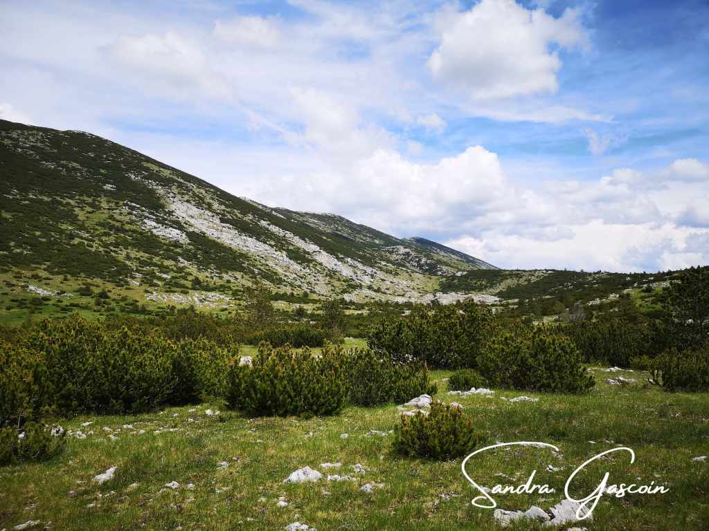 Après Kongora et ses signaux identitaires, je rejoins la piste qui me remonte vers les sommets du massif Čvrsnica. Sous la canopée, il commence à faire bien chaud. Je fais une pause snack pour sécher ma tente au soleil. Le vent souffle un peu et la gonfle à intervalle irrégulier. Le séchage n’en est que plus rapide. Vers midi, j’atteins le hameau de Omrčanica, où une source d’eau est supposée se trouver, selon mon application. Je tourne en rond, en vain. Je n’ose pas me servir dans le jardin clôturé des maisons. Il y a des voitures mais personne ne réagit à mes appels en croate : « Dobar dan ! Dobar dan ! ». Je suis bien embêtée.Je continue un peu, d’autre maisons, celles-ci sans clôture. J’en trouve une avec un accès à l’eau. Je tambourine à la porte, j’attends, je recommence. Pas de réaction. Je pose le sac, sors les bouteilles vides. Au robinet extérieur est fixé un tuyau. J’essaie en vain de le détacher. Je ne veux rien forcer, je me contente donc de l’ouvrir et de courir jusqu’au bout du tuyau pour remplir mes bouteilles. Tout est toujours calme et silencieux quand je repars chargée de mes deux litres supplémentaires.