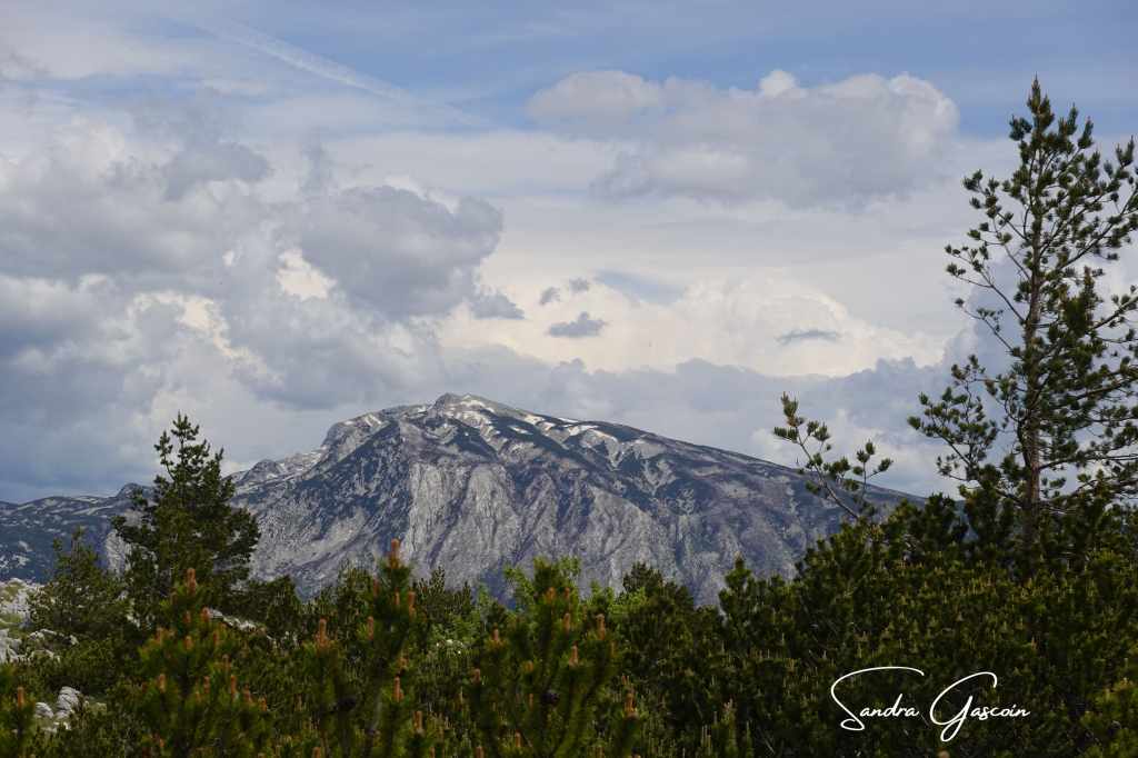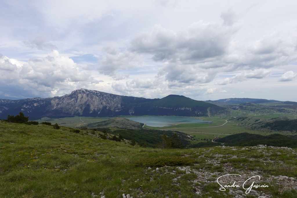 Le sentier que j’ai choisi n’est pas plus aisé : des sapins ont colonisé le passage, m’obligeant à des contorsions absurdes : slaloms incertains, contournements laborieux… Je me retrouve n’importe où, passant parfois entre les arbres, parfois en contournant exagérément pour éviter la course d’obstacles. Ce chemin n’est pas un gain de temps, ni une partie de plaisir, même si le paysage me plait beaucoup. J’arrive enfin sur une crête offrant une vue imprenable sur le lac Blidnje Jezero aux portes du parc national Prirode Blidinje.