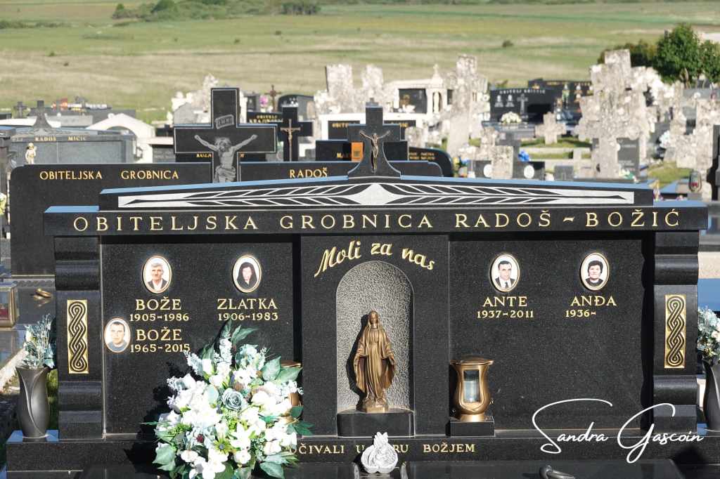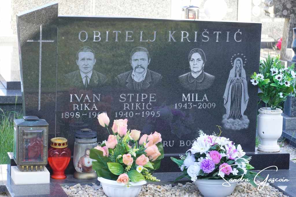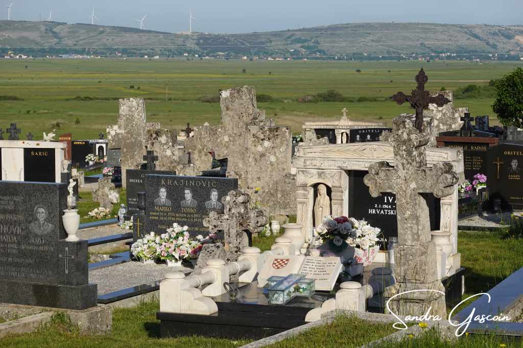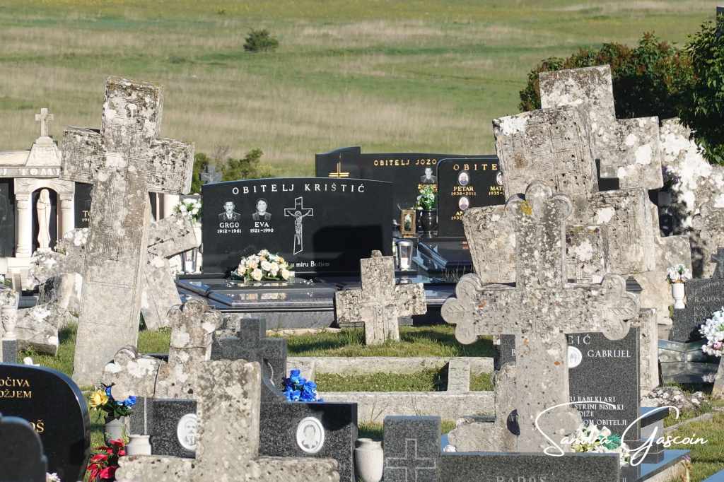 Levée aux aurores pour éviter toutes rencontres avec les paysans du coin, je prends la route dès six heures du matin. Face à moi, la Lib Planina se dresse avec majesté, mais je choisis de la contourner. Je préfère me rendre dans la vallée opposée sans m’imposer un dénivelé superflu. D’abord je longe la route L3 bordée par les villages construits de part et d’autre de cette voie. Je passe devant un énorme cimetière catholique. Leur particularité dans les Balkans réside dans la manière de décorer les pierres tombales : sur la stèle en granit noir, le portrait des défunts y est sculpté. Par ailleurs, les tombes sont ornées de fleurs… synthétiques. On n’y trouve donc jamais de robinet pour se ravitailler en eau.