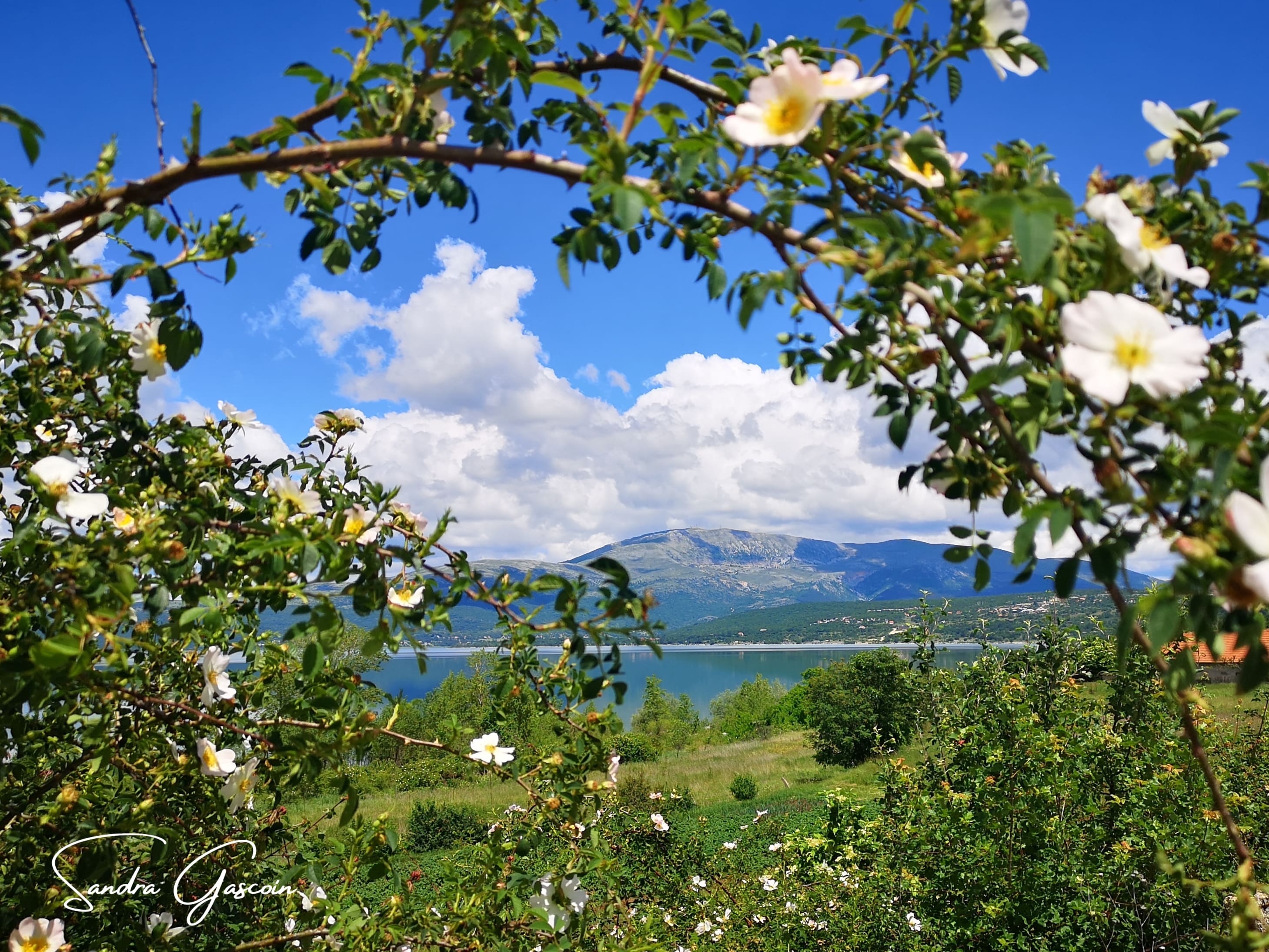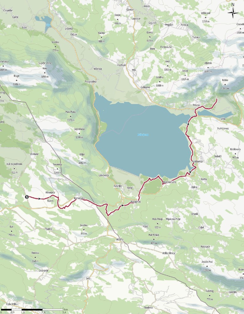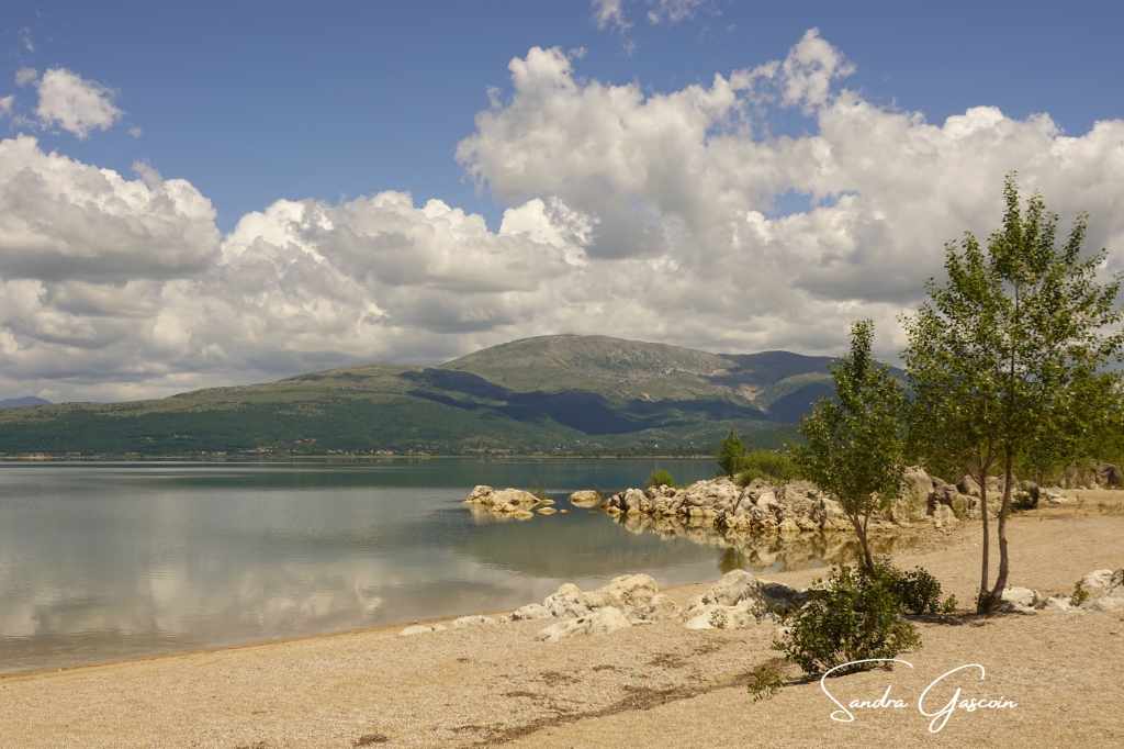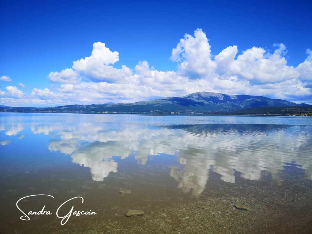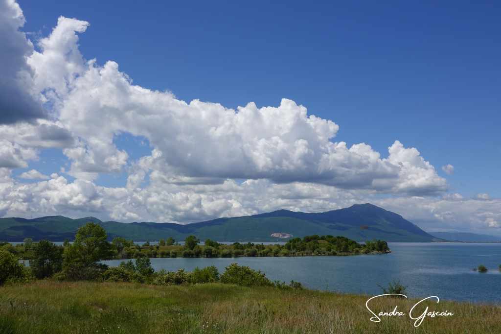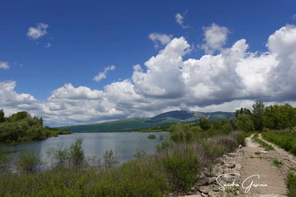 Sur une quinzaine de kilomètres, je longe le lac dont la surface de l’eau, telle un gigantesque miroir, reflète les montagnes alentours et les nuages blancs moutonneux qui s’invitent dans le ciel azur. Le spectacle invite à la contemplation. J’ai quand-même envie d’avancer et profiter de l’absence de relief important pour enchaîner les kilomètres. « Buško » signifie « marais » en serbo-croate : en longeant le rivage, je passe par une zone humide où les grenouilles s’époumonnent tout en restant invisibles. À force d’avoir les yeux rivés au sol, je ne réalise pas tout de suite que le ciel s’est assombri, présageant l’approche de la pluie. Des rideaux d’averse s’abattent au loin sur le lac. Il me faut accélérer et m’éloigner du lac avant d’être prise sous un orage.