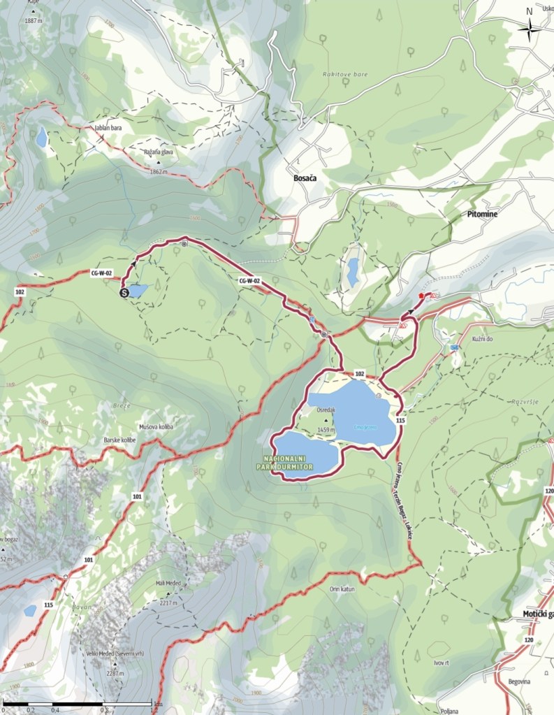 Le Črno Jezero est composé de deux lacs (le grand « Veliko Jezero » et le petit « Malo Jezero ») reliés par un détroit souvent à sec en été. Il s’agit du plus grand des lacs glaciaires du massif, appelés communément « yeux de la montagne ». Les cascades alimentant le lac sont déjà taries, le détroit pas encore. Selon la lumière et l’angle de vue, la couleur de son eau oscille entre un bleu profond et un vert émeraude, jamais noire. Quelle est donc l’origine de ce nom ? Vraisemblablement des grands sapins qui s’y reflètent.