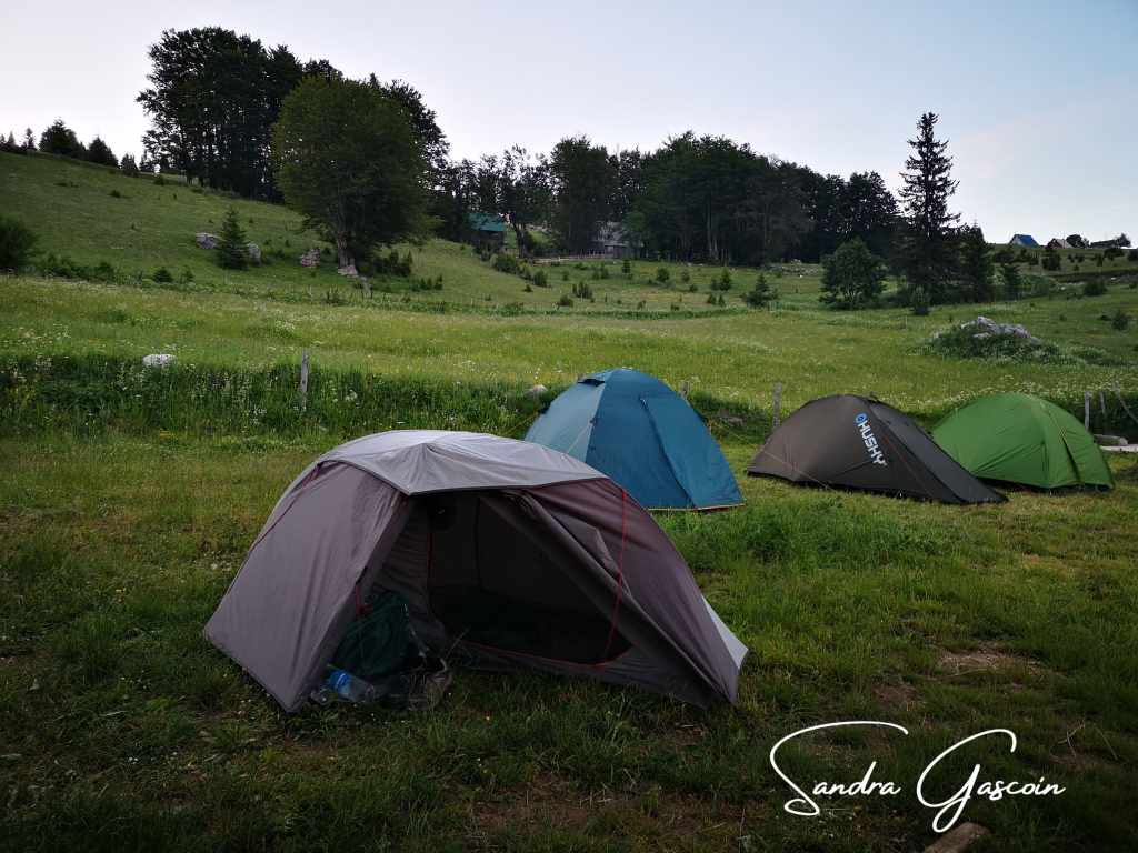 Je me dirige vers un petit camping un peu à l’écart. À mon arrivée, l’espace dédié aux tentes est encore désert : je peux choisir librement mon emplacement. Je m’installe près d’une table de pique-nique. Comme à mon habitude, après avoir monté ma tente, je file me décrasser. Je n’ai pas de gel douche. Heureusement quelqu’un a oublié sa savonnette dans une cabine de douche. Je me l’approprie et l’utilise sans scrupule, me frottant de la tête aux pieds avant de laisser la mousse agir, le temps de laver mes vêtements. À chaque rinçage, l’eau trouble se fait plus claire, passant du brun foncé au jaune pâle. Le résultat n’est pas parfait, mais il suffira. Sous le jet brûlant, je prolonge le plaisir, savourant la chaleur qui me délasse. La vapeur m’enveloppe en sortant de la cabine. Revigorée, je regagne ma tente, étendant mon linge sur une corde entre deux arbres. La tente dressée, les ablutions accomplies, le linge propre : il est temps de rejoindre Žabljak pour me ravitailler.