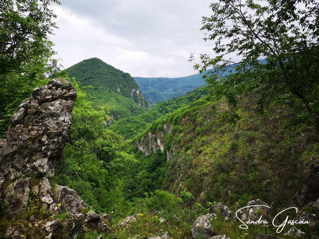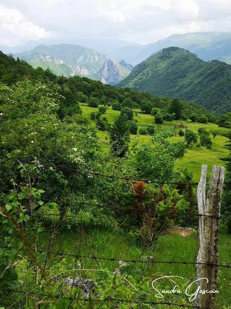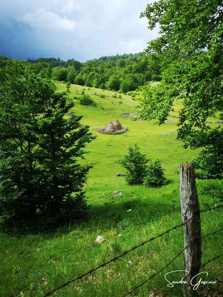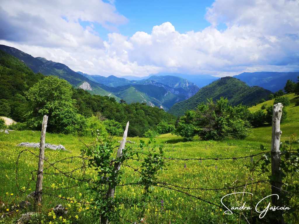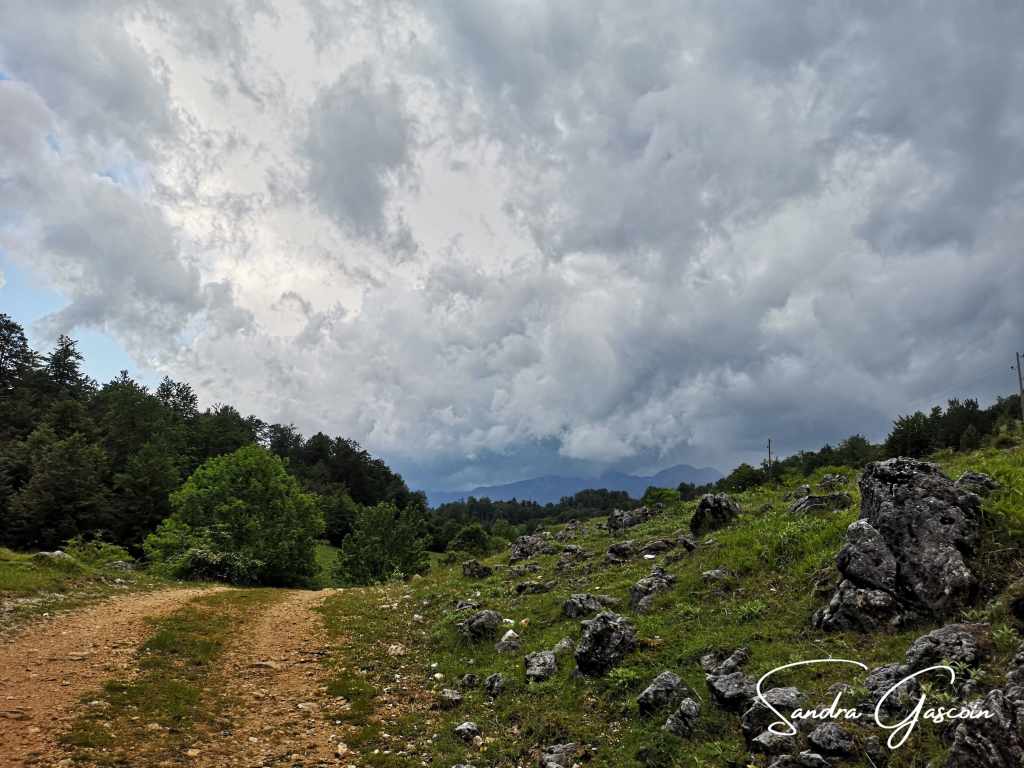 Je remonte au-dessus de Dubočani, la piste est belle et facile. Je cherche une source d’eau, il n’y a rien par ici. Je déniche une citerne enterrée dans un jardin d’une cabane déserte. Je n’arrive pas à l’ouvrir. Je repars bredouille. Ça va devenir problématique. Je compte sur le village de Blace pour me ravitailler avant la nuit. Pour y aller, la Via Dinarica quitte la piste et bifurque vers le Vranske Stijene (1299m) longeant la crête au-dessus de la gorge de la Rakitnica. Je peux aussi tout simplement poursuivre sur la piste. S’il se met à pleuvoir ou faire de l’orage, je pourrais peut-être rejoindre une ferme et m’y abriter. Si je marche sur la crête, ce sera « marche ou crève ». C’est sur la piste que je rencontre la première randonneuse du trail. Elle est néerlandaise et randonne également toute seule. Elle a commencé en Albanie trois semaines plus tôt. Nous échangeons quelques informations sur le parcours qui nous attend. Elle me rassure en me disant que la météo devrait rester clémente. J’aimerais pouvoir partager son optimisme ! Elle a préféré éviter le détour par la crête. Au bout de dix minutes, nous poursuivons chacune dans la direction opposée.