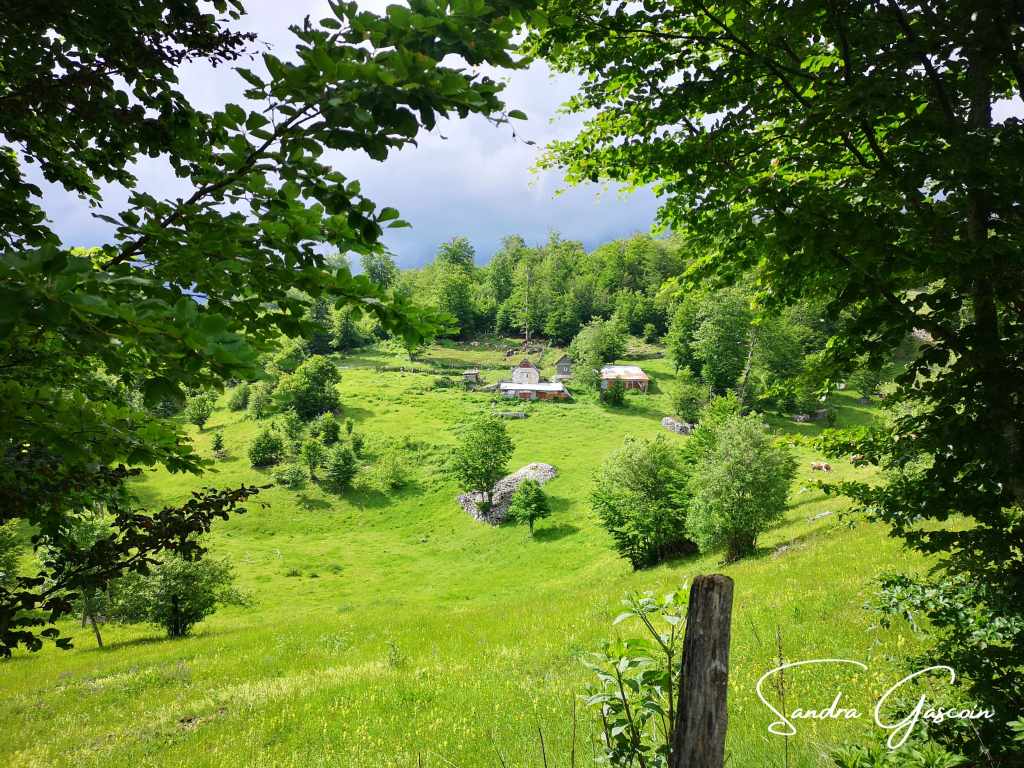 Je reste à l’abri, attendant que l’averse se calme avant de planter ma tente. Je préfère rester cachée derrière la chapelle, aux regards et aux éléments. J’entends des bêlements, un énorme troupeau de moutons se dirige vers le petit étang en contre-bas. Finalement, le village semble encore être utilisé en période estivale pour l’élevage.