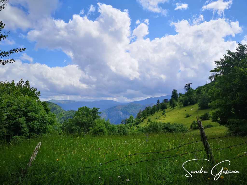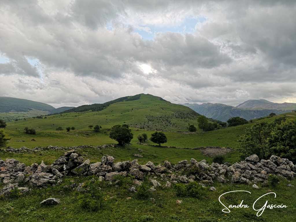 Je marche sur un haut plateau composé de pâturages verdoyants entourés de murets de pierres. Je passe devant un troupeau de moutons, je fais un signe au couple de bergers pour les saluer, les chiens me laissent en paix. Je savoure cette promenade, le chant des insectes et des oiseaux, le tintement des cloches des brebis, la brise rafraichissante. Face à moi, les nuages se regroupent pour former un amas compact et menaçant. La pression retombe, le vent se lève, j’enfile en vitesse ma veste de pluie et relève la capuche. Je presse le pas pour arriver au village avant le déluge. Les premières gouttes s’écrasent. La situation est encore sous contrôle. Je quitte la piste pour emprunter un chemin herbeux. Blace se trouve plus vers le bord du plateau, au bord de la falaise. Un petit étang pourra me fournir de l’eau si je n’en trouve pas dans le village. Au fur et à mesure que je m’approche, je m’aperçois que quelque chose ne colle pas dans ce tableau : je vois bien la petite chapelle mais je ne vois pas de maison, pas d’activité, rien. Ce village n’est plus habité, la quasi-totalité des bâtiments est en ruine. La pluie redouble d’intensité : est-ce que je devrais m’abriter dans cette ruine encerclée par les ronces ? J’opte pour la chapelle. Une camionnette est garée devant. Y aurait-il de la vie ici ? La chapelle est fermée, le porche est inondé : l’averse est impitoyable, le vent son complice. Je me cache derrière la chapelle, je suis protégée des bourrasques de pluie. Je me colle au mur, le toit m’offre 20 centimètres de protection ! Je suis bien dépitée : le village est abandonné ou presque, je n’ai pas d’eau et il pleut comme vache qui pisse. Toutefois, un petit problème semble pouvoir être résolu : celui de l’eau. Je place mes trois bouteilles à la sortie de la gouttière et les remplis ainsi en un temps record. L’eau est légèrement trouble, mêlée de quelques impuretés et insectes, mais je la filtrerai et la ferai bouillir avant de la consommer. Cela fera l’affaire.
