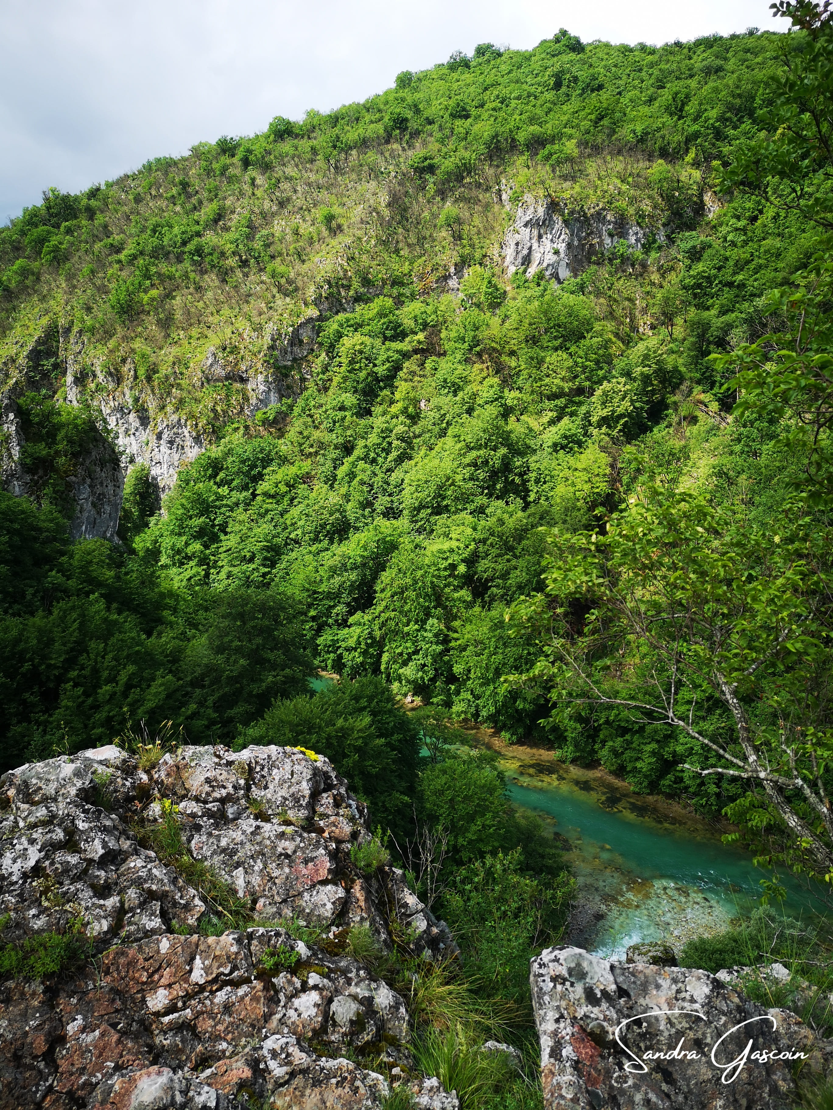 Le ciel reste menaçant au lever. Ce qui m’inquiète pour l’instant est la traversée de la zone minée dans laquelle je me trouve. J’ai la fâcheuse habitude de me tromper de chemin, cela pourrait être fatal. Je dois garder à l’esprit qu’il y a des mines et que je dois impérativement rester sur le tracé de la Via Dinarica. J’ai donc le nez orienté à la fois vers le sol et l’écran de mon téléphone. Le chemin redescend vers la Rakitnica, un affluent de la Neretva. Profitant de l’accès aisé à la rive, je me lave le visage et les avant-bras, lave une culotte et reprends de l’eau. Une petite grenouille marron cachée dans la vase attire mon attention par sa fuite à mon approche. Je me dis alors que je ne verrais probablement aucun animal si ceux-ci se contentaient de rester immobiles, tant leur camouflage est parfait.