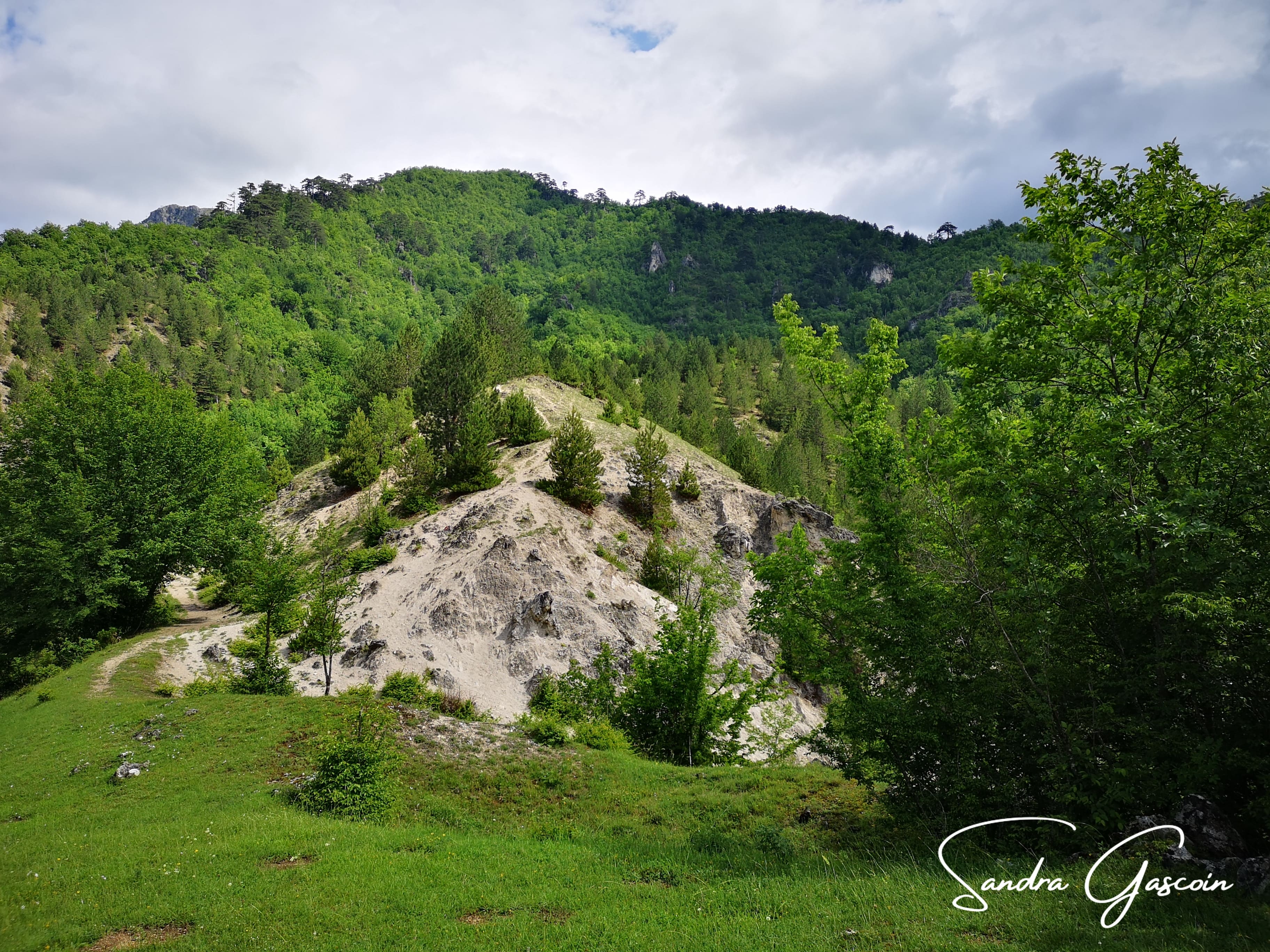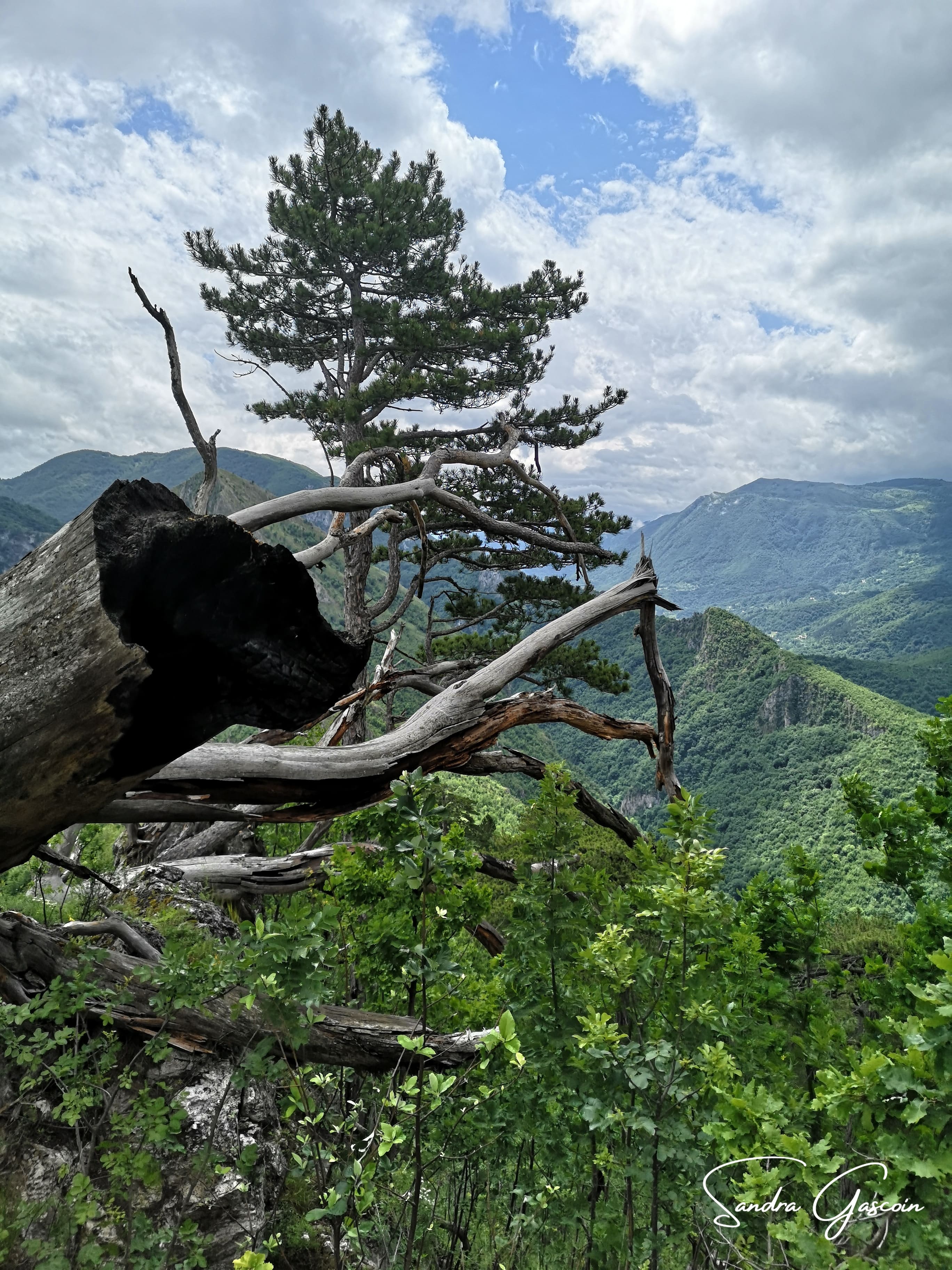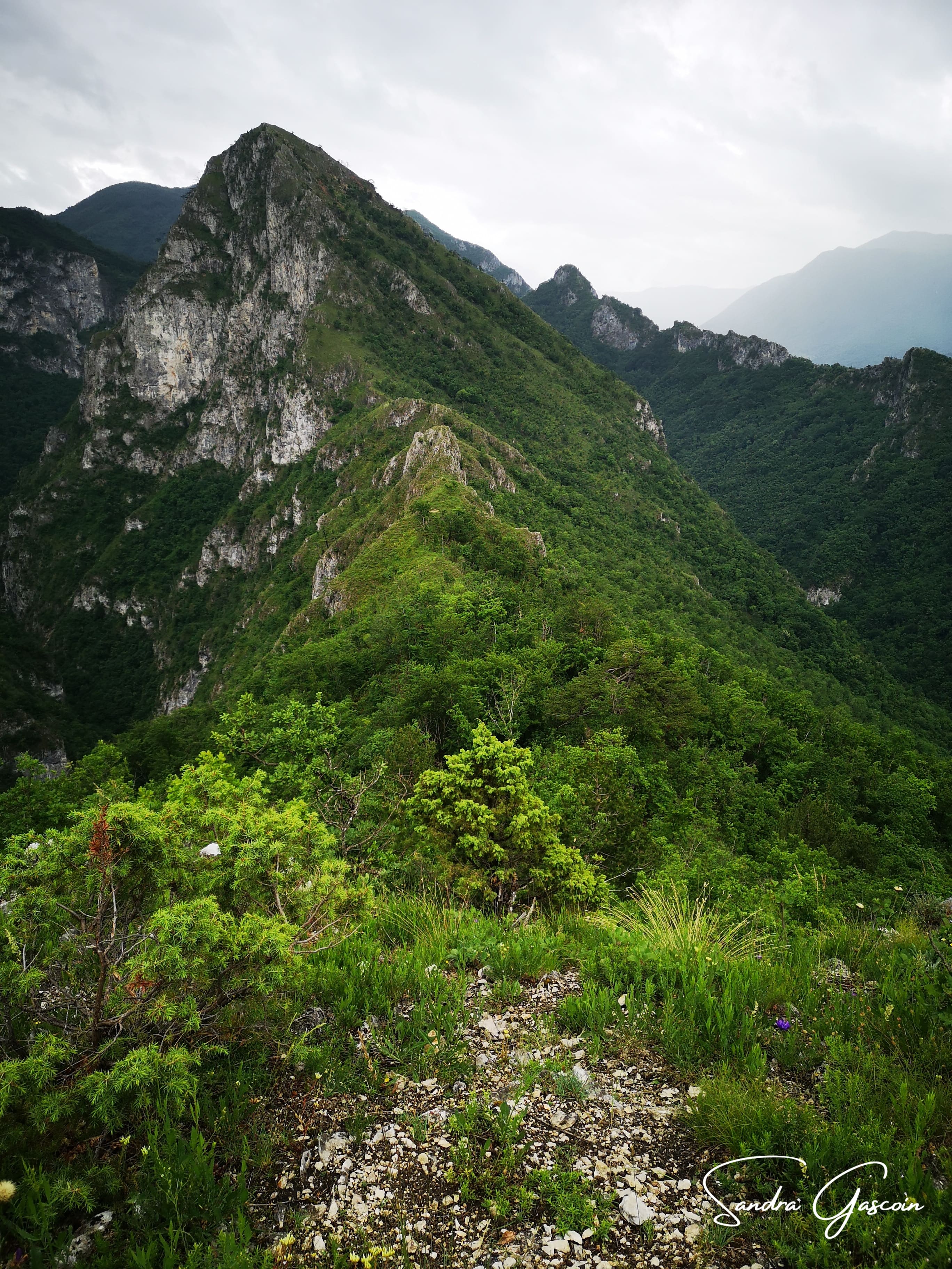 Le chemin remonte de manière corsée sur un kilomètre et demi et quatre cents mètres de dénivelé jusqu’à un petit sommet. Il se faufile entre maquis, rocailles, arbres tombés. Certains passages délicats me font pester, d’autres désespérer. J’avance lentement, considérant chaque pas. Les nuages noirs semblent vouloir m’intimider aussi. Est-ce que je vais arriver à m’abriter avant le déluge ?