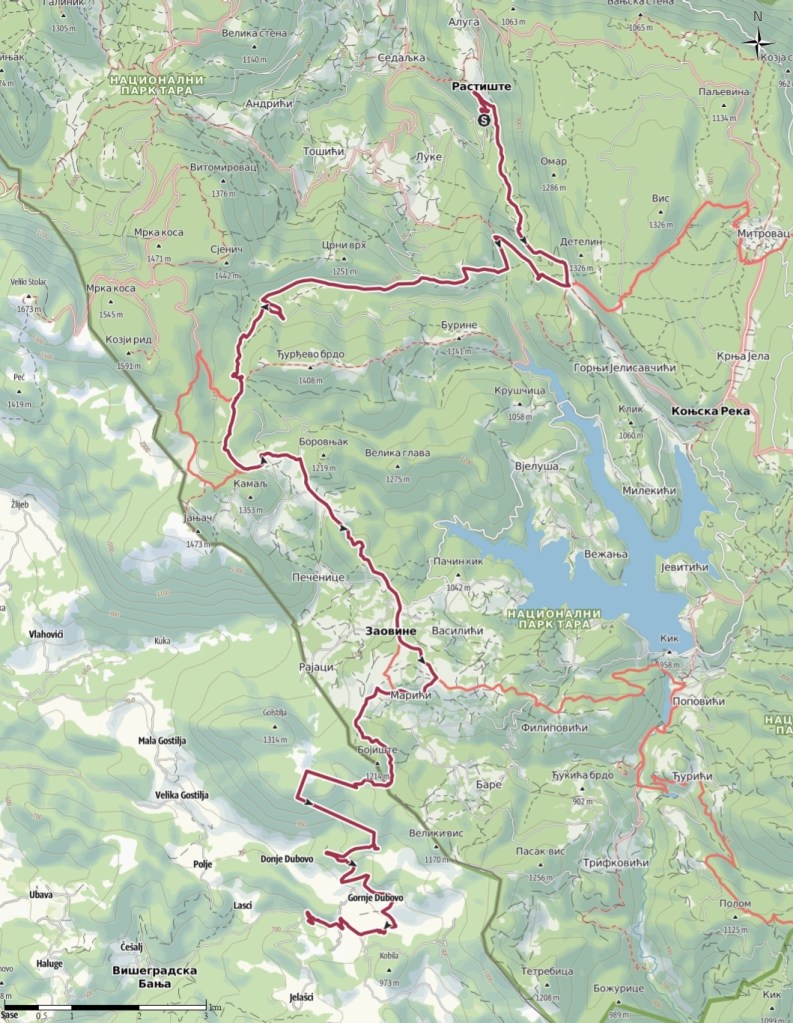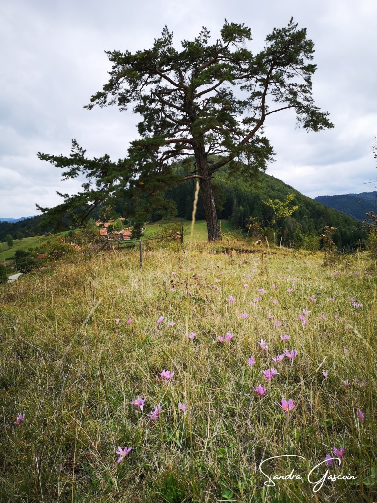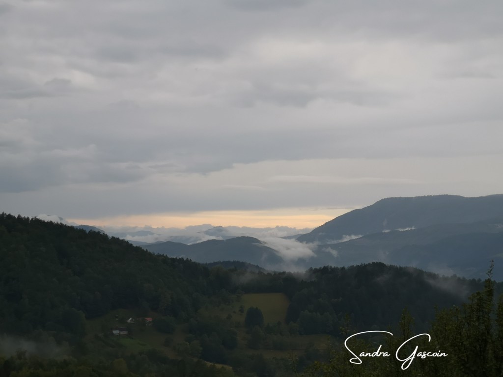 Après Zaovine, j’ai oublié de bifurquer, poursuivant sur la route déserte. Les nuages s’accumulent ostensiblement au-dessus de ma tête. Lorsque je m’aperçois de mon erreur, j’hésite : continuer sur la route vers le grand lac de Zaovine, ou bien continuer sur le Green Trail vers la Bosnie et passer la frontière dans les forêts. La première solution représente un détour de deux jours et de la marche ou du stop sur la route très fréquentée reliant Mokra Gora à Višegrad. La deuxième est synonyme de gain de temps et de plus de solitude. Quelques gouttes de pluie s’écrasent, je me couvre et me dirige directement vers la frontière à travers les forêts. Je cherche de l’eau, les hameaux sont déserts voire abandonnés. Je réfléchis à monter ma tente sous le porche d’un petit cimetière, renonce en me fiant à ma bonne étoile. La pluie a cessé, je continue. En passant la frontière qu’aucun marquage ne matérialise, je navigue à l’aveuglette : la piste forestière est bien existante, son tracé inconnu de mon application. La pluie reprend de plus belle, je presse le pas, abandonne l’idée de garder les pieds au sec, mon point bleu avançant sur une zone blanche de la carte. Aucune indication sur place pour m’indiquer la meilleure direction. Marchant au hasard, je m’approche bientôt d’une piste dont le tracé est sur mon app. Bien que ce n’était pas du tout là où je voulais arriver, je suis heureuse de pouvoir à nouveau m’orienter. La pluie redouble d’intensité, l’orage se rapproche, je compte les secondes entre l’éclair et le tonnerre : neuf secondes… mais j’ai oublié comment calculer la distance ! Je cours presque sur la piste qui s’étire en longs serpentins. Lorsque j’atteins le hameau Gornje Dubovo, la pluie s’arrête soudain. Je retrouve une route asphaltée qui descend vers la vallée de la Drina. Il est temps de trouver un abri en dur pour installer mon bivouac.