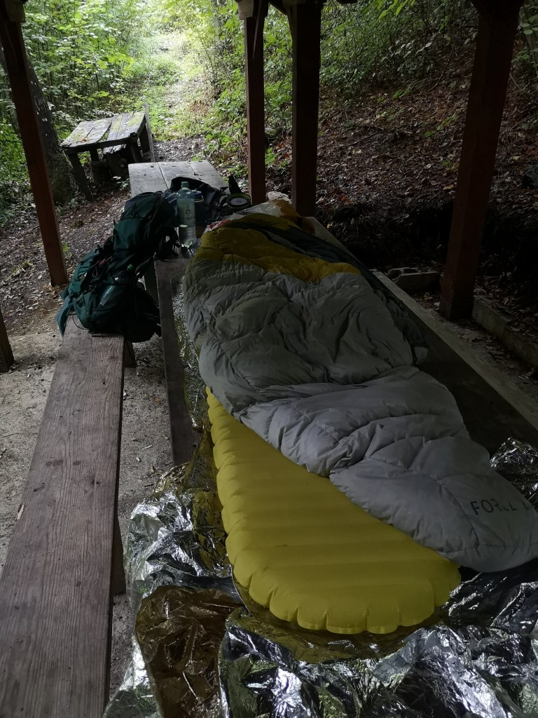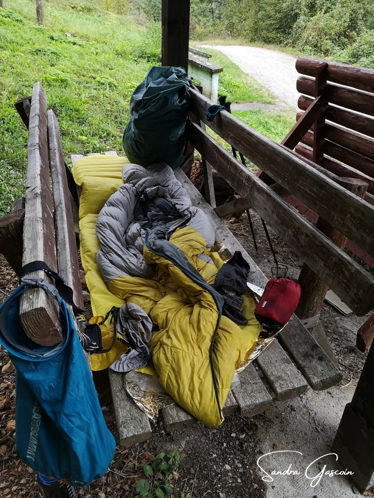 La pluie facétieuse reprend après un bref répit. Je trouve le second abri sur une route secondaire. Il est protégé par les arbres du côté de la route principale et surplombe de l’autre la route secondaire ce qui en fait un coin idéal pour bivouaquer. Trempée jusqu’aux os, je commence par m’extirper de mes vêtements qui me collent à la peau. J’enfile mon pyjama bien chaud puis suspends sur ma corde mon linge mouillé. Le taux d’humidité dans l’air me laisse toutefois peu d’espoir quant à un séchage efficace et rapide.
