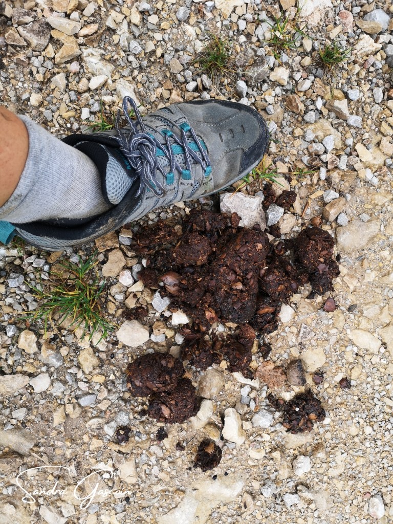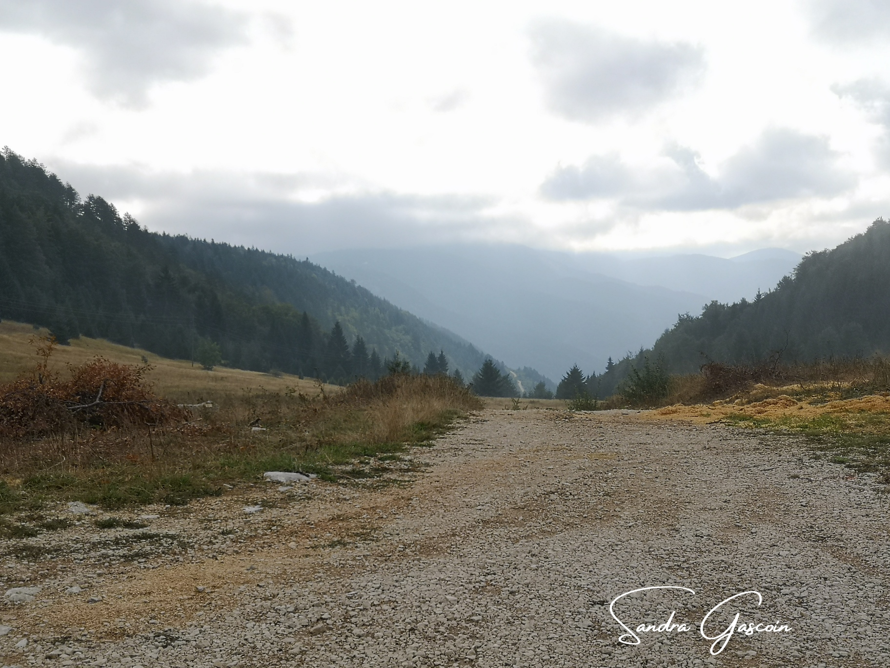 Je retourne sur la piste qui remonte vers les sommets. La piste est en cours de réfection. Je me suis engagée sur l’ancien tracé, j’arrive dans une impasse, il me faut grimper le talus vers la nouvelle piste, défiant la gravité malgré le poids sur le dos. Ayant raté un raccourci, je continue sur la piste plongée maintenant dans les brumes. Suivant fidèlement le tracé du Green Trail de la Via Dinarica, je me retrouve à nouveau sur un tronçon complètement défoncé et envahi de l’ancienne piste. Je peste intérieurement de ne pas avoir suivi le nouveau tronçon que je rejoins de toute façon quelques centaines de mètres plus loin. Le problème est que le nouveau tracé n’apparait pas sur mon application, la piste pourrait s’éloigner dans une autre direction.