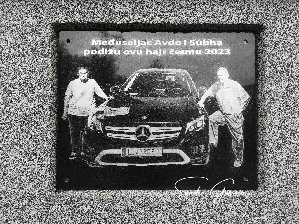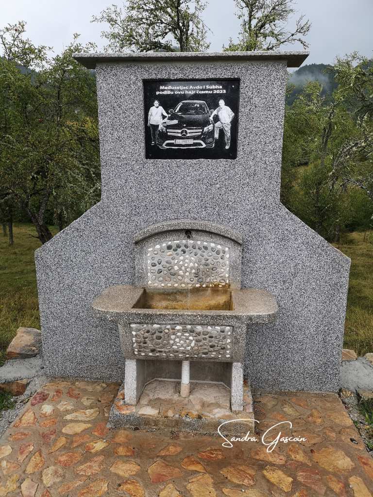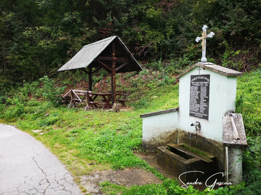 À un embranchement, je tombe sur une fontaine providentielle offerte et construite par Avdo et Subha et un abri de pique-nique. Trop exposée à la vue des automobilistes, je renonce à dormir sur la large table en bois. Un kilomètre plus loin, je devrais trouver un autre abri. J’aviserai lequel se prête le mieux à une nuit paisible, loin des regards.