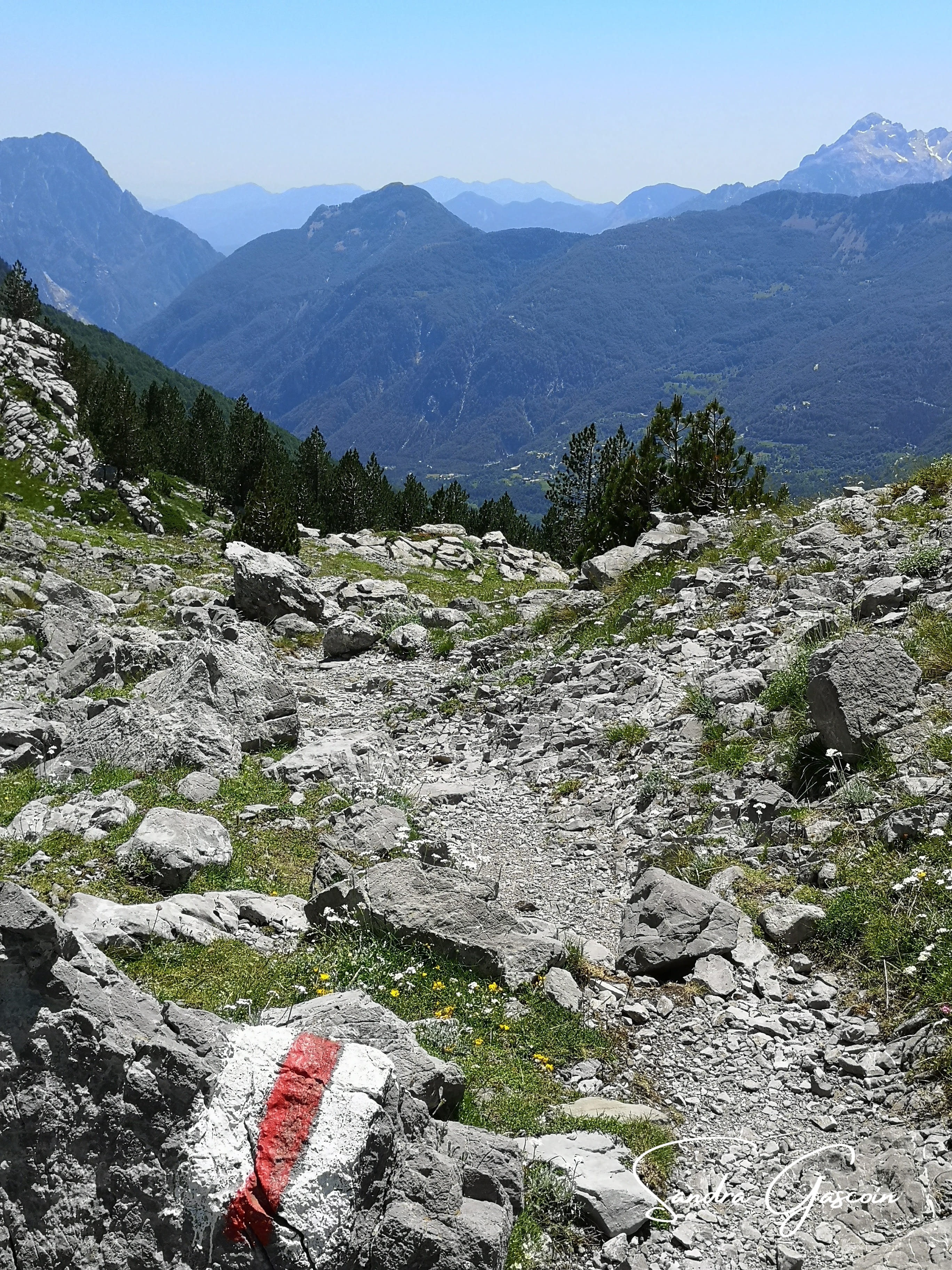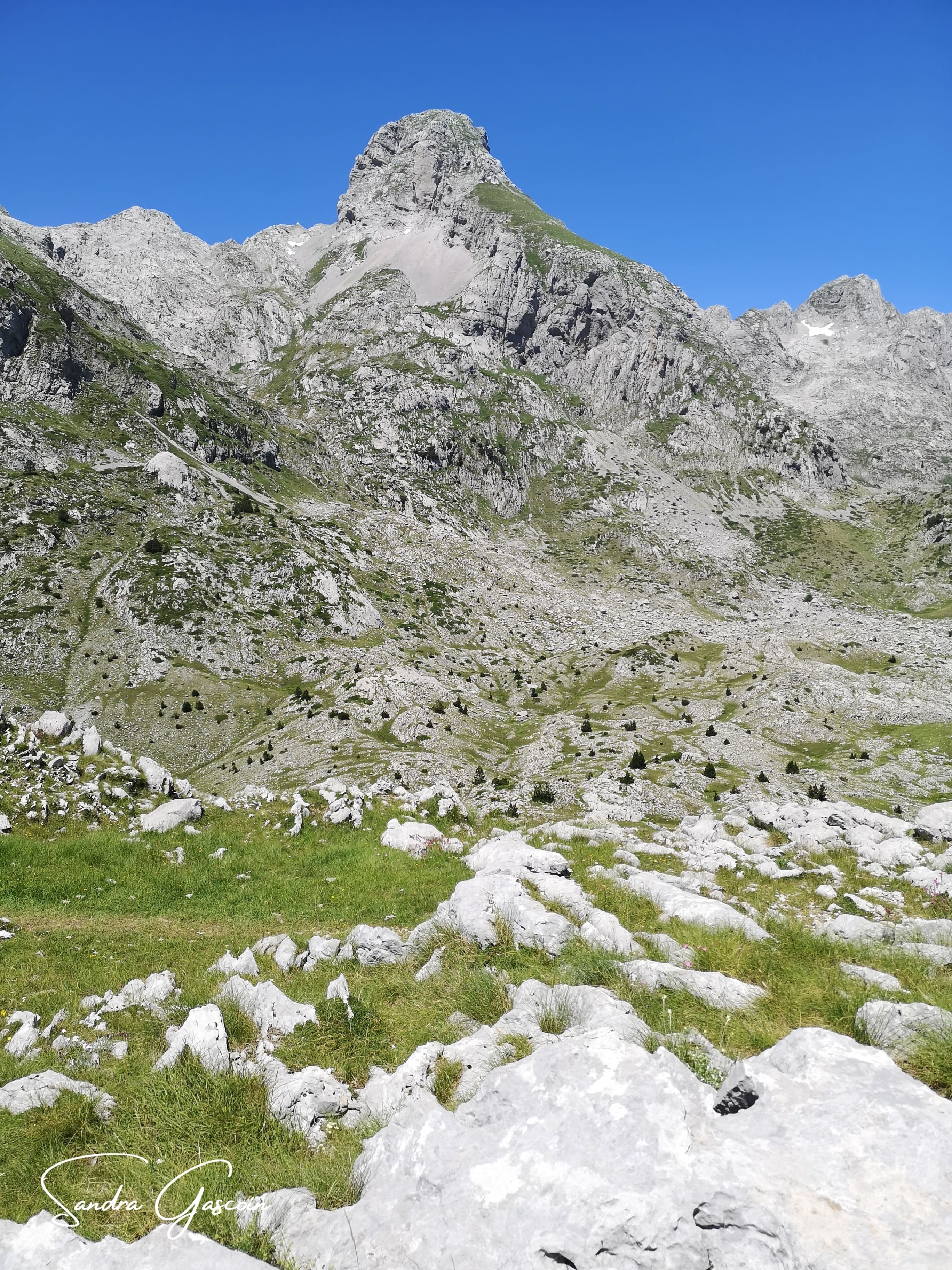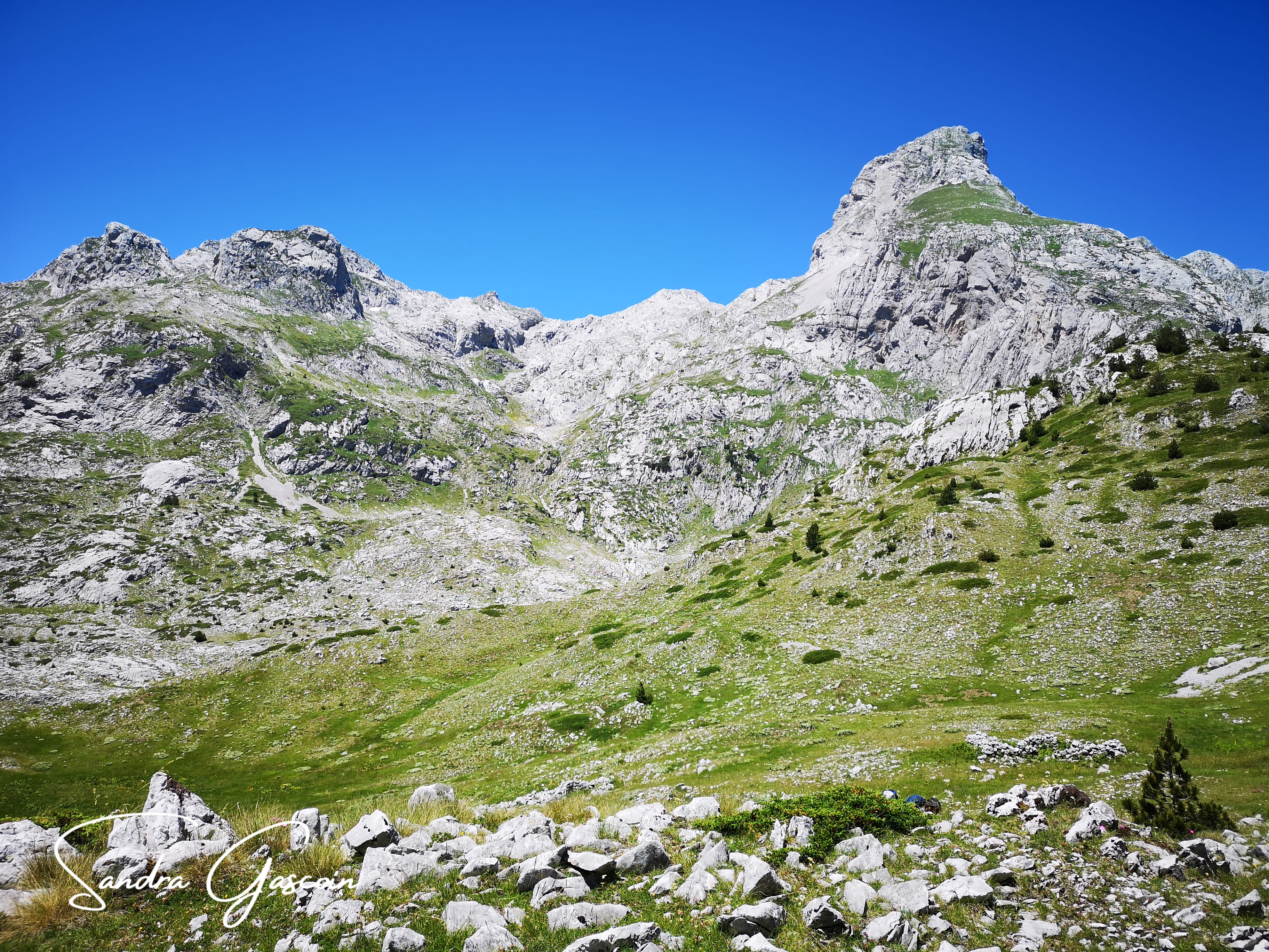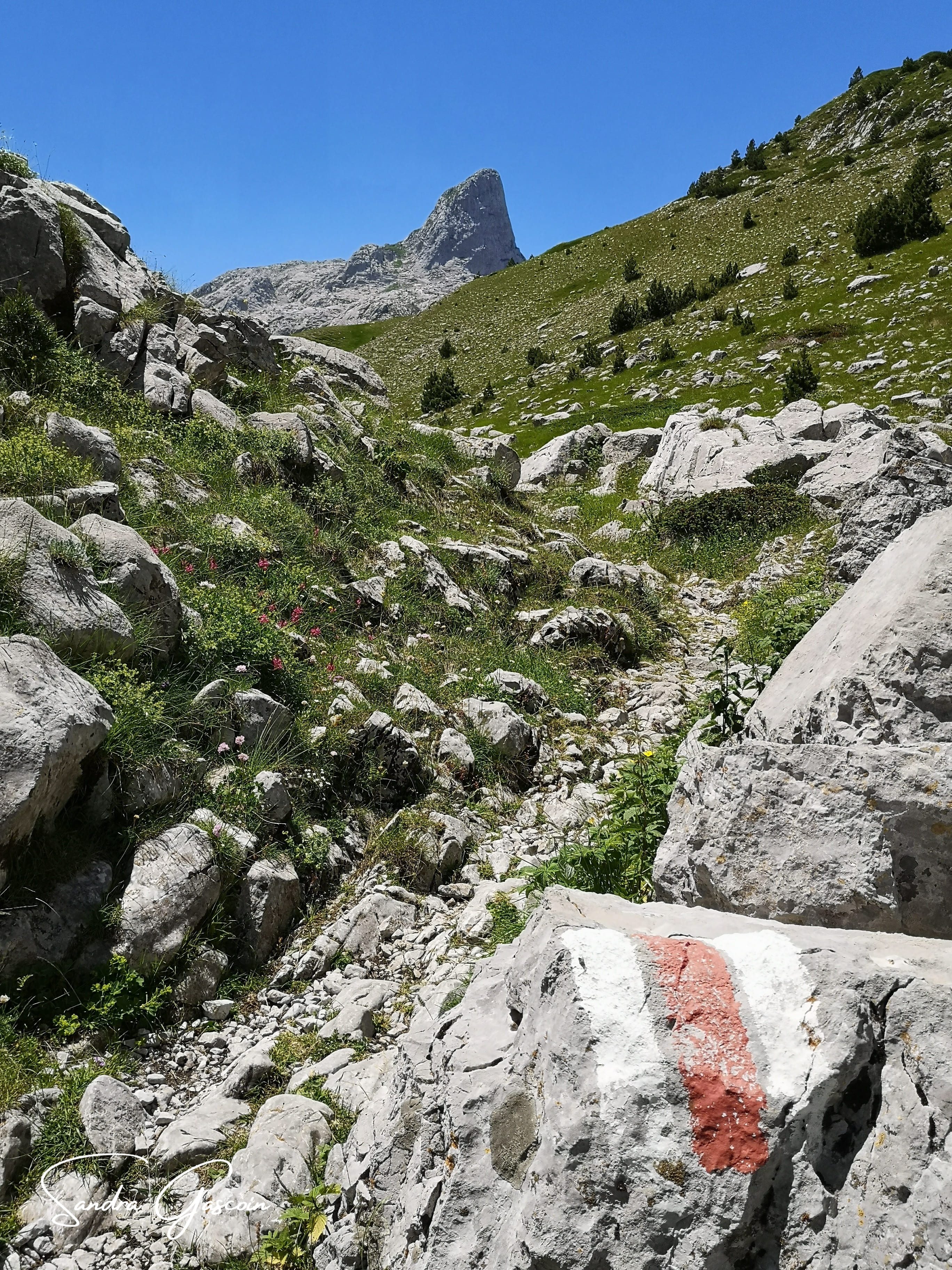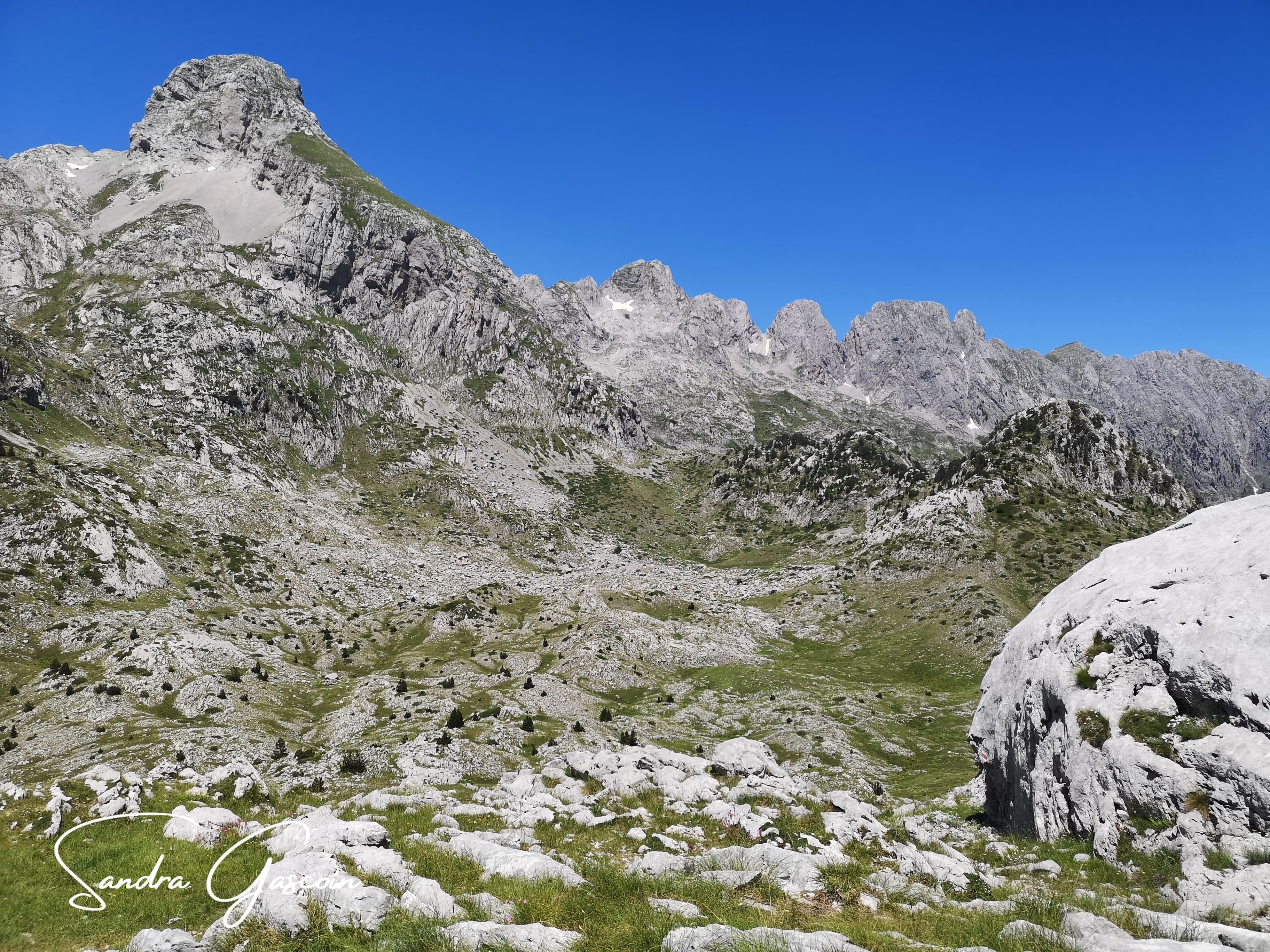 Un premier petit col marque un point de rassemblement pour les randonneurs, qui en profitent pour sortir le sandwich du sac. Je les imite. Mon t-shirt sèche sur le rocher au soleil. Lorsque nous reprenons la marche, c’est presque en procession, chacun suit le même tracé à intervalle régulier. Dans l’ascension vers le col principal, j’entame la conversation avec les Belges ayant commencé leur boucle à Plav. Ils se sont donné cinq jours pour une version raccourcie du tour des pics des Balkans. L’une des Belges souffre particulièrement de l’altitude : sous l’ardeur du soleil, l’absence d’ombre et le manque d’eau, la randonnée peut vite tourner ausupplice.