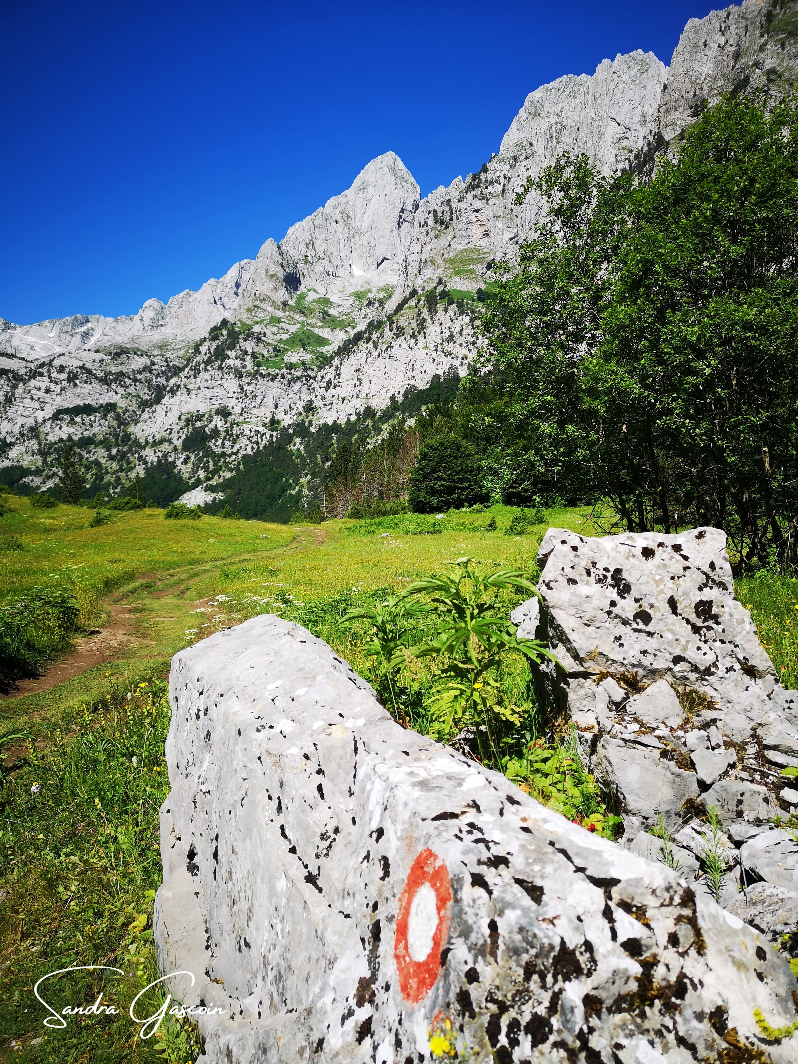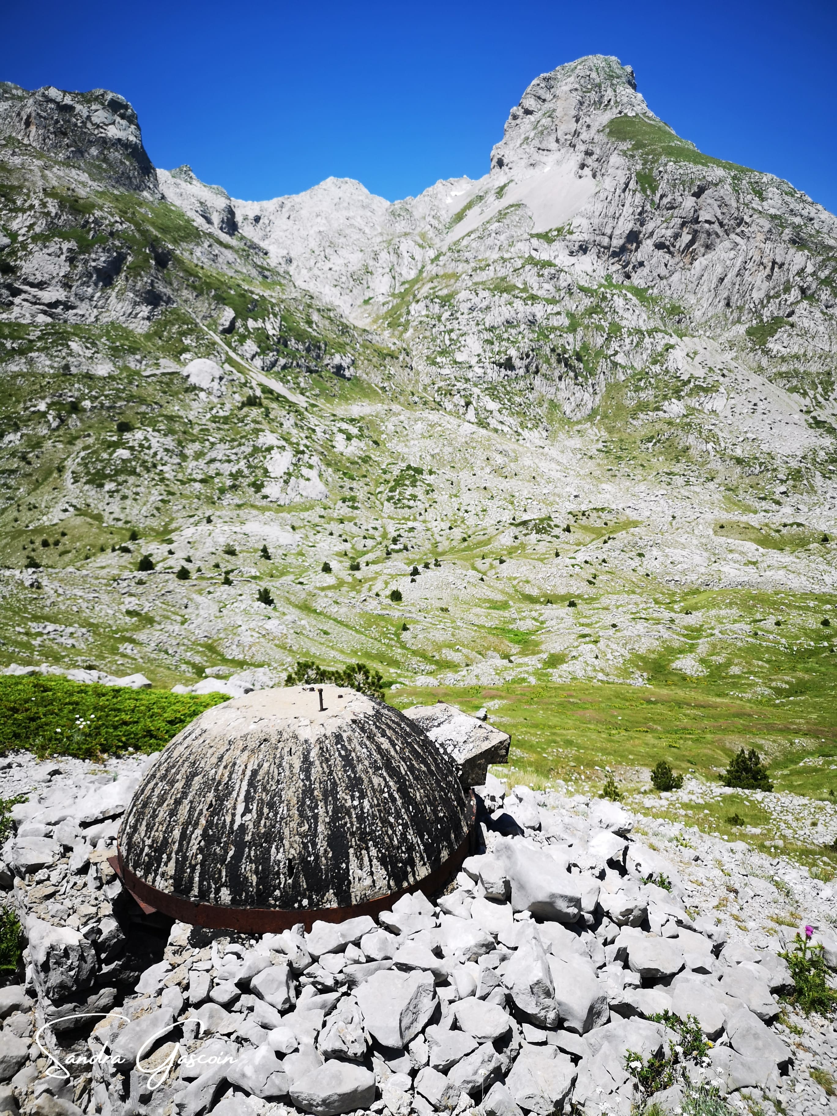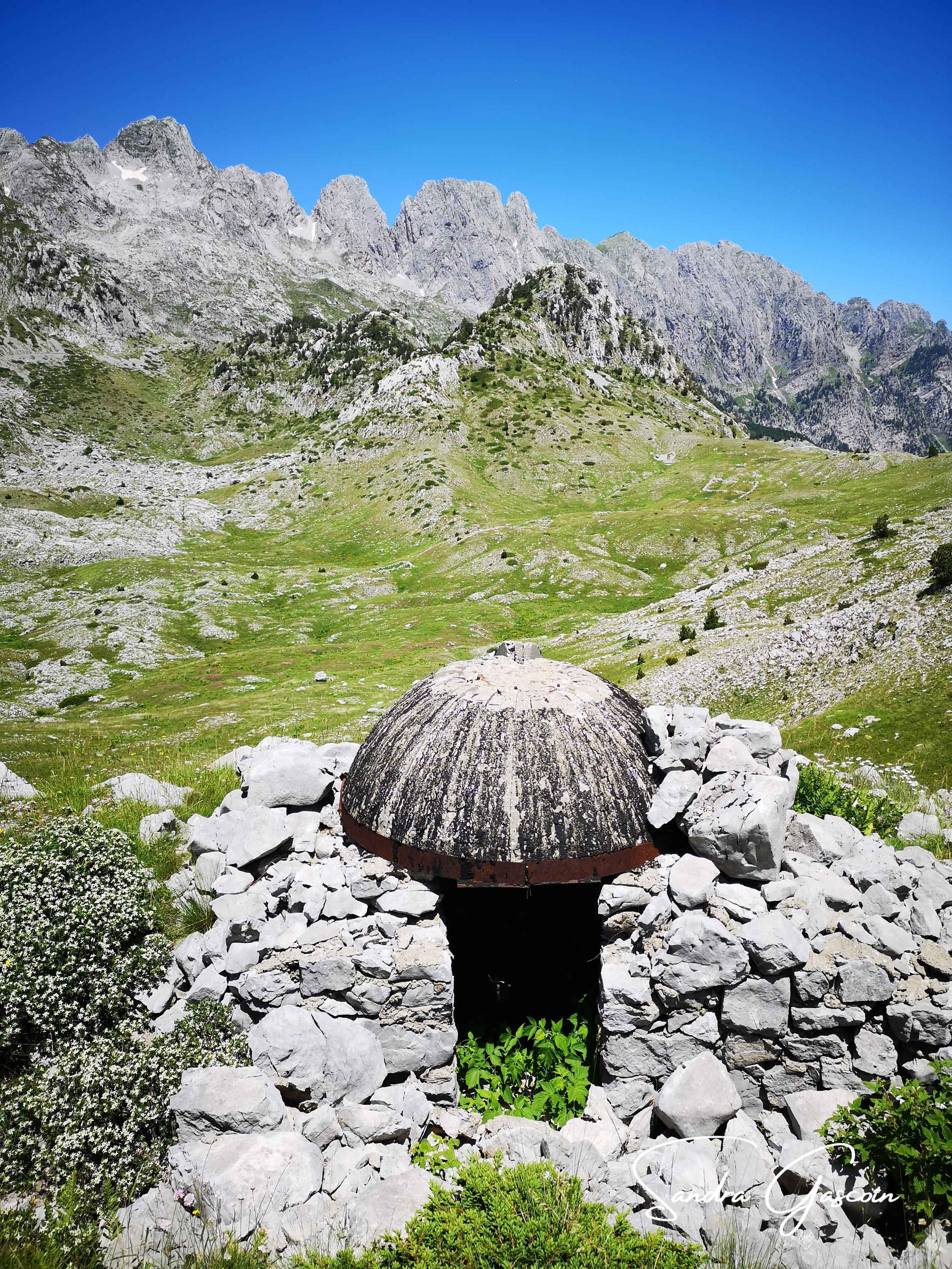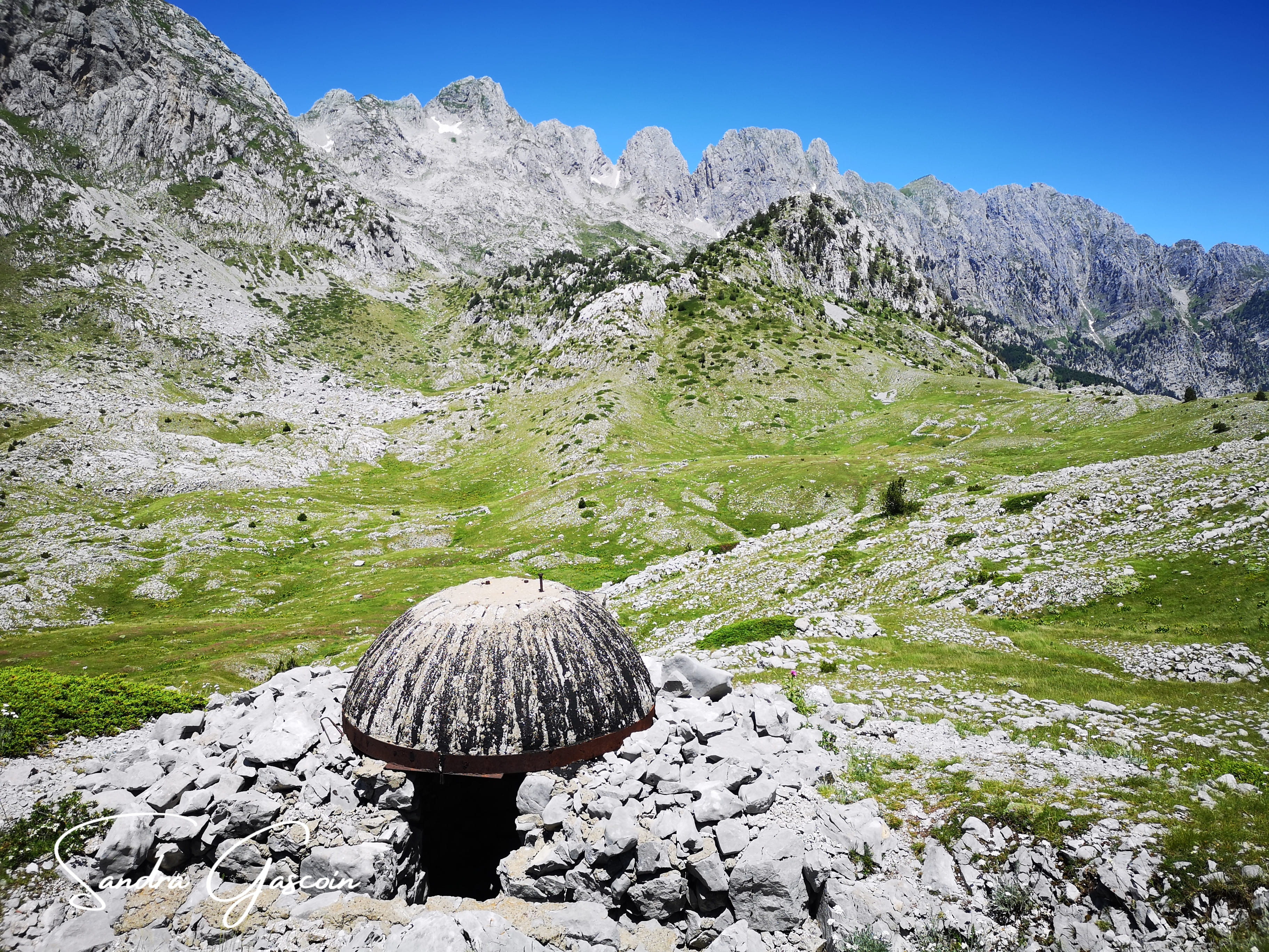 Deux jeunes femmes passent à proximité mais s’égarent bientôt contre une falaise. Se rendant compte de leur erreur, elles rebroussent chemin. Leur méprise me met sur la piste d’une source d’eau providentielle, dissimulée à quelques pas du sentier. Je m’y abreuve avidement et remplis mes bouteilles en prévision de l’ascension du col de Qafa e Pejës (1 742 mètres). L’émerveillement m’accompagne à chaque pas dans ce décor grandiose où mon appareil photo est sollicité en permanence. Sans la contrainte de l’eau, l’idée de bivouaquer dans ces montagnes m’aurait séduite. Des casemates circulaires, vestiges d’un autre temps, se fondent dans les rochers, veillant sur la vallée comme des sentinelles silencieuses et rappelent que la frontière albanaise est désormais franchie.