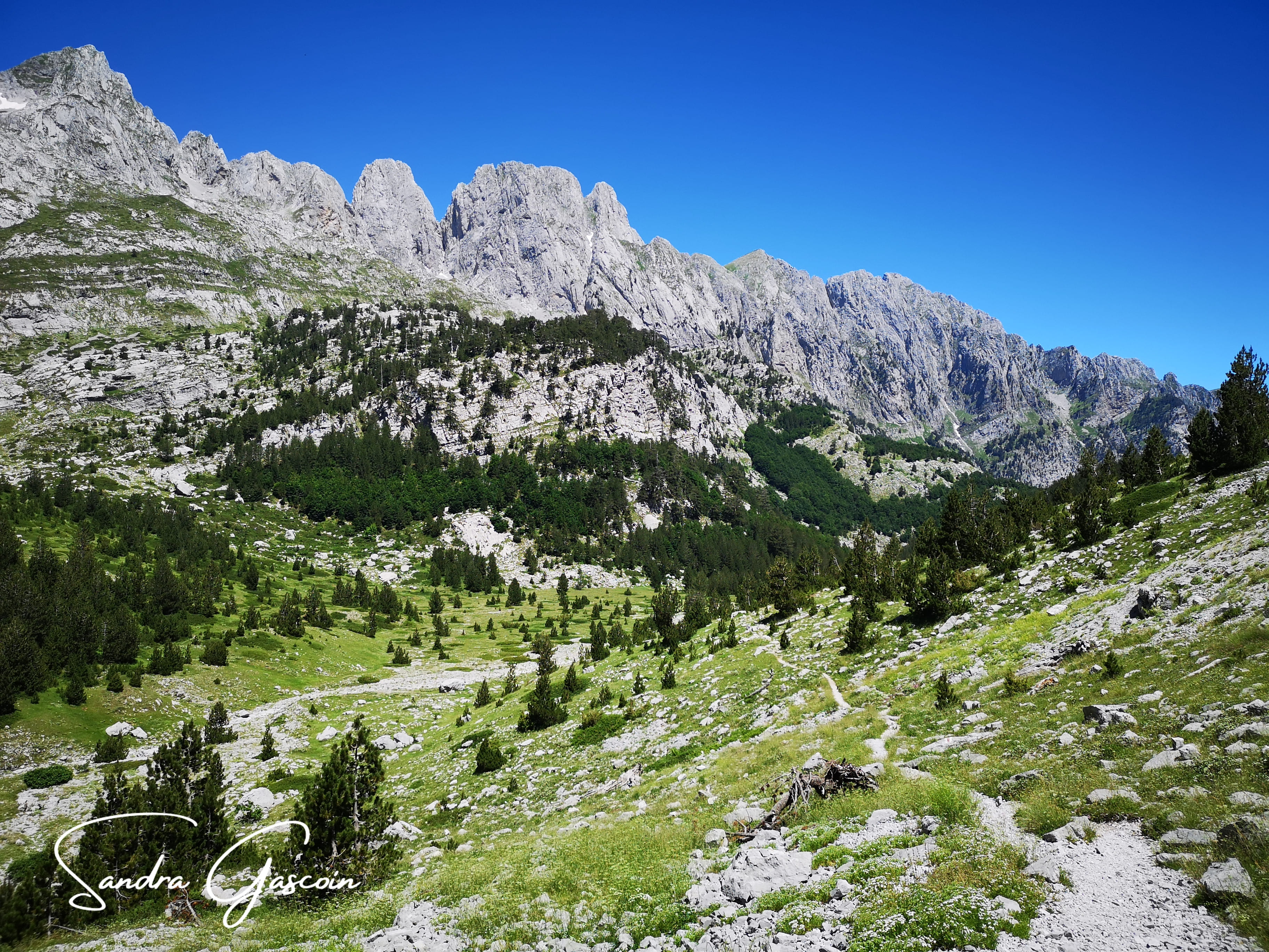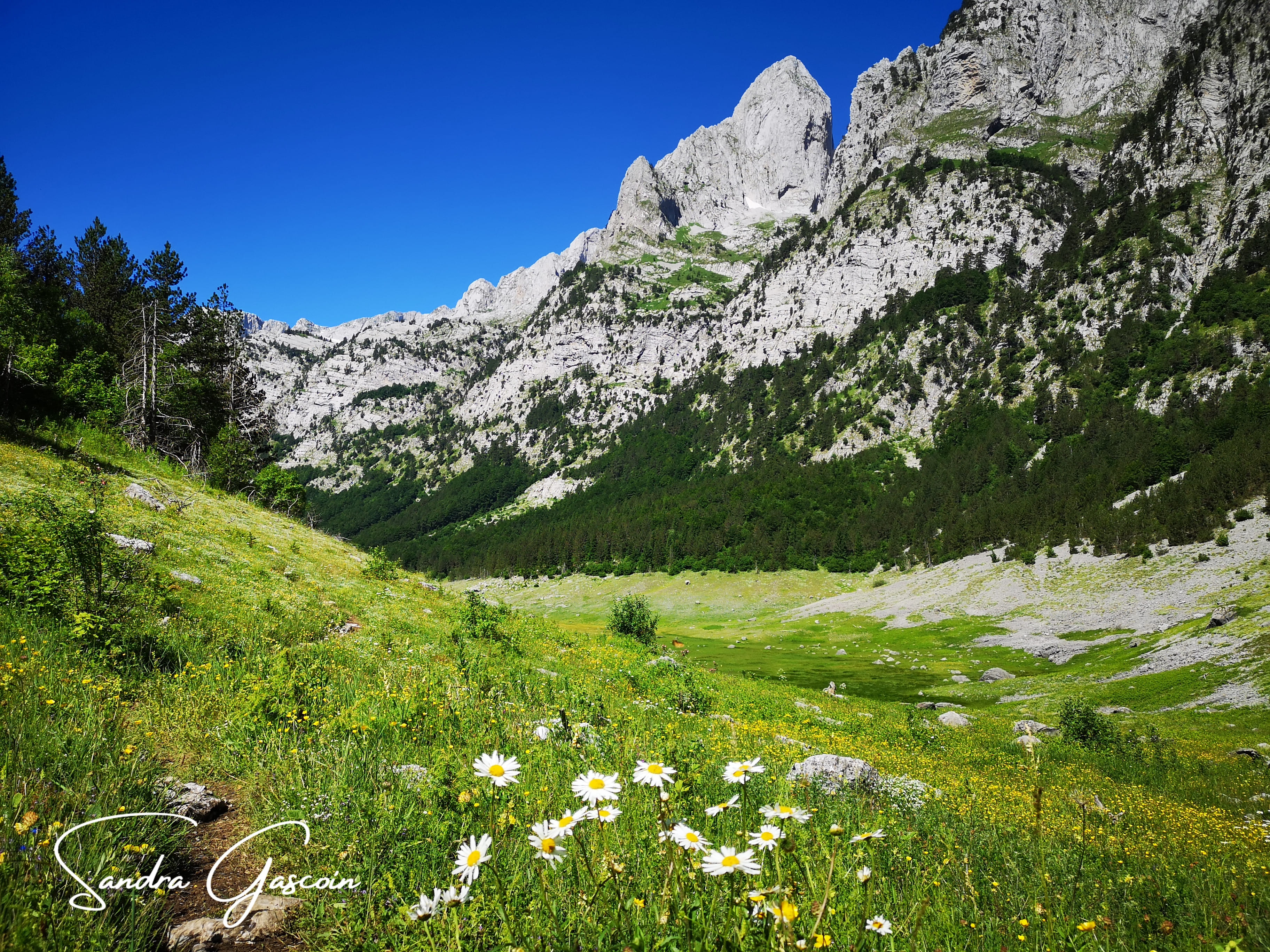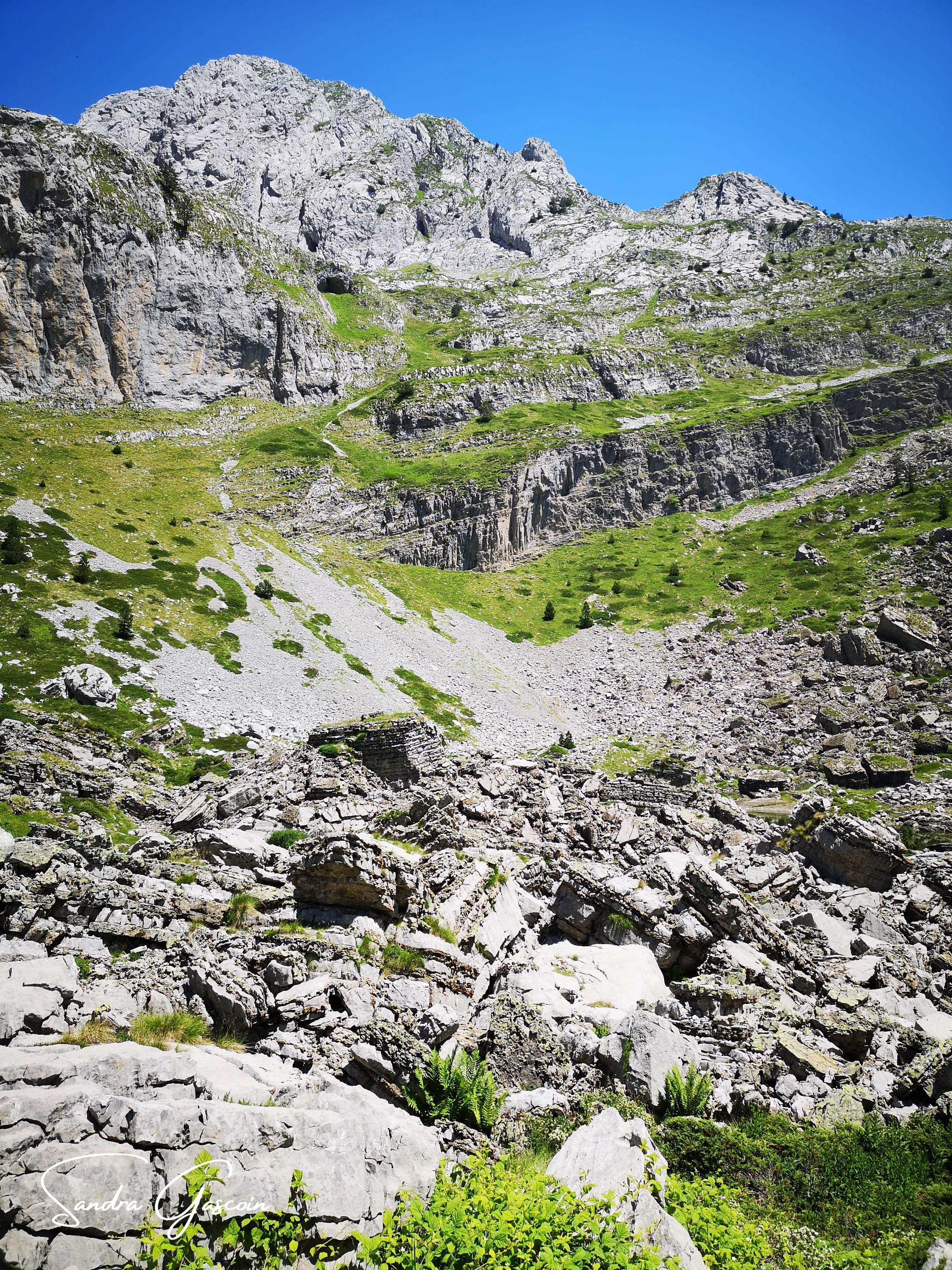 Deux jeunes femmes passent à proximité mais s’égarent bientôt contre une falaise. Se rendant compte de leur erreur, elles rebroussent chemin. Leur méprise me met sur la piste d’une source d’eau providentielle, dissimulée à quelques pas du sentier. Je m’y abreuve avidement et remplis mes bouteilles en prévision de l’ascension du col de Qafa e Pejës (1 742 mètres). L’émerveillement m’accompagne à chaque pas dans ce décor grandiose où mon appareil photo est sollicité en permanence. Sans la contrainte de l’eau, l’idée de bivouaquer dans ces montagnes m’aurait séduite. Des casemates circulaires, vestiges d’un autre temps, se fondent dans les rochers, veillant sur la vallée comme des sentinelles silencieuses et rappelent que la frontière albanaise est désormais franchie.