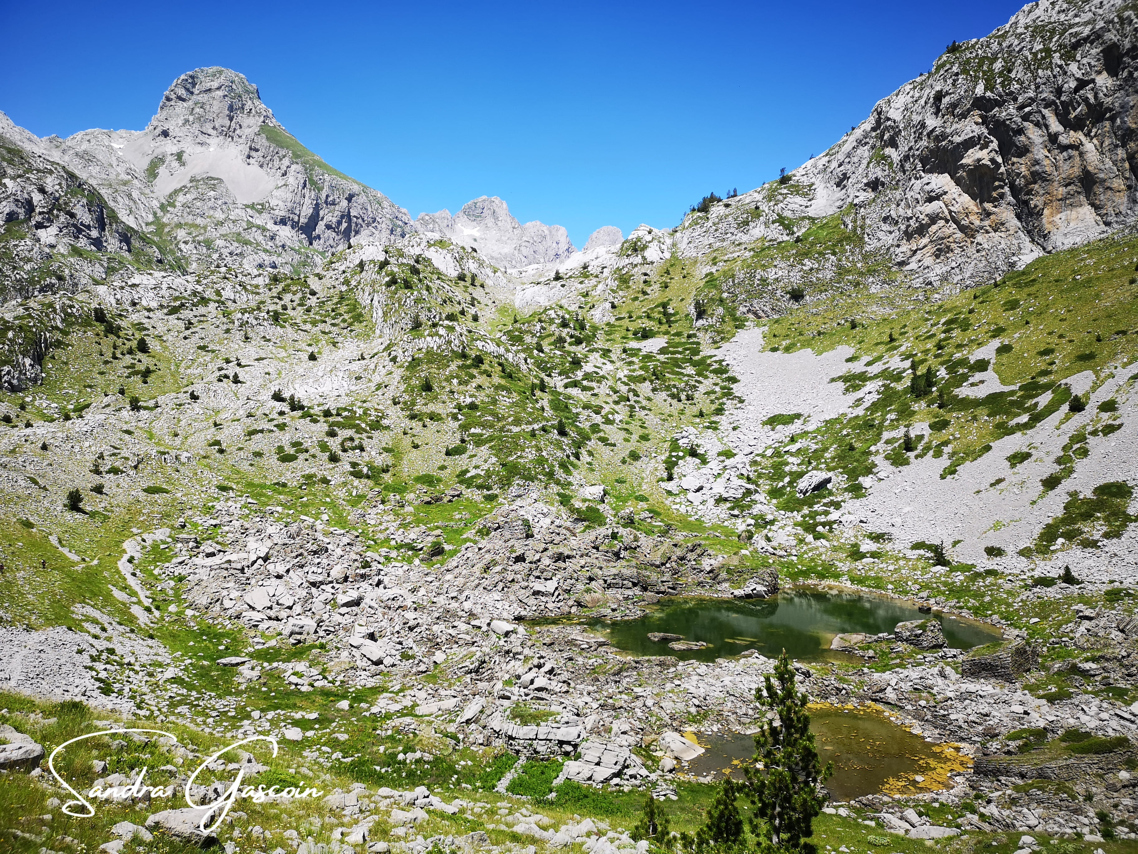 Aux environs de huit heures, je me lance à leur suite. La rivière Grija serpente à travers une vallée verdoyante baignée par la lumière dorée du matin, encadrée par des sommets chauves et rocailleux dont les silhouettes se découpent sur le ciel azur. À la barrière du parc national de Prokletije, un gardien matinal encaisse les droits d’entrée. Je poursuis sur la piste qui mène jusqu’au lac Ropojan, vaste marécage asséché, blotti au fond de la vallée, sous l’œil vigilant des montagnes acérées qui en forment l’écrin. Le sentier s’élève alors brutalement vers l’azur, sous l’implacable soleil. Malgré mon chargement, je dépasse plusieurs randonneurs visiblement peu entraînés. Des constructions de fortune en bois et en pierres m’offrent le confort d’un banc sous le couvert des lambeaux d’une toile plastique flottant à la brise.