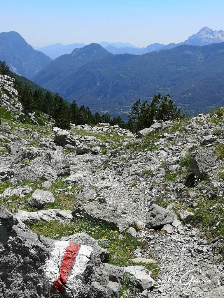 Au col, une falaise offre un coin d’ombre salvateur pour une courte pause. Curieuse, je m’enquiers du contenu de leurs sacs, apparemment aussi volumineux que le mien. Pourtant, ils logent et se restaurent en gîte à chaque étape, ne transportant guère plus que leurs vêtements. Pour cinq jours, leur chargement me semble excessif, mais chacun voyage selon ses propres exigences. Moi-même, je ne saurais renoncer au confort de vêtements de rechange ou à ma popote pour cuisiner.
