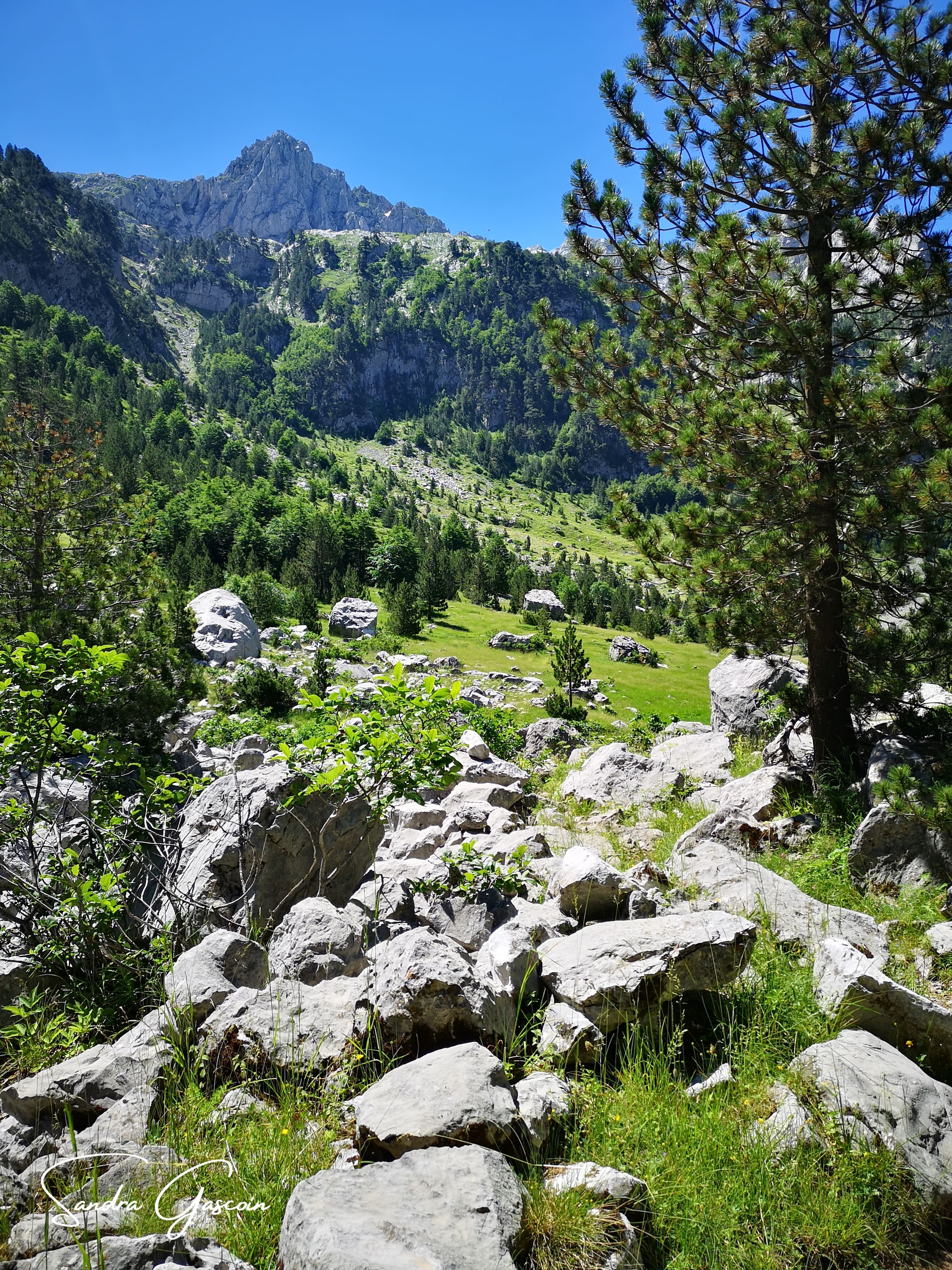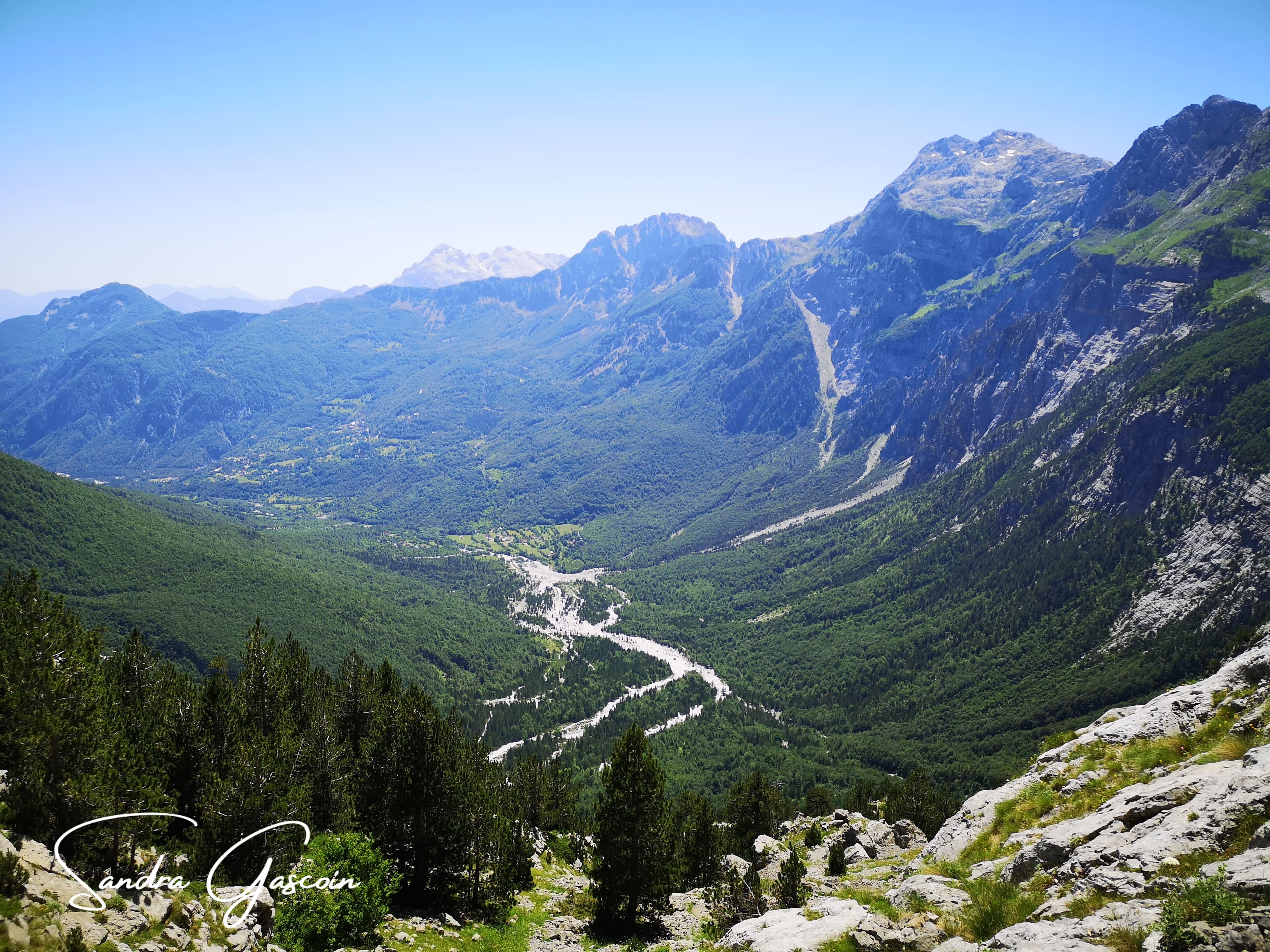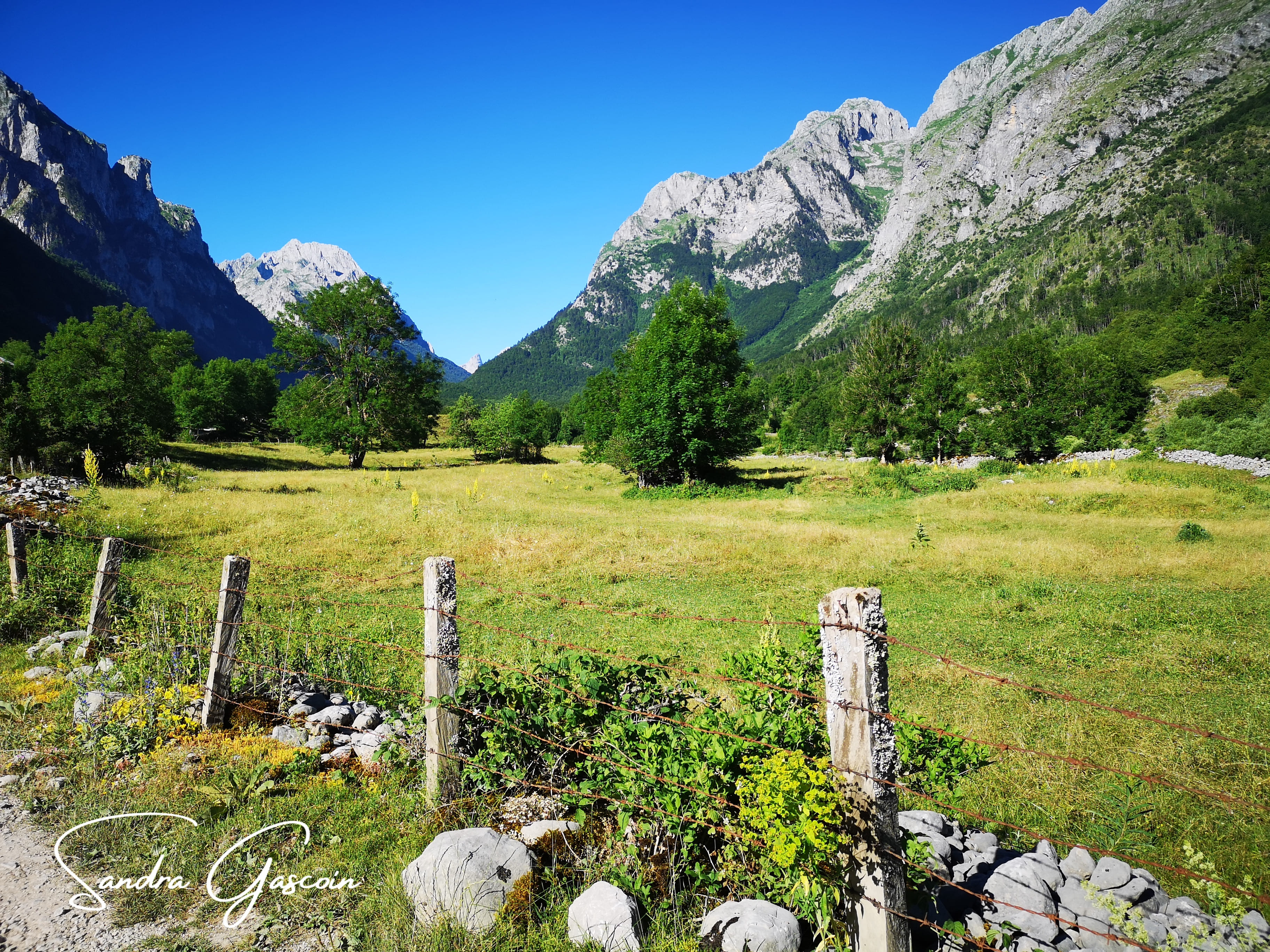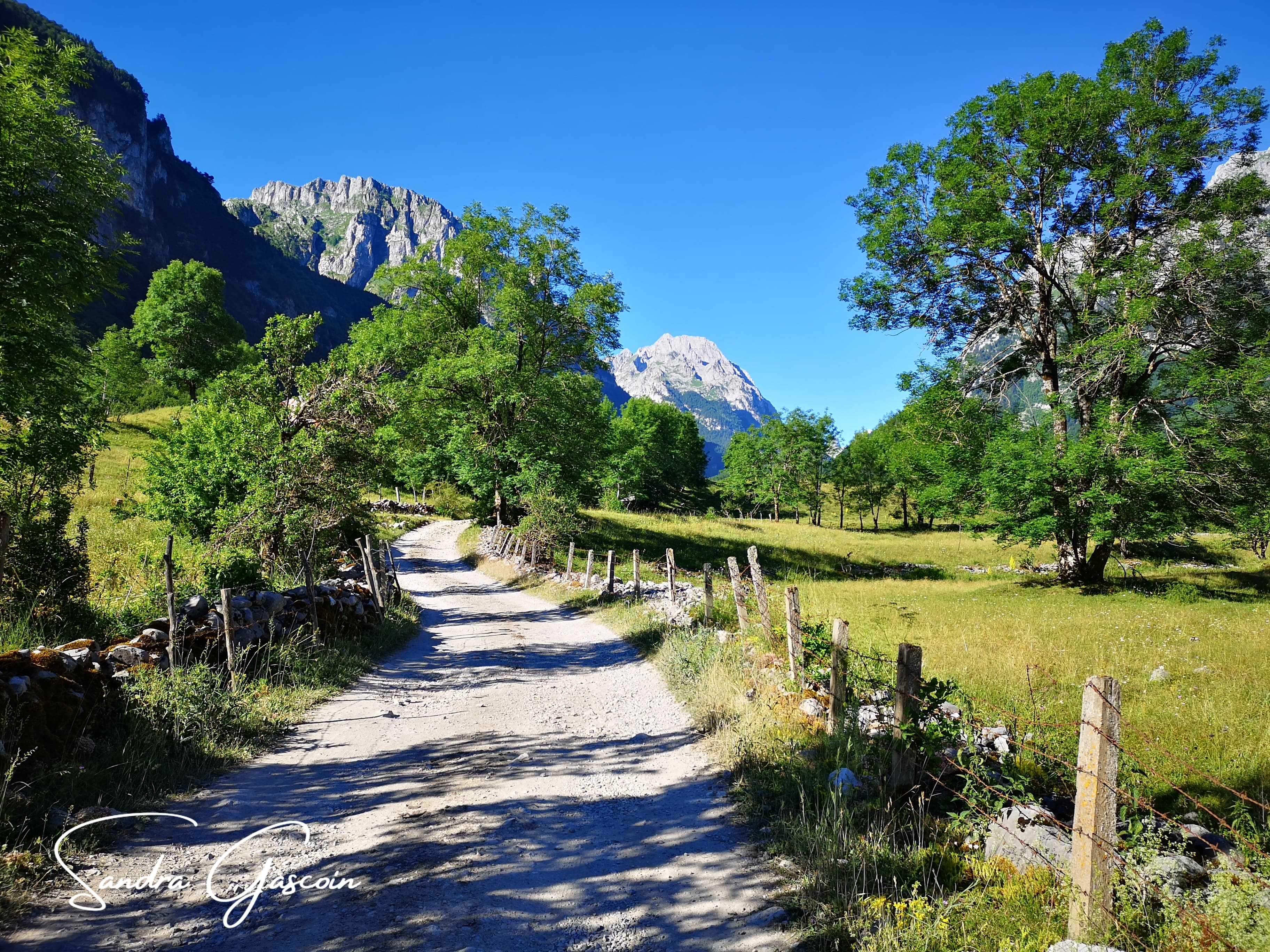 La vallée de Theth, bien que pittoresque, m’impressionne moins que celle que je viens de quitter. Le soleil inonde ses montagnes couvertes de forêts tandis que la soif devient oppressante. Je laisse derrière moi mes compagnons de route et dévale les lacets du sentier avec célérité. Au premier café rencontré, je m’accorde un soda glacé. L’endroit est prisé : tous semblent partager la même envie de fraîcheur. Ragaillardie, je repars, dépassant bientôt les Belges qui viennent d’arriver. Sur le bord du chemin, un ruisseau cristallin m’invite à une halte. À l’ombre des arbres, je m’asperge en sous-vêtements, savourant le contact vivifiant de l’eau glacée. Avec la chaleur accablante—le thermomètre affichant trente degrés à Theth—les risques d’insolation sont réels.