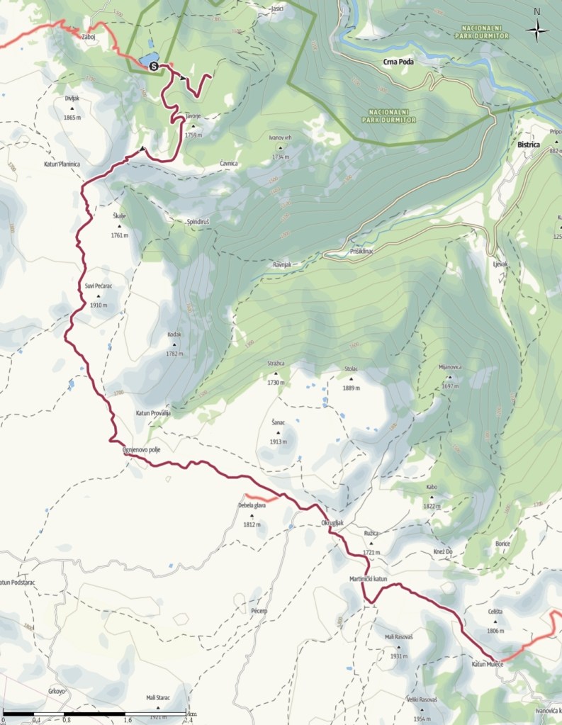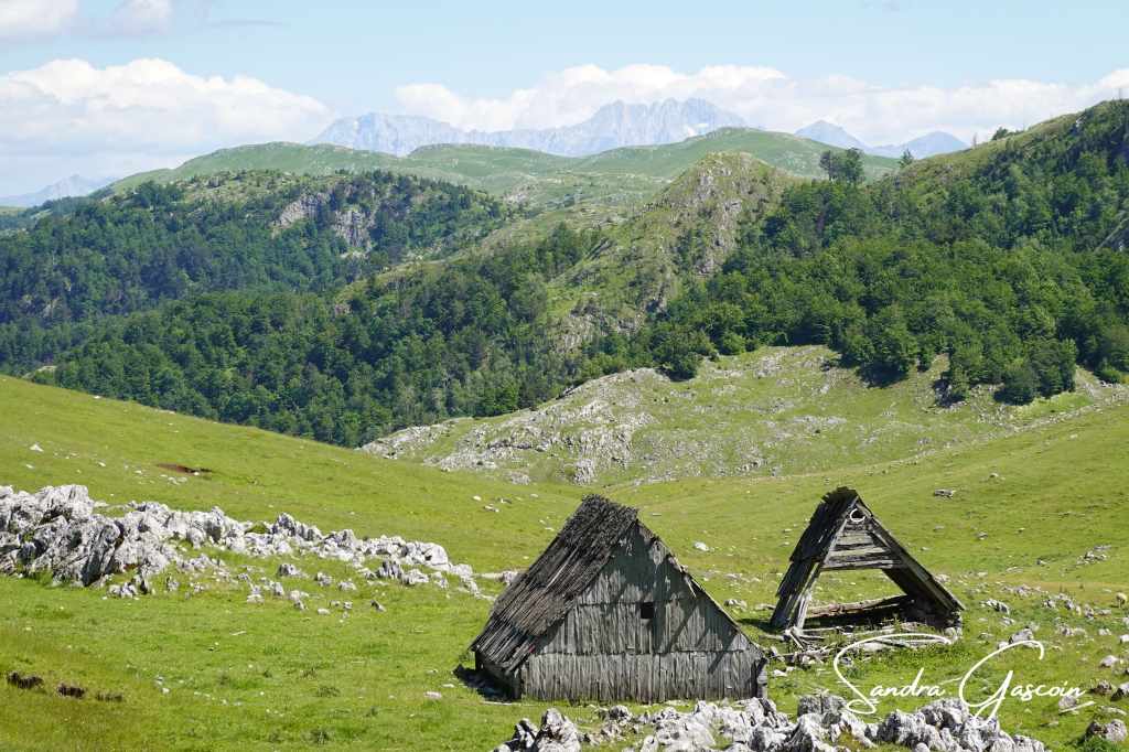 J’atteins enfin Katun Mulece où je prévois de me ravitailler en eau. Une voiture s’arrête à mon niveau et son conducteur me propose spontanément de m’emmener à Mojkovac. La proposition tombe à point nommé : il est déjà près de quinze heures, et il me reste plus de quinze kilomètres à parcourir à pied pour rejoindre la ville et refaire mes provisions. Redoutant la fermeture des commerces demain dimanche, j’accepte ce taxi providenciel. Je fourre mon gros sac et mes bâtons à l’arrière et je monte à l’avant. Mon chauffeur, un monsieur d’un âge avancé, ne parle pas anglais. La conversation se limite donc à des interjections par rapport à l’état catastrophique de la piste. Je m’aperçois en consultant mon GPS qu’il emprunte une autre route que ce que je pensais. Après quelques secondes de surprise, je me dis que de toute façon, tous les chemins mènent à Rome. Il me montre en face les sommets du Parc National Biogradska Gora en me les nommant. Ce n’est qu’en consultant mon application que je percute qu’il énumère les hauts sommets en monténégrin.