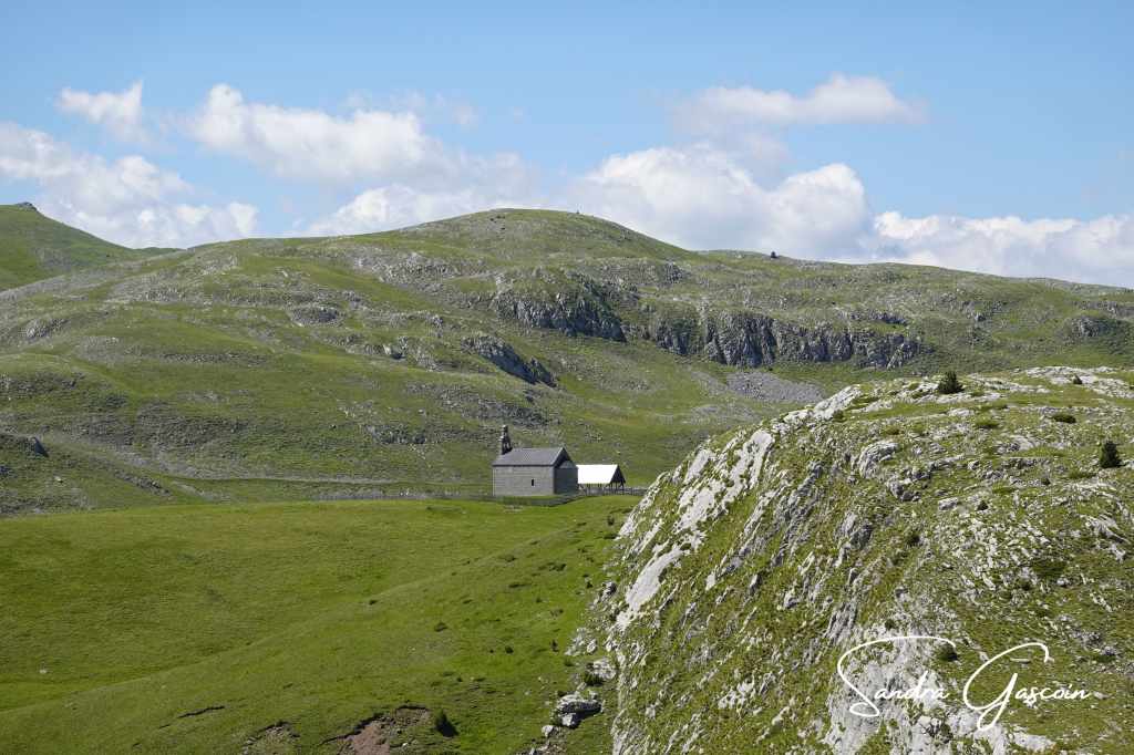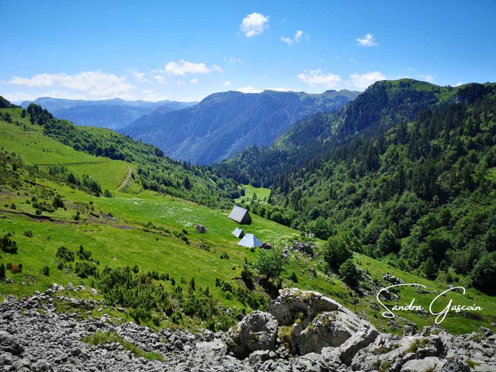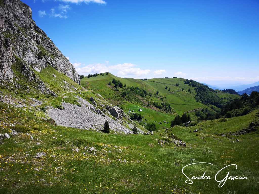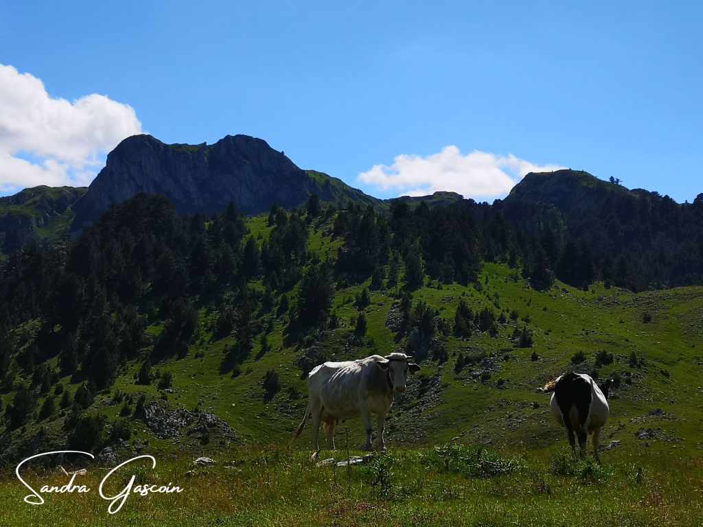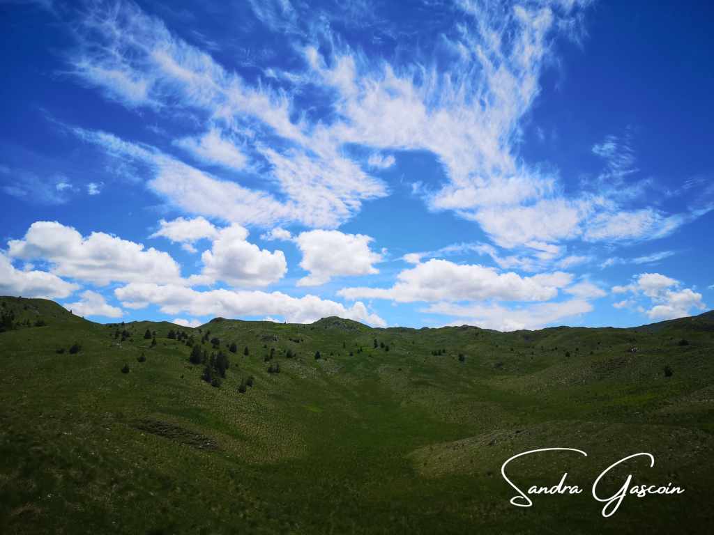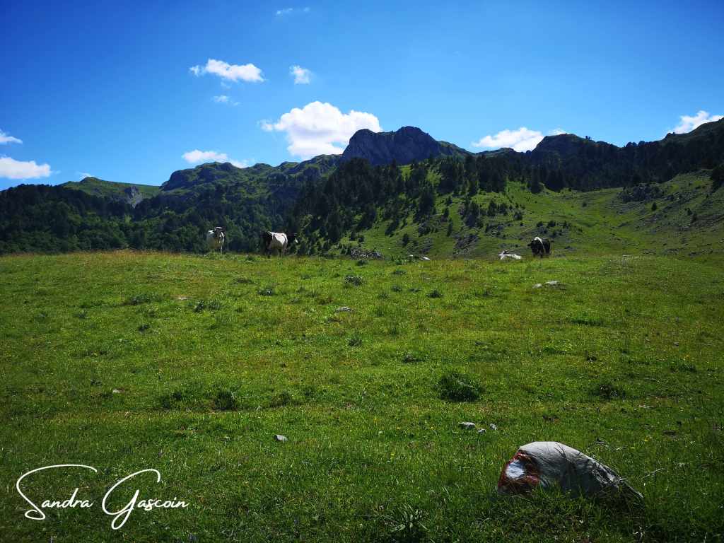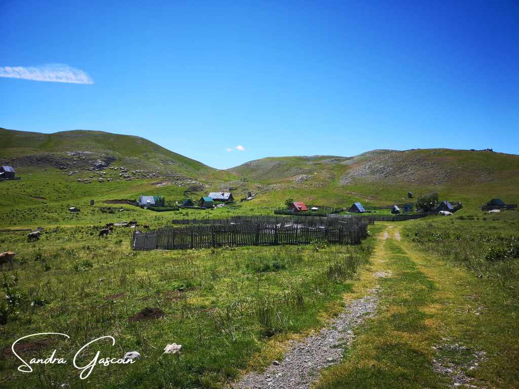 Beaucoup plus tard que ce que j’avais calculé, je rejoins enfin une piste qui me mène à proximité de hameaux ou de fermes. L’ambiance change radicalement : les troupeaux accompagnés de leurs bergers et de leurs chiens, arpentent les espaces à la recherche d’herbe fraiche. Les moutons, pressés les uns contre les autres, broutent avec frénésie, tandis que les vaches plus contemplatives relèvent la tête sur mon passage.