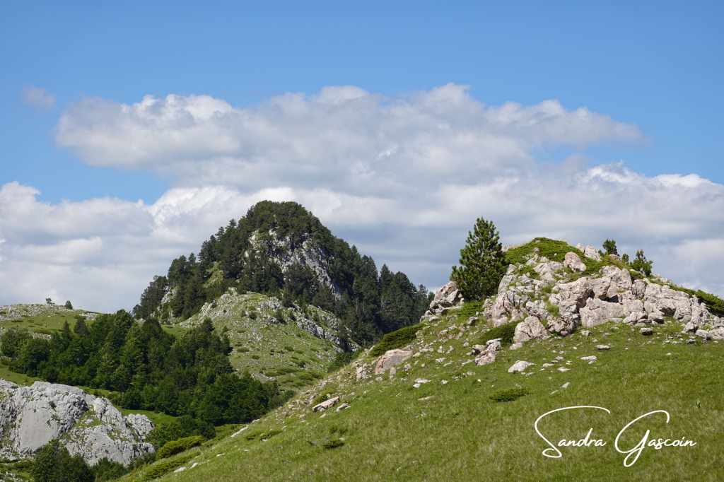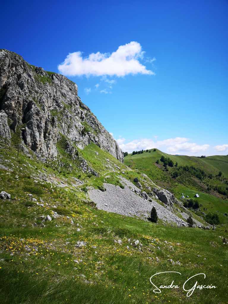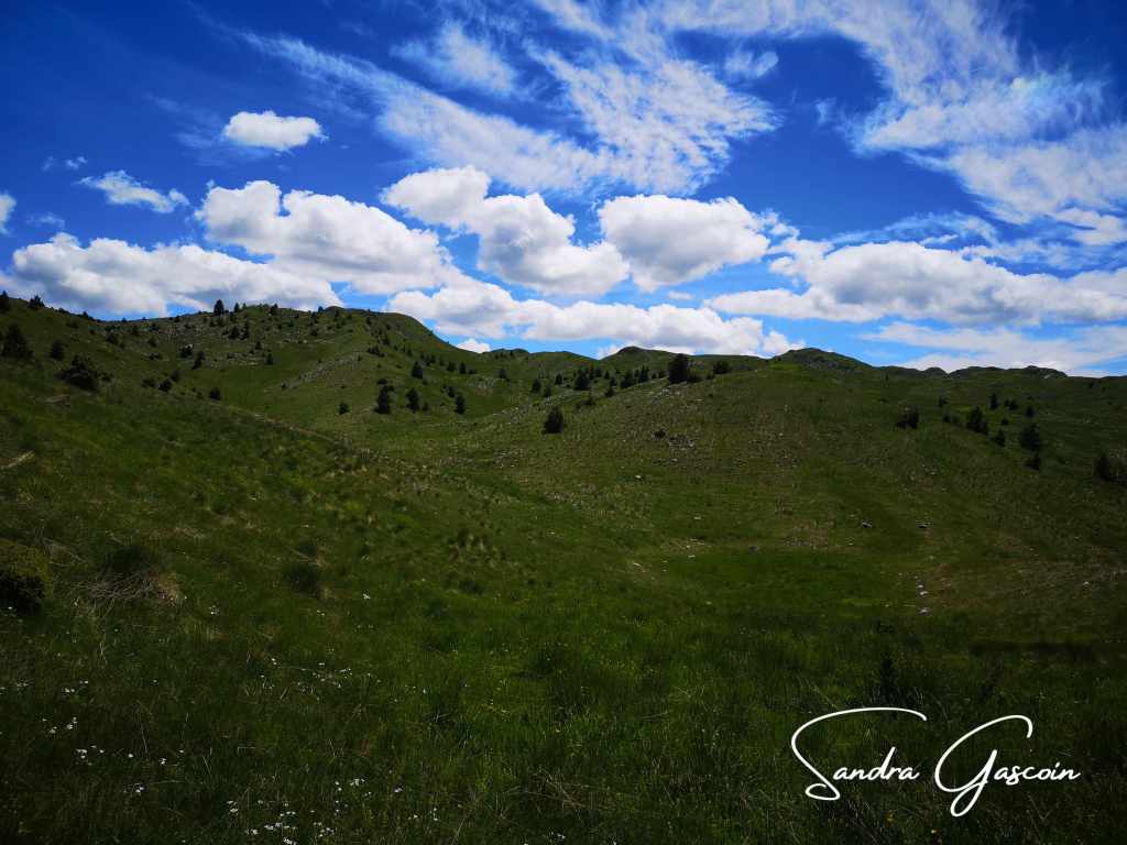 Arrivée à une bifurcation, je consulte mon application, perplexe face à l’absence de balisage. Mon GPS s’affole, incapable de me situer précisément. L’indécision me gagne. Je choisis d’explorer le chemin de gauche, espérant qu’il soit le bon. Après cinq cents mètres, mon GPS m’informe de mon erreur. Je rebrousse chemin, retraversant les passages boueux et glissants. Je prends l’autre direction. L’histoire se répète à un nouvel embranchement : toujours cette incertitude technologique qui vient saper mon plaisir. Exaspérée, je décide de suivre les traces laissées par un tracteur à travers une prairie. Je grimpe ensuite à même la colline pour retrouver la Via Dinarica.