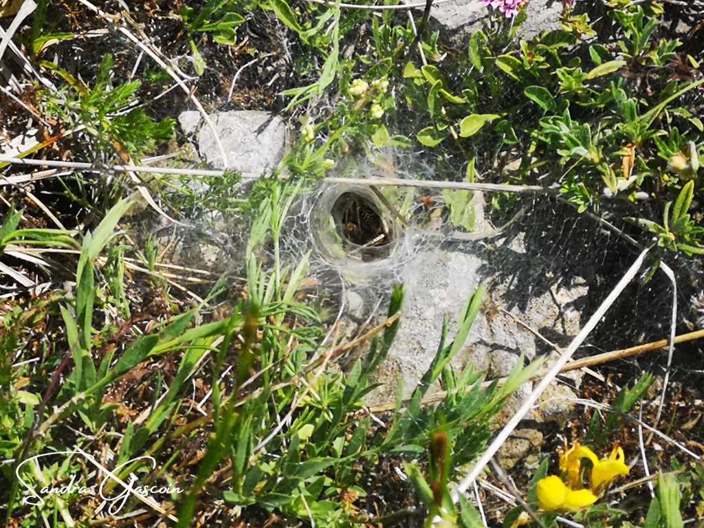 Je suis enfin sortie de la forêt, mon regard s’étend à perte de vue. J’arpente à nouveau des collines nues, les arbres se font rares. Le sentier est visible la majeure partie du temps, je ne lutte que par endroits. Je découvre au sol des nids d’araignée. Elles se cachent au fond. Autour de l’entrée, elles ont construit une structure en forme d’entonnoir en toile épaisse. J’en découvre partout, je suis contrainte de les piétiner quand le sentier a disparu. Je ne distingue pas ces minuscules araignées, des agélènes à labyrinthe; à mieux y regarder, je découvre par centaines ces toiles tapissant la prairie sèche.