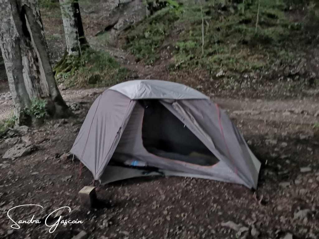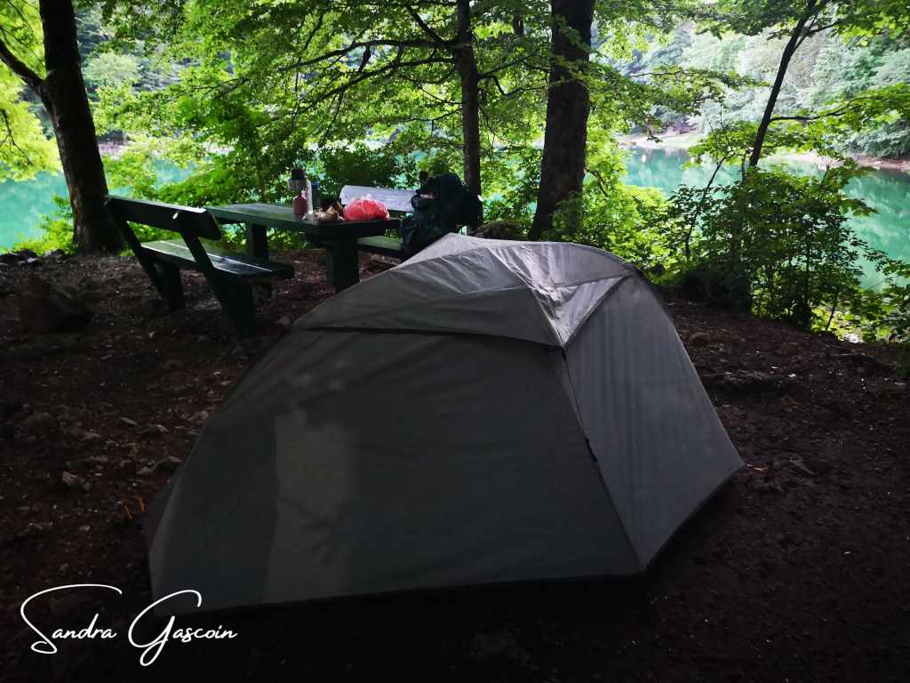 Évitant l’aire de bivouac trop animée et bruyante, je choisis un emplacement à côté d’un abri touristique sur la rive du lac. C’est certes le long du chemin mais j’espère être à l’abri de ce gars s’il devait revenir. Avant que l’obscurité ne m’engloutisse, je contemple les dernières lueurs du soleil couchant sur le Biogradsko Jezero. La musique retentit depuis l’aire de pique-nique, perturbant l’harmonie de ce sanctuaire naturel. Je ne conçois pas de venir dans un parc national pour y diffuser de la musique à plein volume. Pour moi, être en pleine nature, c’est entrer en harmonie avec elle, s’immerger dans ses sons, ses couleurs, ses parfums, observer la faune et la flore. Pas m’en priver sous un déluge sonore assourdissant. Heureusement, le silence retombe à vingt heures, et je savoure enfin un moment de quiétude face aux eaux sombres du lac, bercé par le murmure nocturne de la forêt.