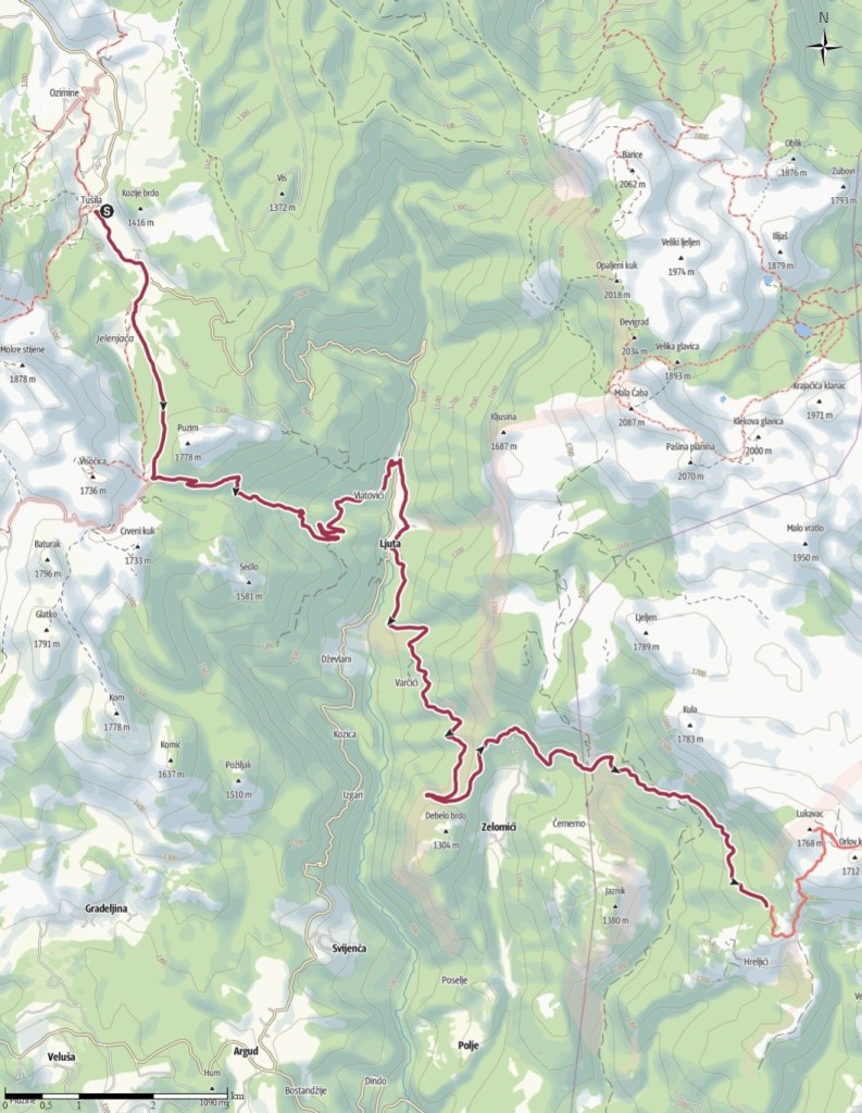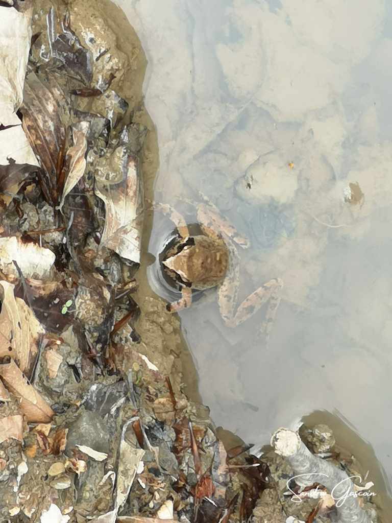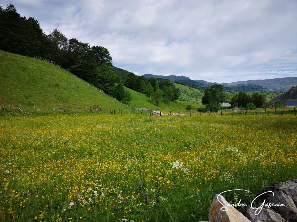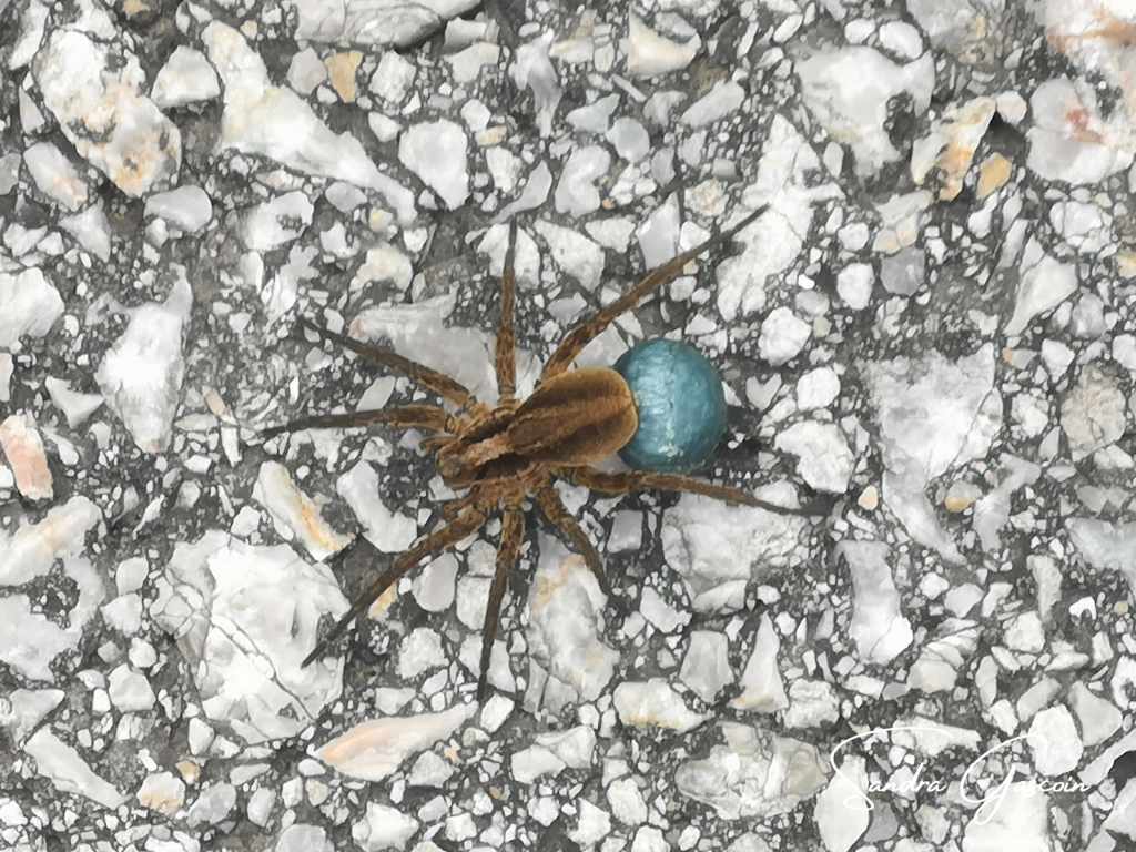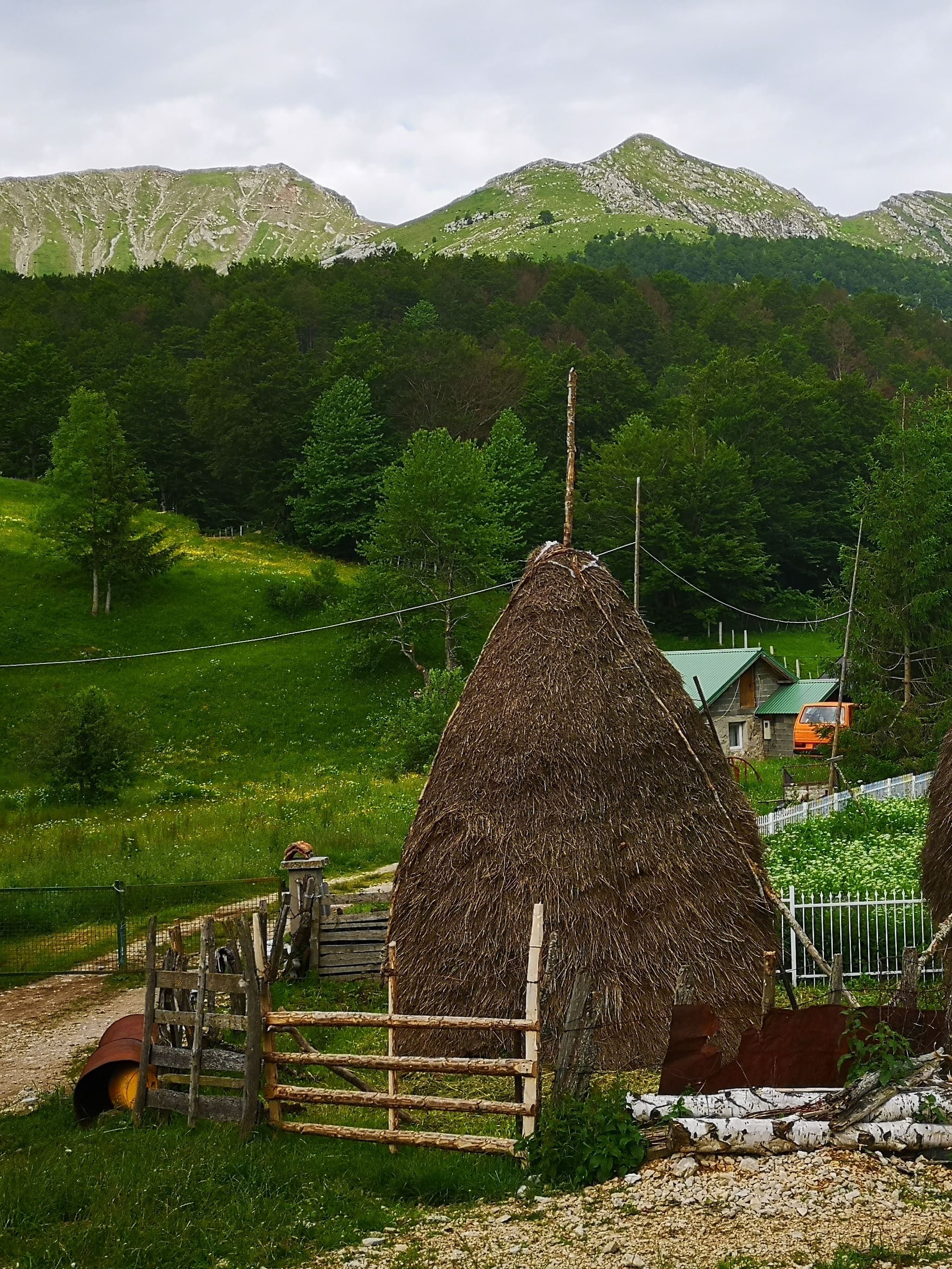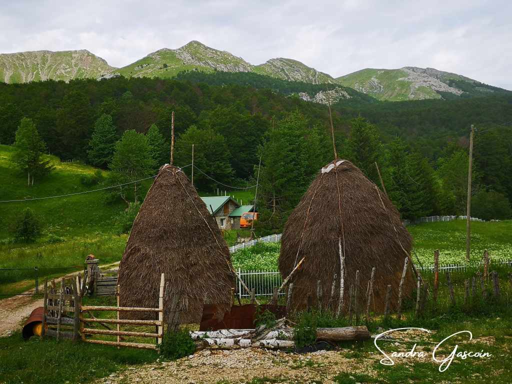 Les fermes se succèdent, les cochons pataugent dans la boue, les séchoirs trônent au bord des champs, les pâturages verdoyants fleurissent, tout est calme. Je découvre presque sous mes pieds une étrange araignée avec une boule bleue à l’arrière. C’est la première fois que je vois ça. Il s’agit d’une araignée lycose : elle porte un cocon bleu contenant ses œufs. La Via Dinarica continue sur la Bjelašnička transverzala, une route totalement déserte jusqu’à l’embranchement qui me ramène au cœur de la forêt. Des camions s’affairent et descendent la piste forestière que j’emprunte aussi, laissant des ornières énormes dans la terre imbibée des récentes pluies. La piste défoncée descend de manière assez raide par endroit, c’est à se demander comment les véhicules forestiers peuvent la monter ou la descendre ! Au milieu des bruits de la forêt, je perçois les grognements d’un animal plus gros, un chevreuil ou un sanglier ? Je ne distingue rien. Je marche sous le couvert des arbres, où les vues sont limitées, je me divertis en observant la vie qui grouille à mes pieds. Dans les mares éphémères formées sur la piste, je repère des grenouilles et des têtards léthargiques.