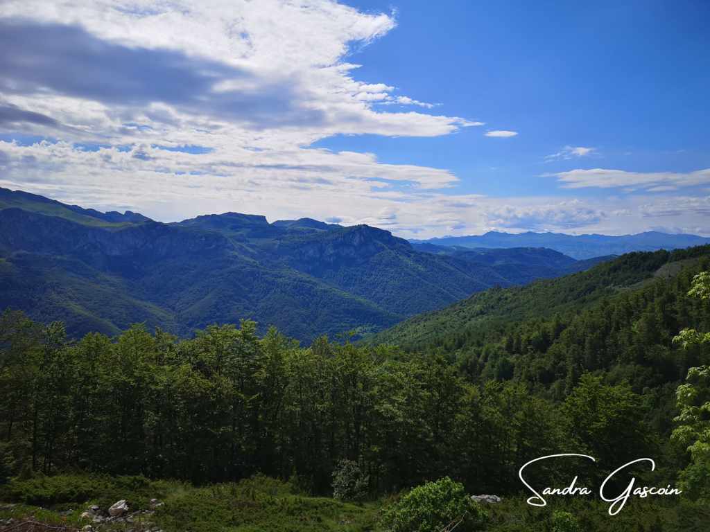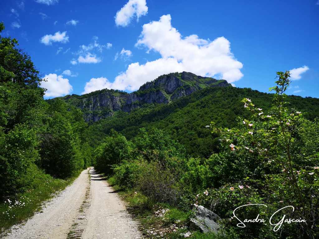 Le reste du chemin est une piste bien entretenue et agréable. Je fais halte près d’une autre fontaine. Un banc invite au repos. Je me fais un thé chaud, j’observe une chenille qui essaie de me grimper dessus. Je l’aide à faire son premier vol plané, elle reprend son exploration plus loin comme si de rien n’était.