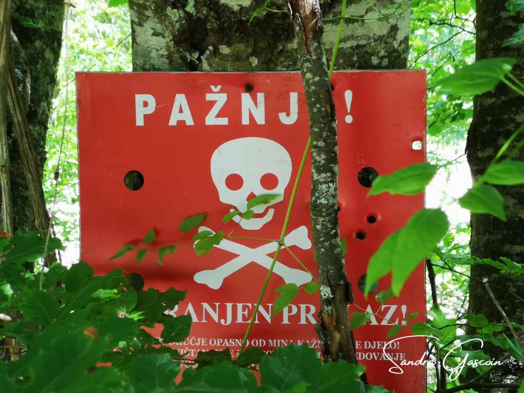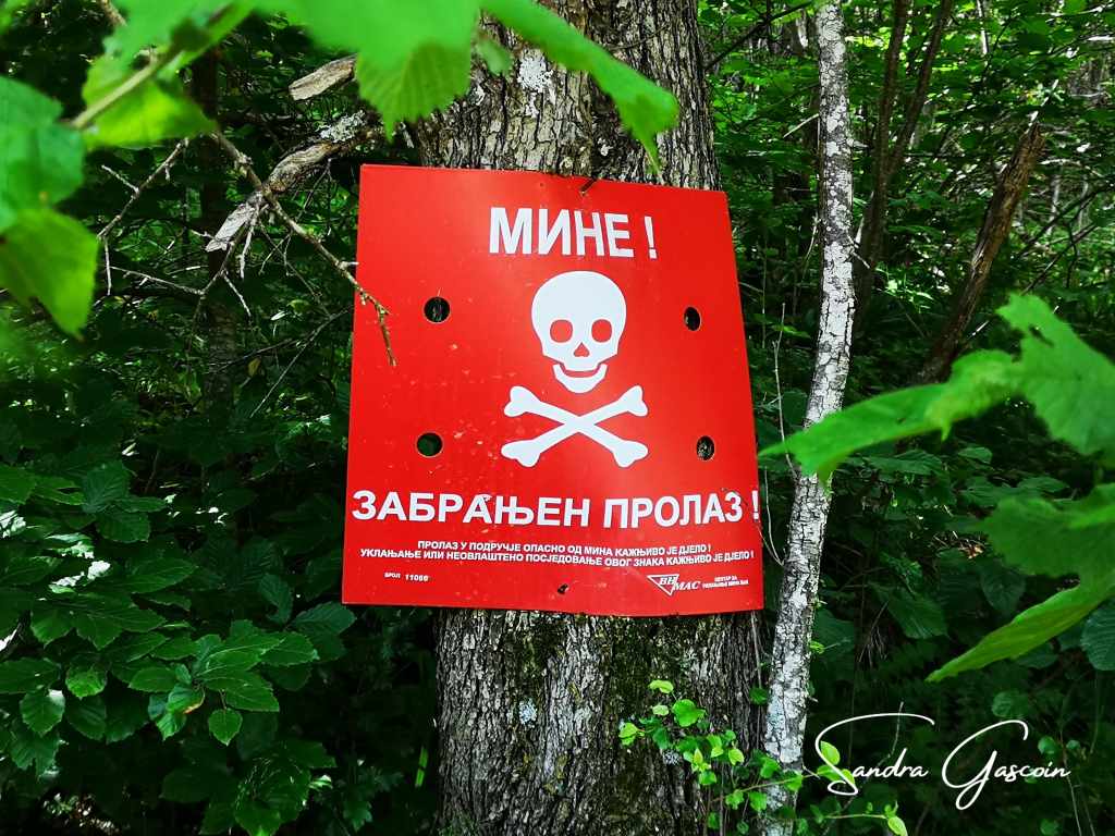 Tout au long du trajet, les panneaux rouges signalent toujours la présence de mines. Ces vestiges du conflit armé entre 1992 et 1995 lorsque Serbes, Croates et Bosniaques de Bosnie-Herzégovine se sont affrontés, rappellent le danger qui persiste encore aujourd’hui. Des mines antipersonnel le long des lignes d’affrontement pendant la guerre infestent encore ces zones. Elles ont été bannies et interdites depuis le traité d’Ottawa en 1997. Cette convention internationale en interdit l’acquisition, la production, le stockage et l’utilisation. Elle est entrée en vigueur dans les pays l’ayant signée et acceptée. Malgré les efforts de déminage, il reste encore d’immense zones contaminées, notamment en milieu rural. La zone autour de Sarajevo a été déclarée déminée totalement au 1er septembre 2021 ! Malheureusement, le délai imparti pour nettoyer le pays, fixé à juin 2020, a dû, faute de moyens suffisants, être repoussé à mars 2027. Environ 800 kilomètres carrés restent encore à déminer ! Outre le danger qu’elles représentent pour la population, elles sont également un frein à l’expansion de l’activité agricole ou l’élevage. Finalement les populations rurales, les plus pauvres, sont encore plus pénalisées. Cela montre les effets à long terme des conflits armés. Même s’ils sont terminés, en plus des traumatismes, des pertes et des deuils, ils sont toujours présents matériellement dans les pays les ayant subis. À Berlin, des bombes de la seconde guerre mondiale sont régulièrement découvertes lors de travaux de construction. Le quartier est évacué le temps de l’intervention des démineurs. C’est un événement récurrent, presque banal. Mais grâce aux moyens mis en place, la sécurité reste assurée pour tous.