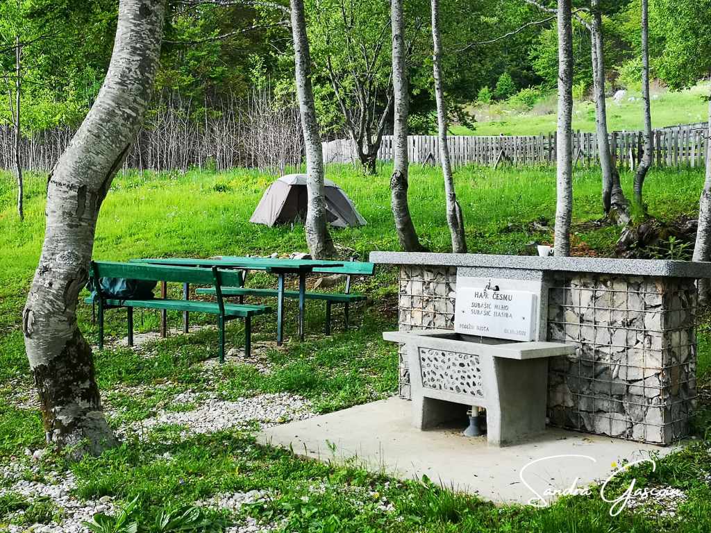 Je passe devant des parcelles de forêt brûlées, où les arbres dénudés exhibent des troncs calcinés. Juste après je trouve une aire de pique-nique avec une fontaine, des tables et un espace presque plat pour ma tente. C’est à côté d’un champ clôturé, j’espère que le bivouac est toléré. Je n’ai pas monté la tente trop tôt, car déjà, la pluie commence à tomber.